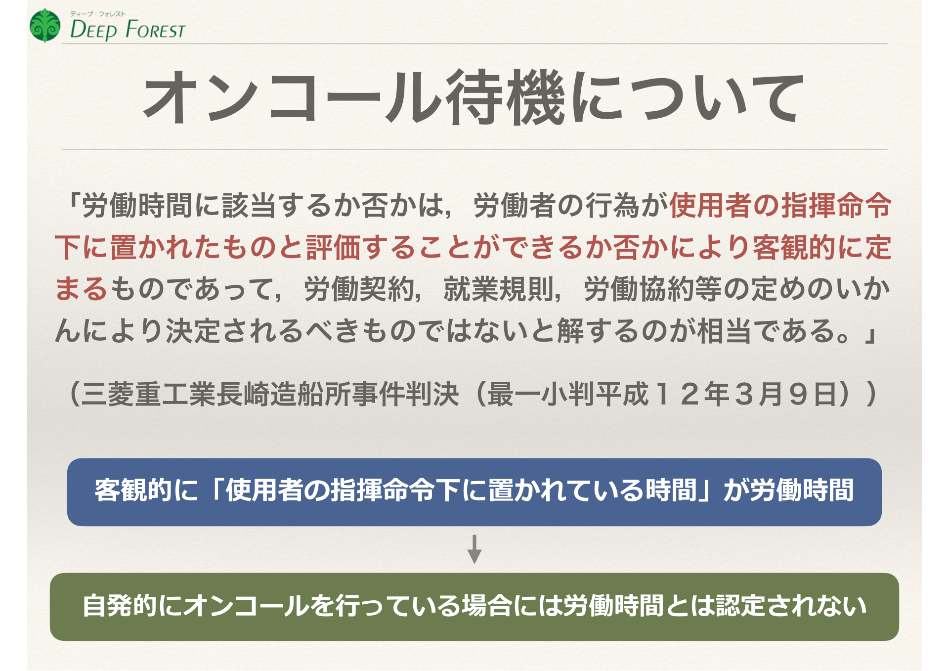 オンコール待機について 「労働時間に該当するか否かは,労働者の行為が使用者の指揮命令 下に置かれたものと評価することができるか否かにより客観的に定 まるものであって,労働契約,就業規則,労働協約等の定めのいか んにより決定されるべきものではないと解するのが相当である。」 (三菱重工業長崎造船所事件判決(最一小判平成12年3月9日)) 客観的に「使⽤者の指揮命令下に置かれている時間」が労働時間 ⾃発的にオンコールを⾏っている場合には労働時間とは認定されない