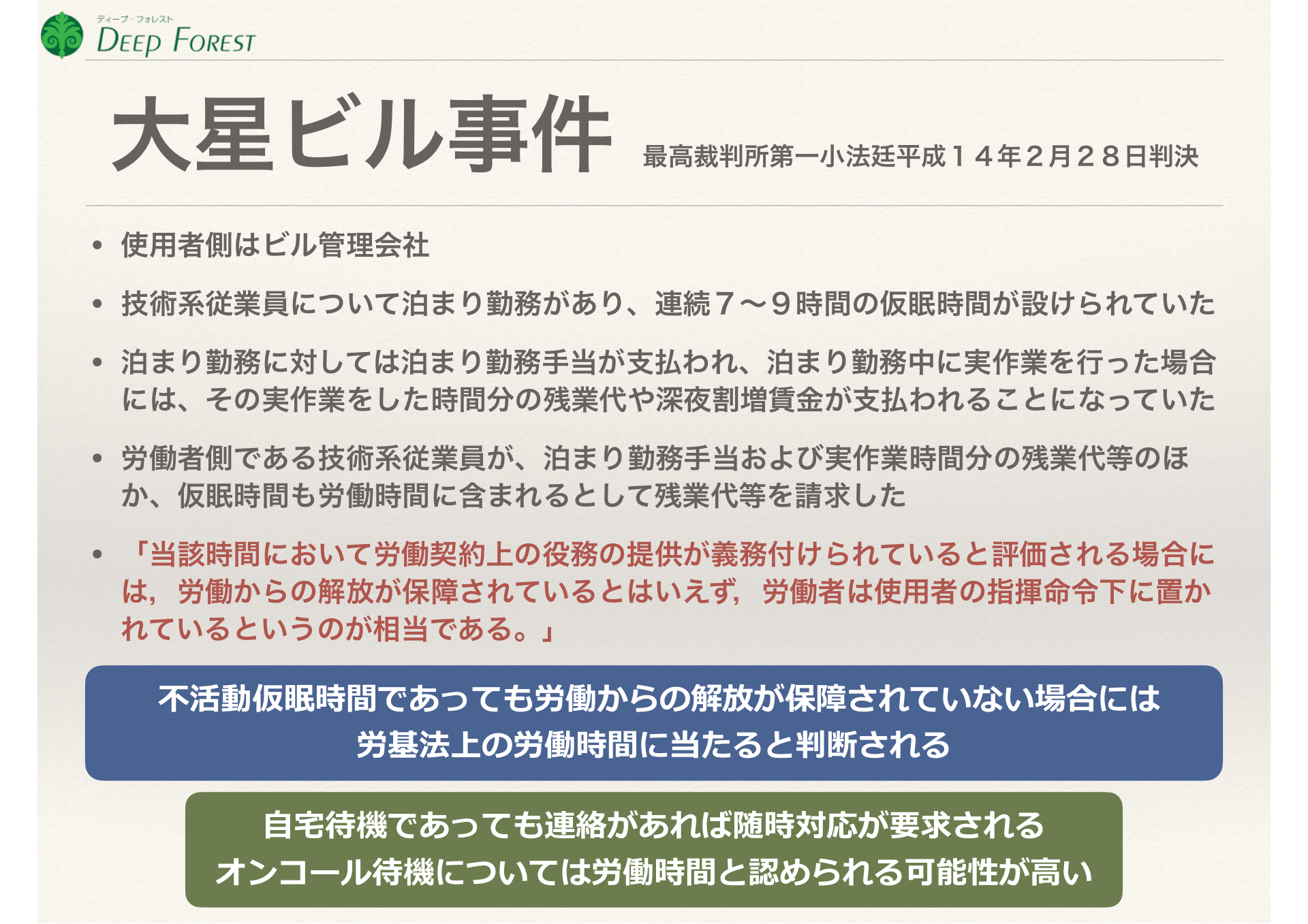 大星ビル事件 最高裁判所第一小法廷平成14年2月28日判決 • • • 使用者側はビル管理会社 • 労働者側である技術系従業員が、泊まり勤務手当および実作業時間分の残業代等のほ か、仮眠時間も労働時間に含まれるとして残業代等を請求した • 「当該時間において労働契約上の役務の提供が義務付けられていると評価される場合に は,労働からの解放が保障されているとはいえず,労働者は使用者の指揮命令下に置か れているというのが相当である。」 技術系従業員について泊まり勤務があり、連続7〜9時間の仮眠時間が設けられていた 泊まり勤務に対しては泊まり勤務手当が支払われ、泊まり勤務中に実作業を行った場合 には、その実作業をした時間分の残業代や深夜割増賃金が支払われることになっていた 不活動仮眠時間であっても労働からの解放が保障されていない場合には 労基法上の労働時間に当たると判断される ⾃宅待機であっても連絡があれば随時対応が要求される オンコール待機については労働時間と認められる可能性が⾼い