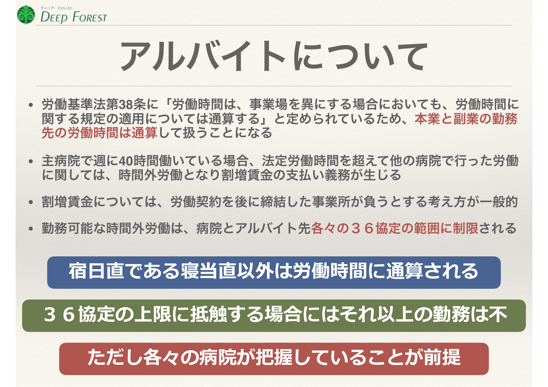 アルバイトについて • 労働基準法第38条に「労働時間は、事業場を異にする場合においても、労働時間に 関する規定の適用については通算する」と定められているため、本業と副業の勤務 先の労働時間は通算して扱うことになる • 主病院で週に40時間働いている場合、法定労働時間を超えて他の病院で行った労働 に関しては、時間外労働となり割増賃金の支払い義務が生じる • • 割増賃金については、労働契約を後に締結した事業所が負うとする考え方が一般的 勤務可能な時間外労働は、病院とアルバイト先各々の36協定の範囲に制限される 宿⽇直である寝当直以外は労働時間に通算される 36協定の上限に抵触する場合にはそれ以上の勤務は不 ただし各々の病院が把握していることが前提