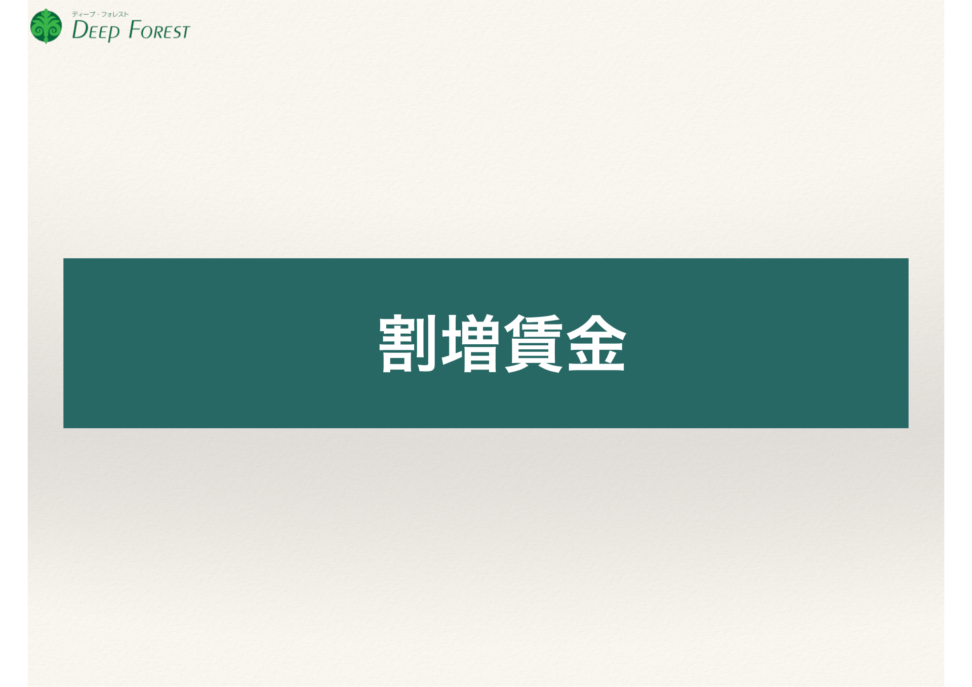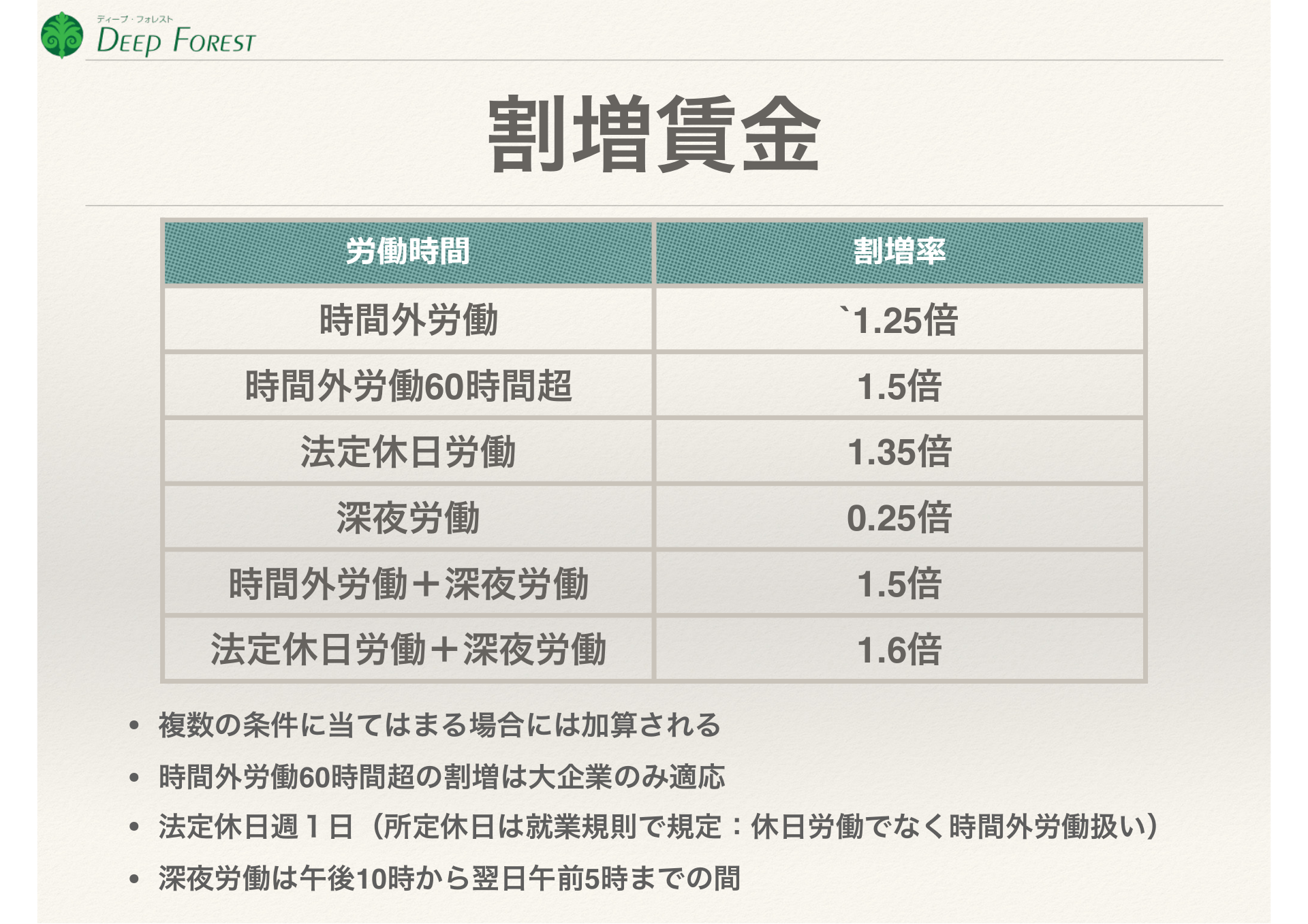 割増賃金 • • • • 労働時間 割増率 時間外労働 `1.25倍 時間外労働60時間超 1.5倍 法定休日労働 1.35倍 深夜労働 0.25倍 時間外労働+深夜労働 1.5倍 法定休日労働+深夜労働 1.6倍 複数の条件に当てはまる場合には加算される 時間外労働60時間超の割増は大企業のみ適応 法定休日週1日(所定休日は就業規則で規定:休日労働でなく時間外労働扱い) 深夜労働は午後10時から翌日午前5時までの間