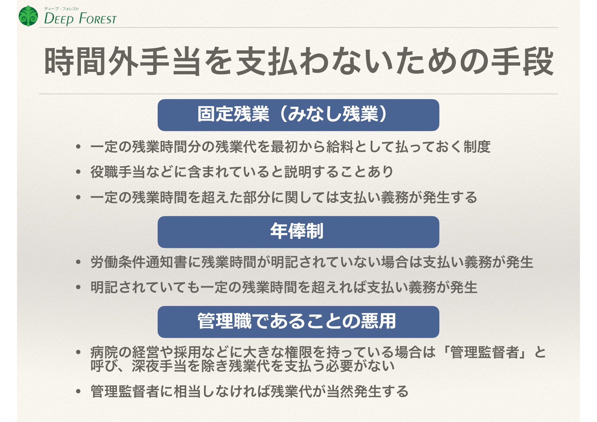 時間外手当を支払わないための手段 固定残業(みなし残業) • • • 一定の残業時間分の残業代を最初から給料として払っておく制度 役職手当などに含まれていると説明することあり 一定の残業時間を超えた部分に関しては支払い義務が発生する 年俸制 • • 労働条件通知書に残業時間が明記されていない場合は支払い義務が発生 明記されていても一定の残業時間を超えれば支払い義務が発生 管理職であることの悪⽤ • 病院の経営や採用などに大きな権限を持っている場合は「管理監督者」と 呼び、深夜手当を除き残業代を支払う必要がない • 管理監督者に相当しなければ残業代が当然発生する