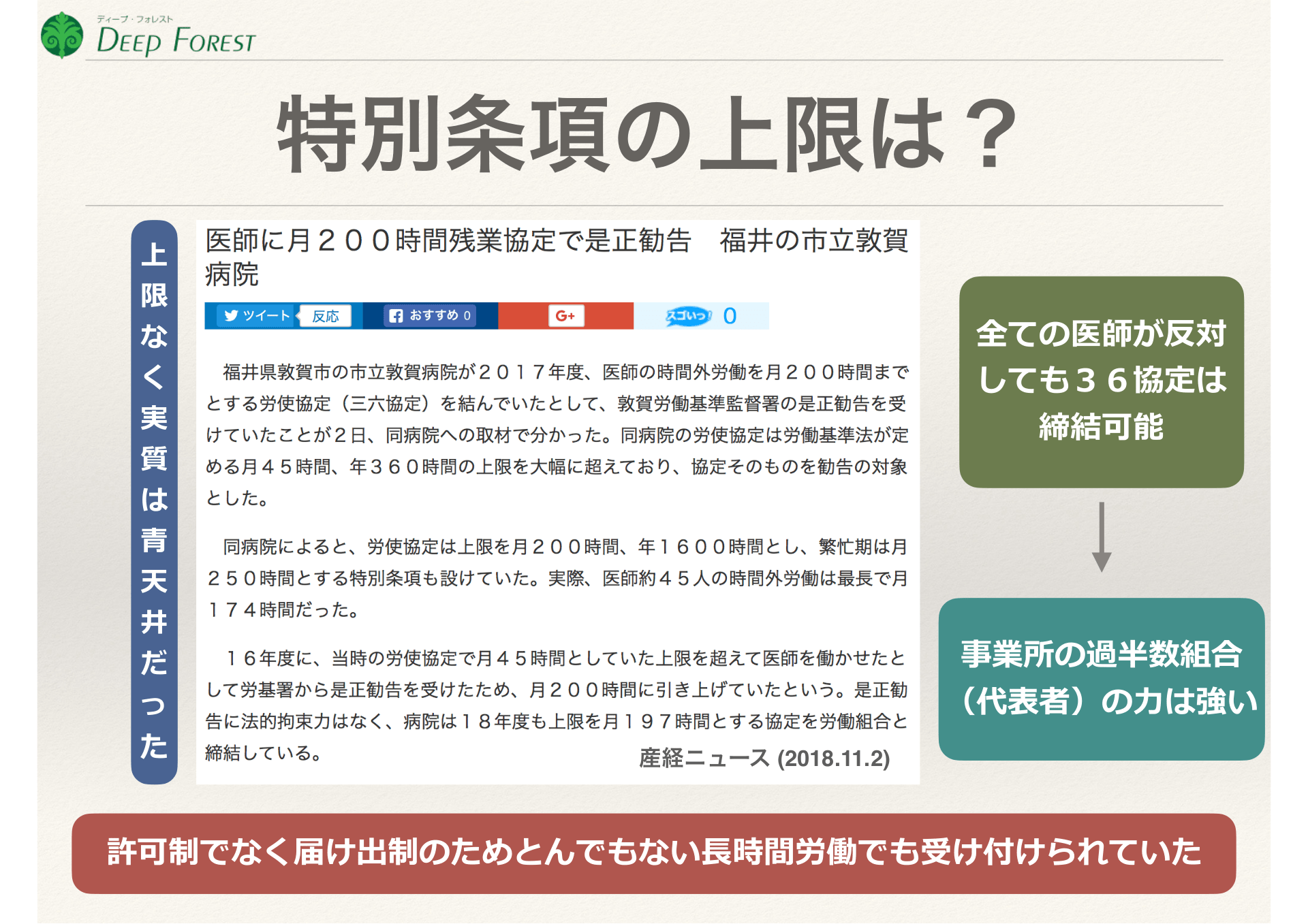 特別条項の上限は? 上 限 な く 実 質 は ⻘ 天 井 だ っ た 全ての医師が反対 しても36協定は 締結可能 事業所の過半数組合 (代表者)の⼒は強い 産経ニュース (2018.11.2) 許可制でなく届け出制のためとんでもない⻑時間労働でも受け付けられていた