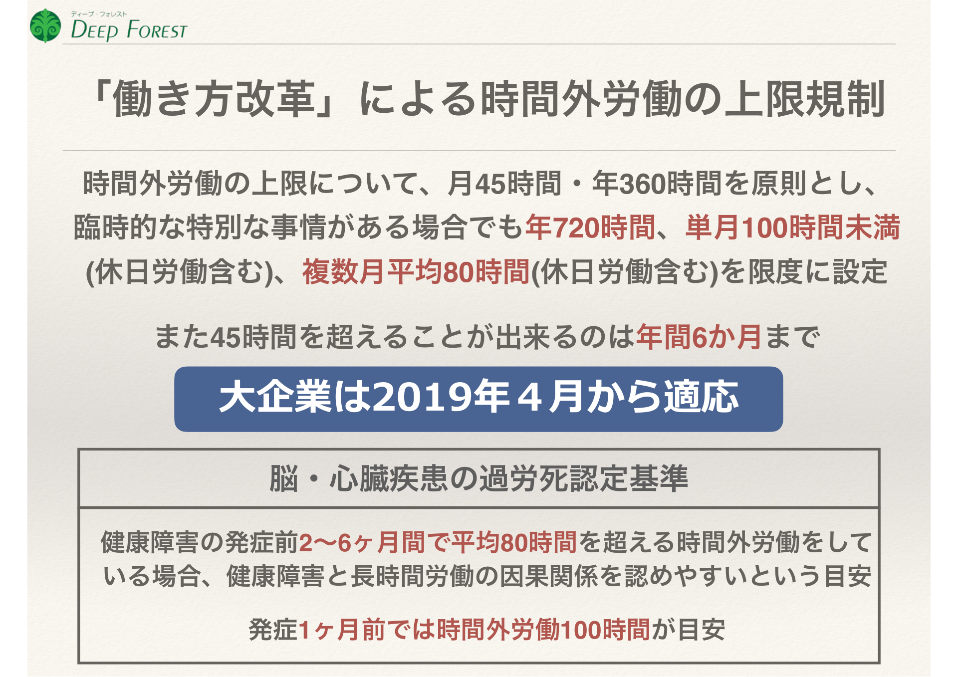 「働き方改革」による時間外労働の上限規制 時間外労働の上限について、月45時間・年360時間を原則とし、 臨時的な特別な事情がある場合でも年720時間、単月100時間未満 (休日労働含む)、複数月平均80時間(休日労働含む)を限度に設定 また45時間を超えることが出来るのは年間6か月まで ⼤企業は2019年4⽉から適応 脳・心臓疾患の過労死認定基準 健康障害の発症前2〜6ヶ月間で平均80時間を超える時間外労働をして いる場合、健康障害と長時間労働の因果関係を認めやすいという目安 発症1ヶ月前では時間外労働100時間が目安