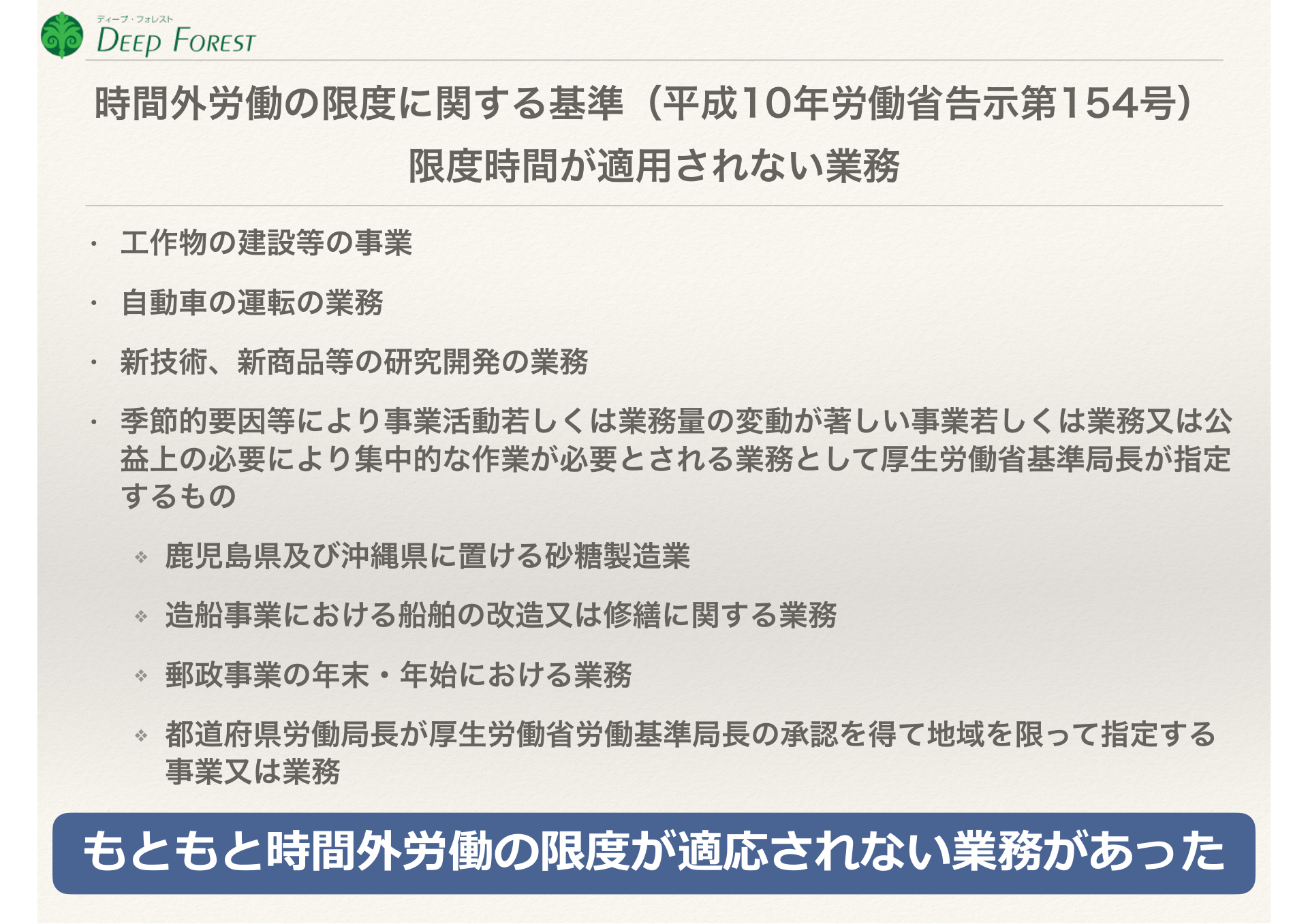 時間外労働の限度に関する基準(平成10年労働省告示第154号) 限度時間が適用されない業務 • 工作物の建設等の事業 • 自動車の運転の業務 • 新技術、新商品等の研究開発の業務 • 季節的要因等により事業活動若しくは業務量の変動が著しい事業若しくは業務又は公 益上の必要により集中的な作業が必要とされる業務として厚生労働省基準局長が指定 するもの ❖ 鹿児島県及び沖縄県に置ける砂糖製造業 ❖ 造船事業における船舶の改造又は修繕に関する業務 ❖ 郵政事業の年末・年始における業務 ❖ 都道府県労働局長が厚生労働省労働基準局長の承認を得て地域を限って指定する 事業又は業務 もともと時間外労働の限度が適応されない業務があった