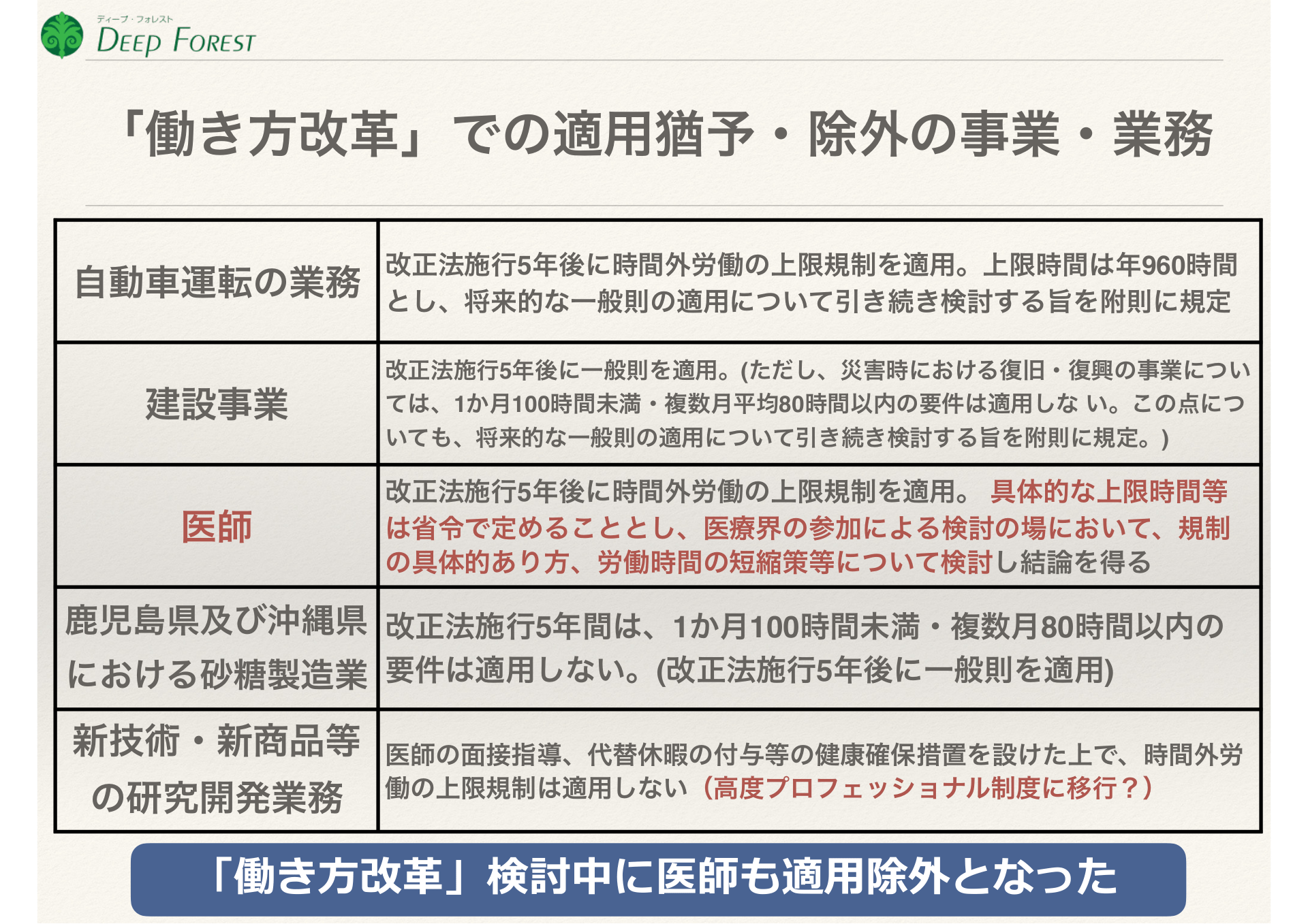 「働き方改革」での適用猶予・除外の事業・業務 自動車運転の業務 改正法施行5年後に時間外労働の上限規制を適用。上限時間は年960時間 とし、将来的な一般則の適用について引き続き検討する旨を附則に規定 建設事業 改正法施行5年後に一般則を適用。(ただし、災害時における復旧・復興の事業につい ては、1か月100時間未満・複数月平均80時間以内の要件は適用しな い。この点につ いても、将来的な一般則の適用について引き続き検討する旨を附則に規定。) 医師 改正法施行5年後に時間外労働の上限規制を適用。 具体的な上限時間等 は省令で定めることとし、医療界の参加による検討の場において、規制 の具体的あり方、労働時間の短縮策等について検討し結論を得る 鹿児島県及び沖縄県 改正法施行5年間は、1か月100時間未満・複数月80時間以内の における砂糖製造業 要件は適用しない。(改正法施行5年後に一般則を適用) 新技術・新商品等 の研究開発業務 医師の面接指導、代替休暇の付与等の健康確保措置を設けた上で、時間外労 働の上限規制は適用しない(高度プロフェッショナル制度に移行?) 「働き⽅改⾰」検討中に医師も適⽤除外となった