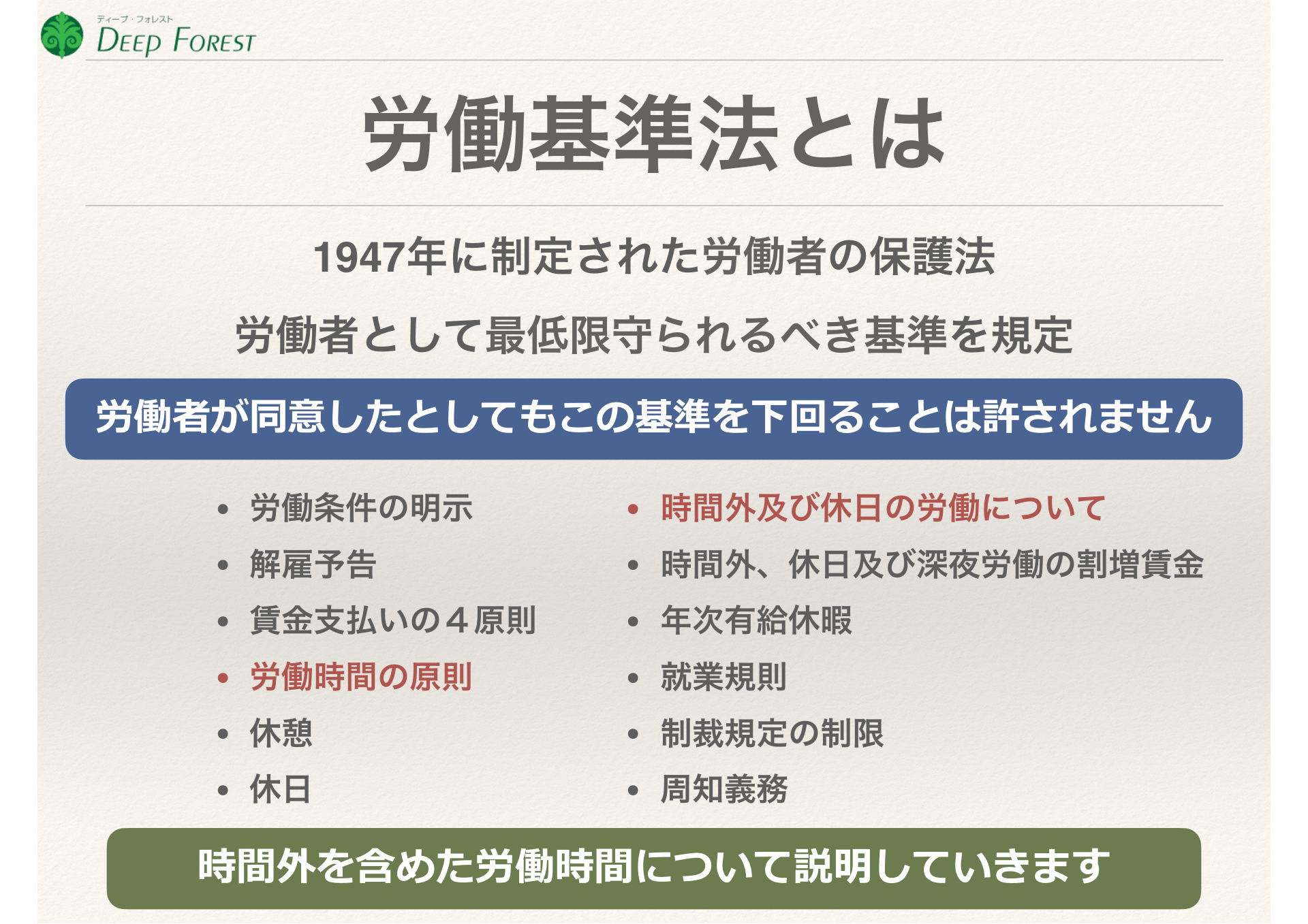 労働基準法とは 1947年に制定された労働者の保護法 労働者として最低限守られるべき基準を規定 労働者が同意したとしてもこの基準を下回ることは許されません • • • • • • 労働条件の明示 解雇予告 賃金支払いの4原則 労働時間の原則 休憩 休日 • • • • • • 時間外及び休日の労働について 時間外、休日及び深夜労働の割増賃金 年次有給休暇 就業規則 制裁規定の制限 周知義務 時間外を含めた労働時間について説明していきます