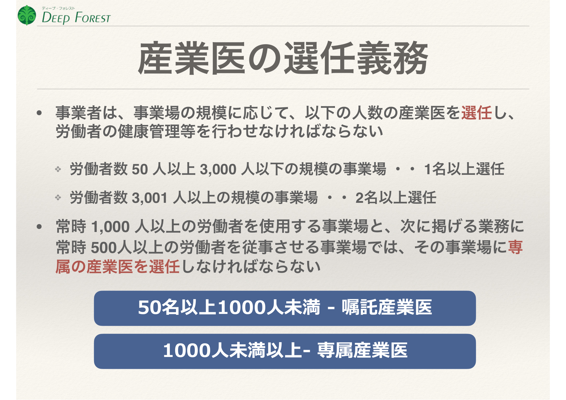 産業医の選任義務 • • 事業者は、事業場の規模に応じて、以下の人数の産業医を選任し、 労働者の健康管理等を行わせなければならない ❖ 労働者数 50 人以上 3,000 人以下の規模の事業場 ・・ 1名以上選任 ❖ 労働者数 3,001 人以上の規模の事業場 ・・ 2名以上選任 常時 1,000 人以上の労働者を使用する事業場と、次に掲げる業務に 常時 500人以上の労働者を従事させる事業場では、その事業場に専 属の産業医を選任しなければならない 50名以上1000⼈未満 - 嘱託産業医 1000⼈未満以上- 専属産業医