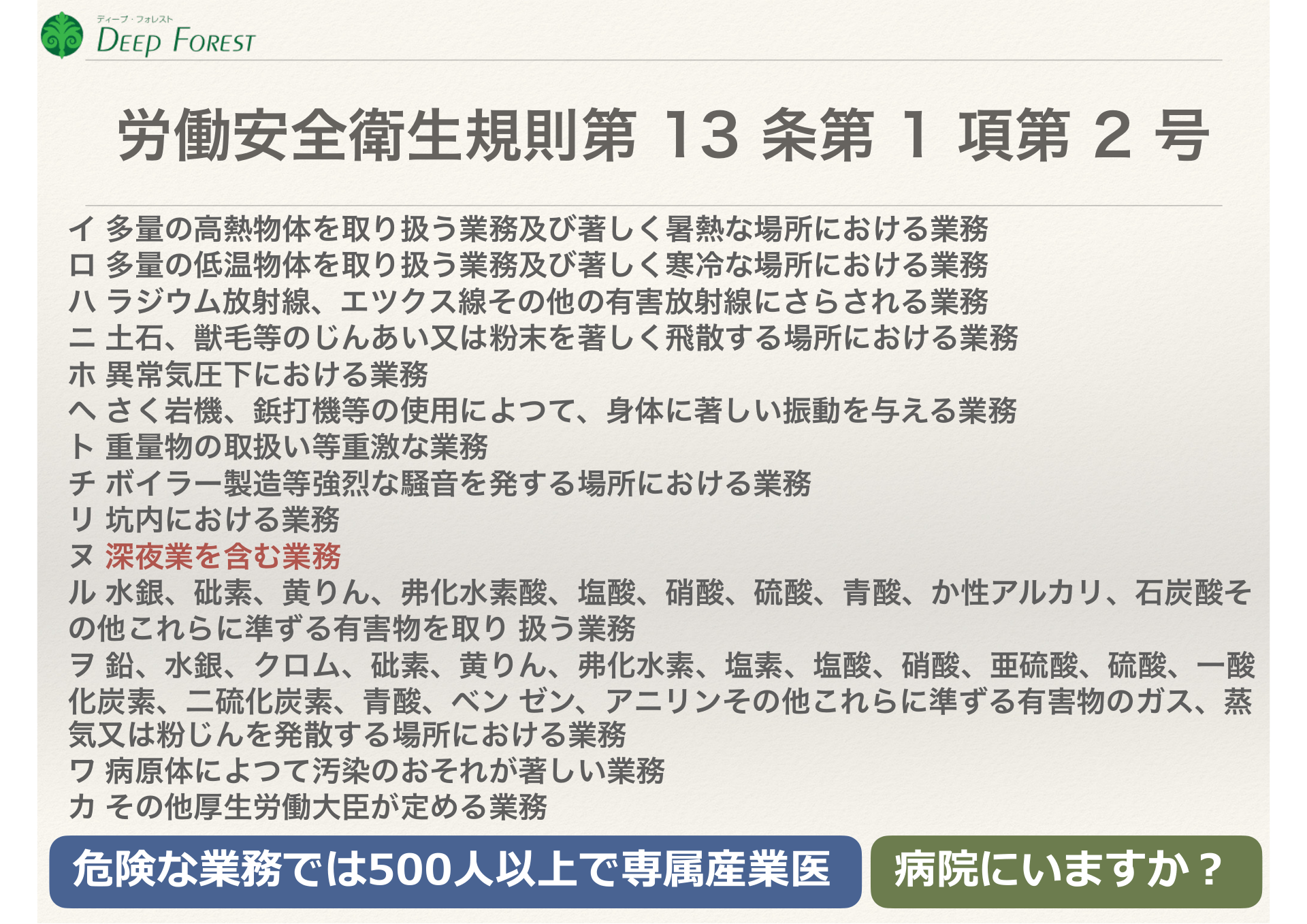 労働安全衛生規則第 13 条第 1 項第 2 号 イ 多量の高熱物体を取り扱う業務及び著しく暑熱な場所における業務 ロ 多量の低温物体を取り扱う業務及び著しく寒冷な場所における業務 ハ ラジウム放射線、エツクス線その他の有害放射線にさらされる業務 ニ 土石、獣毛等のじんあい又は粉末を著しく飛散する場所における業務 ホ 異常気圧下における業務 ヘ さく岩機、鋲打機等の使用によつて、身体に著しい振動を与える業務 ト 重量物の取扱い等重激な業務 チ ボイラー製造等強烈な騒音を発する場所における業務 リ 坑内における業務 ヌ 深夜業を含む業務 ル 水銀、砒素、黄りん、弗化水素酸、塩酸、硝酸、硫酸、青酸、か性アルカリ、石炭酸そ の他これらに準ずる有害物を取り 扱う業務 ヲ 鉛、水銀、クロム、砒素、黄りん、弗化水素、塩素、塩酸、硝酸、亜硫酸、硫酸、一酸 化炭素、二硫化炭素、青酸、ベン ゼン、アニリンその他これらに準ずる有害物のガス、蒸 気又は粉じんを発散する場所における業務 ワ 病原体によつて汚染のおそれが著しい業務 カ その他厚生労働大臣が定める業務 危険な業務では500⼈以上で専属産業医 病院にいますか?
