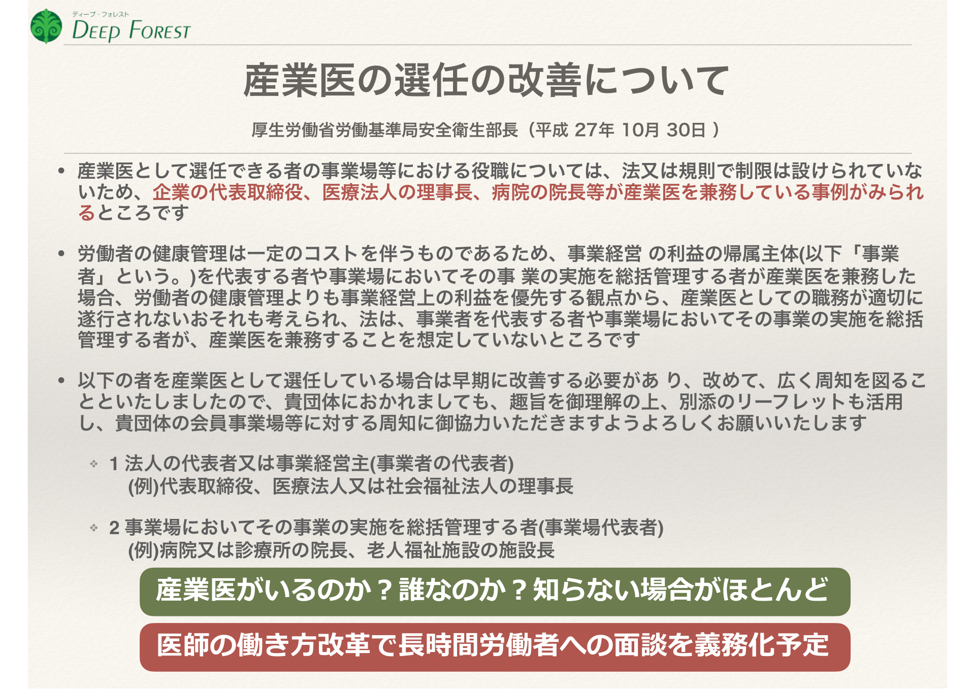 産業医の選任の改善について 厚生労働省労働基準局安全衛生部長(平成 27年 10月 30日 ) • 産業医として選任できる者の事業場等における役職については、法又は規則で制限は設けられていな いため、企業の代表取締役、医療法人の理事長、病院の院長等が産業医を兼務している事例がみられ るところです • 労働者の健康管理は一定のコストを伴うものであるため、事業経営 の利益の帰属主体(以下「事業 者」という。)を代表する者や事業場においてその事 業の実施を総括管理する者が産業医を兼務した 場合、労働者の健康管理よりも事業経営上の利益を優先する観点から、産業医としての職務が適切に 遂行されないおそれも考えられ、法は、事業者を代表する者や事業場においてその事業の実施を総括 管理する者が、産業医を兼務することを想定していないところです • 以下の者を産業医として選任している場合は早期に改善する必要があ り、改めて、広く周知を図るこ とといたしましたので、貴団体におかれましても、趣旨を御理解の上、別添のリーフレットも活用 し、貴団体の会員事業場等に対する周知に御協力いただきますようよろしくお願いいたします ❖ 1 法人の代表者又は事業経営主(事業者の代表者) (例)代表取締役、医療法人又は社会福祉法人の理事長 ❖ 2 事業場においてその事業の実施を総括管理する者(事業場代表者) (例)病院又は診療所の院長、老人福祉施設の施設長 産業医がいるのか?誰なのか?知らない場合がほとんど 医師の働き⽅改⾰で⻑時間労働者への⾯談を義務化予定