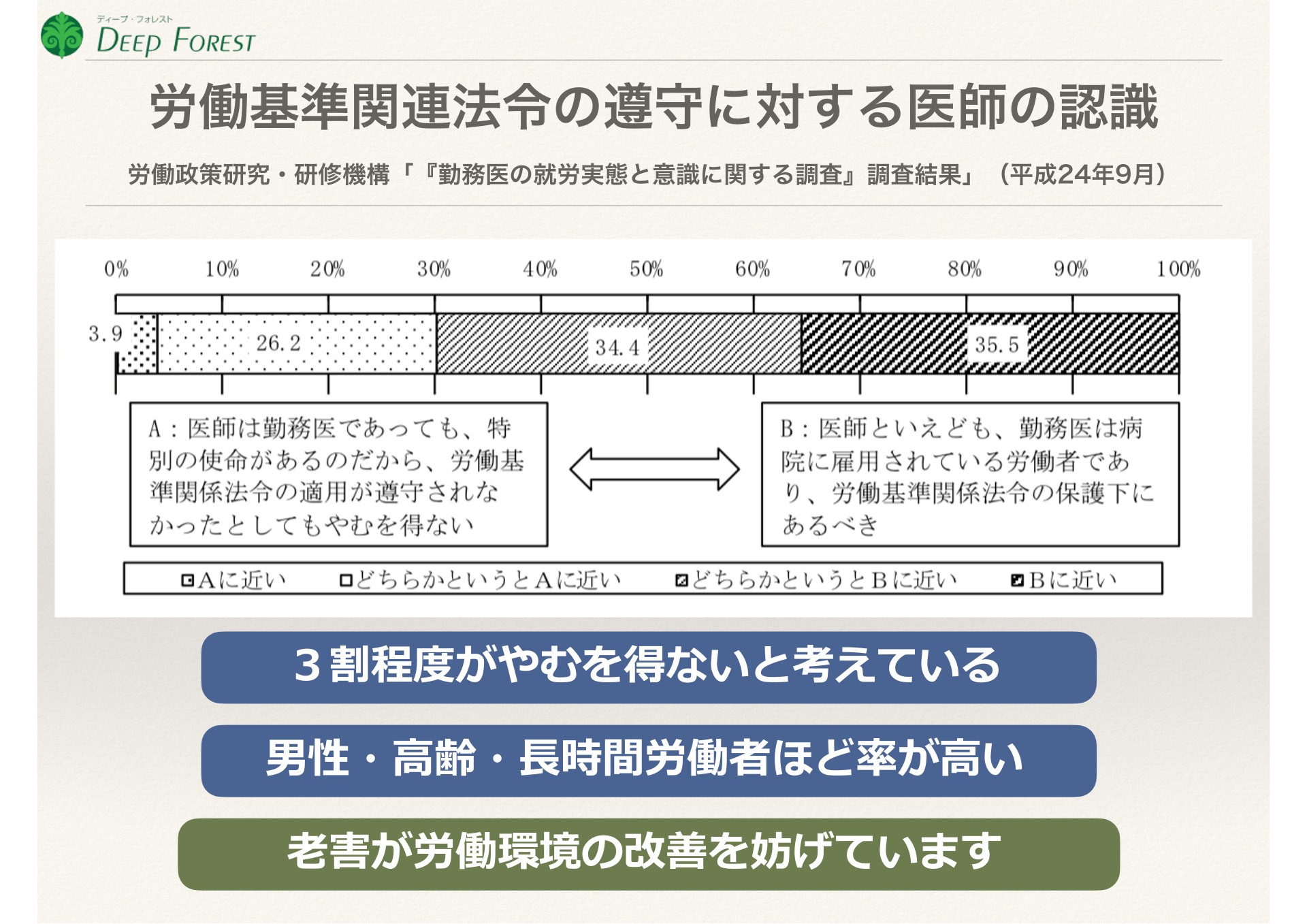 労働基準関連法令の遵守に対する医師の認識 労働政策研究・研修機構「『勤務医の就労実態と意識に関する調査』調査結果」(平成24年9月) 3割程度がやむを得ないと考えている 男性・⾼齢・⻑時間労働者ほど率が⾼い ⽼害が労働環境の改善を妨げています