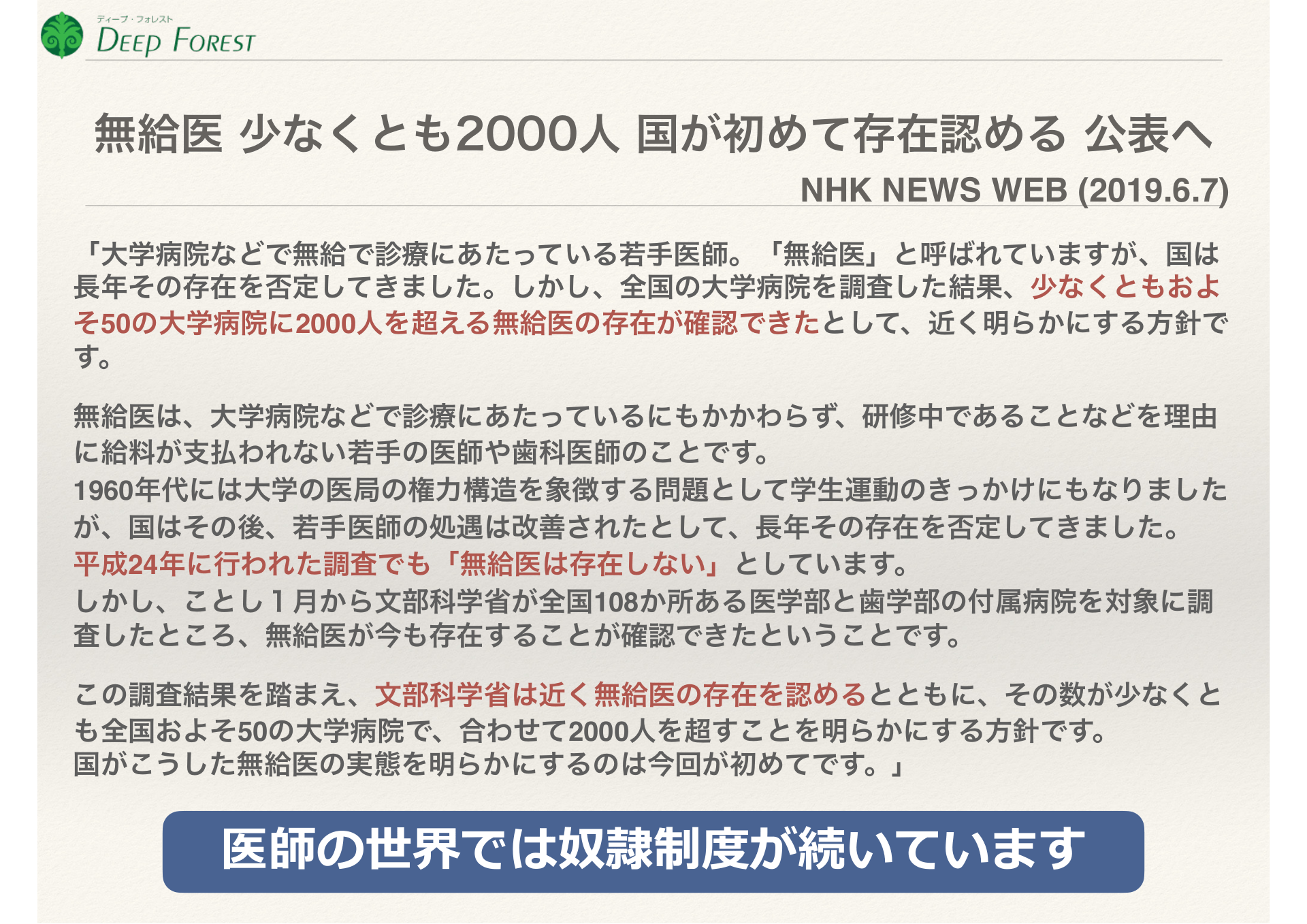無給医 少なくとも2000人 国が初めて存在認める 公表へ NHK NEWS WEB (2019.6.7) 「大学病院などで無給で診療にあたっている若手医師。「無給医」と呼ばれていますが、国は 長年その存在を否定してきました。しかし、全国の大学病院を調査した結果、少なくともおよ そ50の大学病院に2000人を超える無給医の存在が確認できたとして、近く明らかにする方針で す。 無給医は、大学病院などで診療にあたっているにもかかわらず、研修中であることなどを理由 に給料が支払われない若手の医師や歯科医師のことです。 1960年代には大学の医局の権力構造を象徴する問題として学生運動のきっかけにもなりました が、国はその後、若手医師の処遇は改善されたとして、長年その存在を否定してきました。 平成24年に行われた調査でも「無給医は存在しない」としています。 しかし、ことし1月から文部科学省が全国108か所ある医学部と歯学部の付属病院を対象に調 査したところ、無給医が今も存在することが確認できたということです。 この調査結果を踏まえ、文部科学省は近く無給医の存在を認めるとともに、その数が少なくと も全国およそ50の大学病院で、合わせて2000人を超すことを明らかにする方針です。 国がこうした無給医の実態を明らかにするのは今回が初めてです。」 医師の世界では奴隷制度が続いています