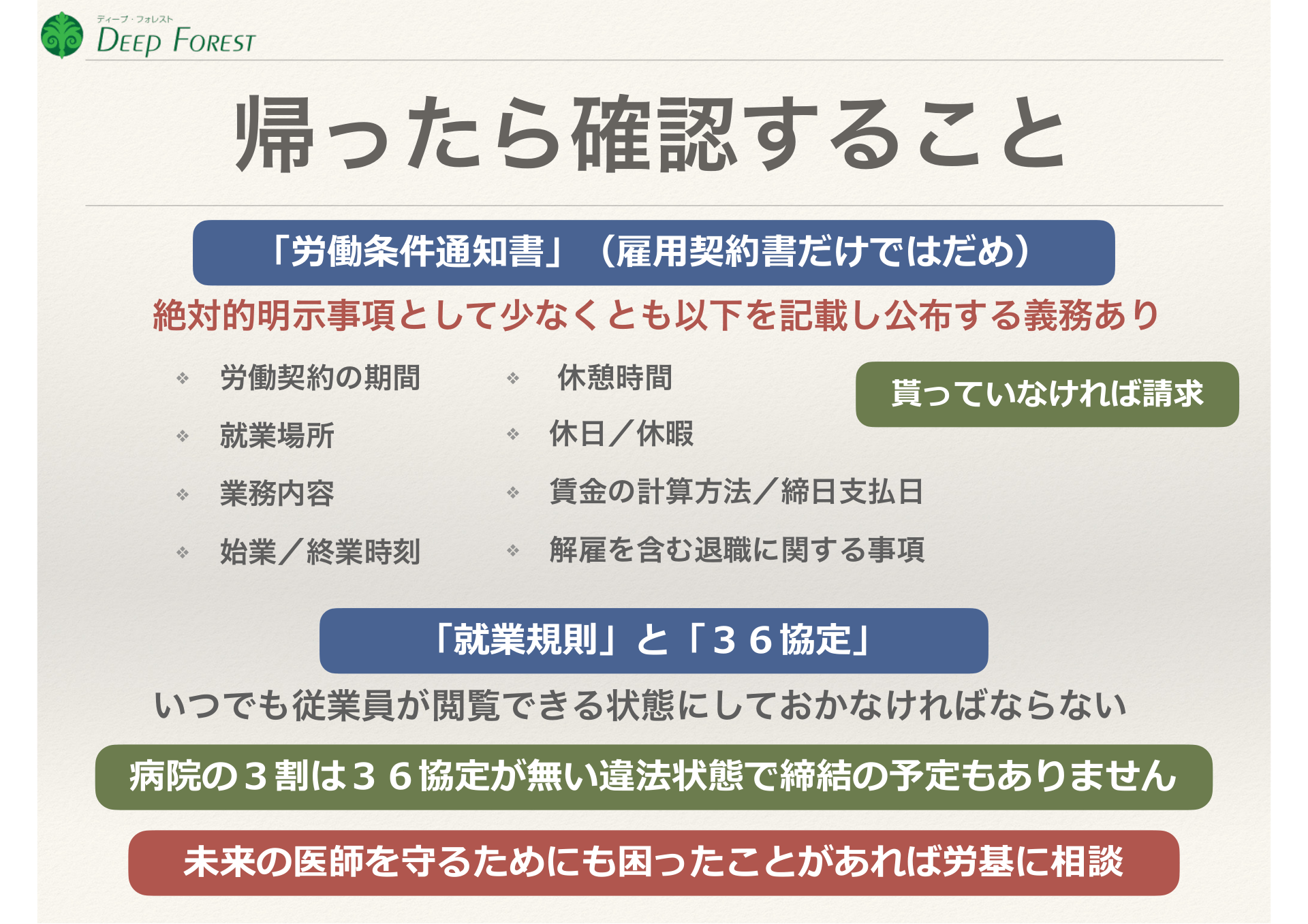 帰ったら確認すること 「労働条件通知書」(雇⽤契約書だけではだめ) 絶対的明示事項として少なくとも以下を記載し公布する義務あり ❖ 労働契約の期間 ❖ ❖ 就業場所 ❖ 休日/休暇 ❖ 業務内容 ❖ 賃金の計算方法/締日支払日 ❖ 始業/終業時刻 ❖ 解雇を含む退職に関する事項 休憩時間 貰っていなければ請求 「就業規則」と「36協定」 いつでも従業員が閲覧できる状態にしておかなければならない 病院の3割は36協定が無い違法状態で締結の予定もありません 未来の医師を守るためにも困ったことがあれば労基に相談