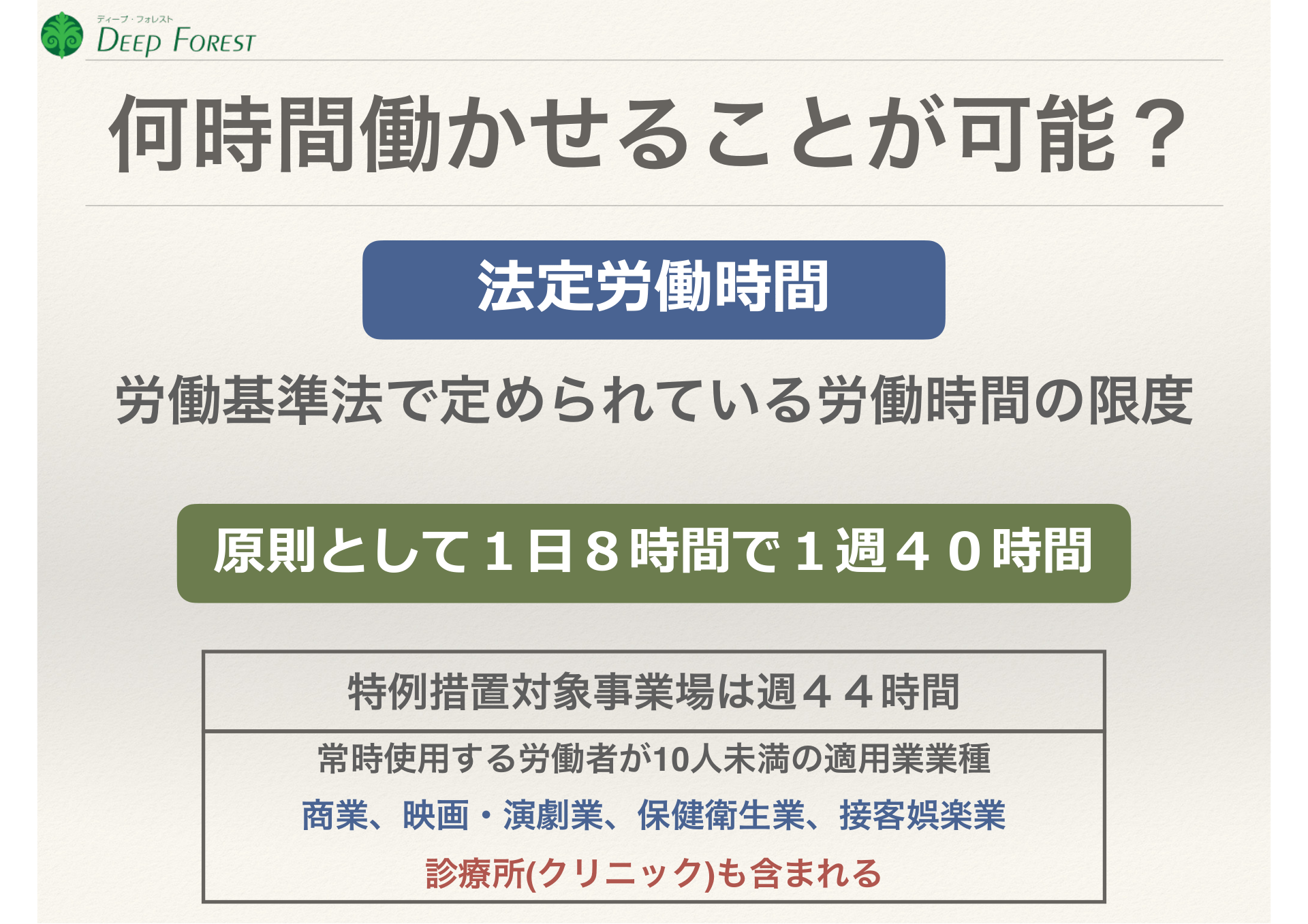 何時間働かせることが可能? 法定労働時間 労働基準法で定められている労働時間の限度 原則として1⽇8時間で1週40時間 特例措置対象事業場は週44時間 常時使用する労働者が10人未満の適用業業種 商業、映画・演劇業、保健衛生業、接客娯楽業 診療所(クリニック)も含まれる