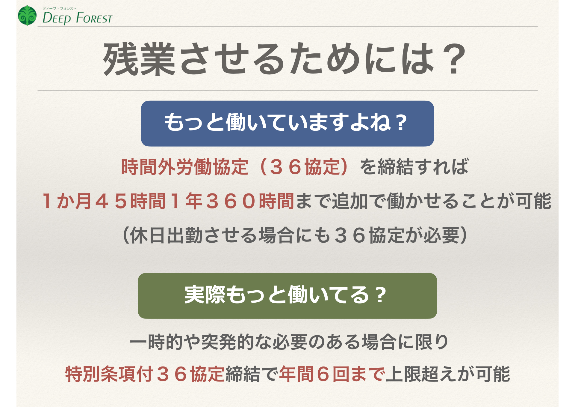 残業させるためには? もっと働いていますよね? 時間外労働協定(36協定)を締結すれば 1か月45時間1年360時間まで追加で働かせることが可能 (休日出勤させる場合にも36協定が必要) 実際もっと働いてる? 一時的や突発的な必要のある場合に限り 特別条項付36協定締結で年間6回まで上限超えが可能