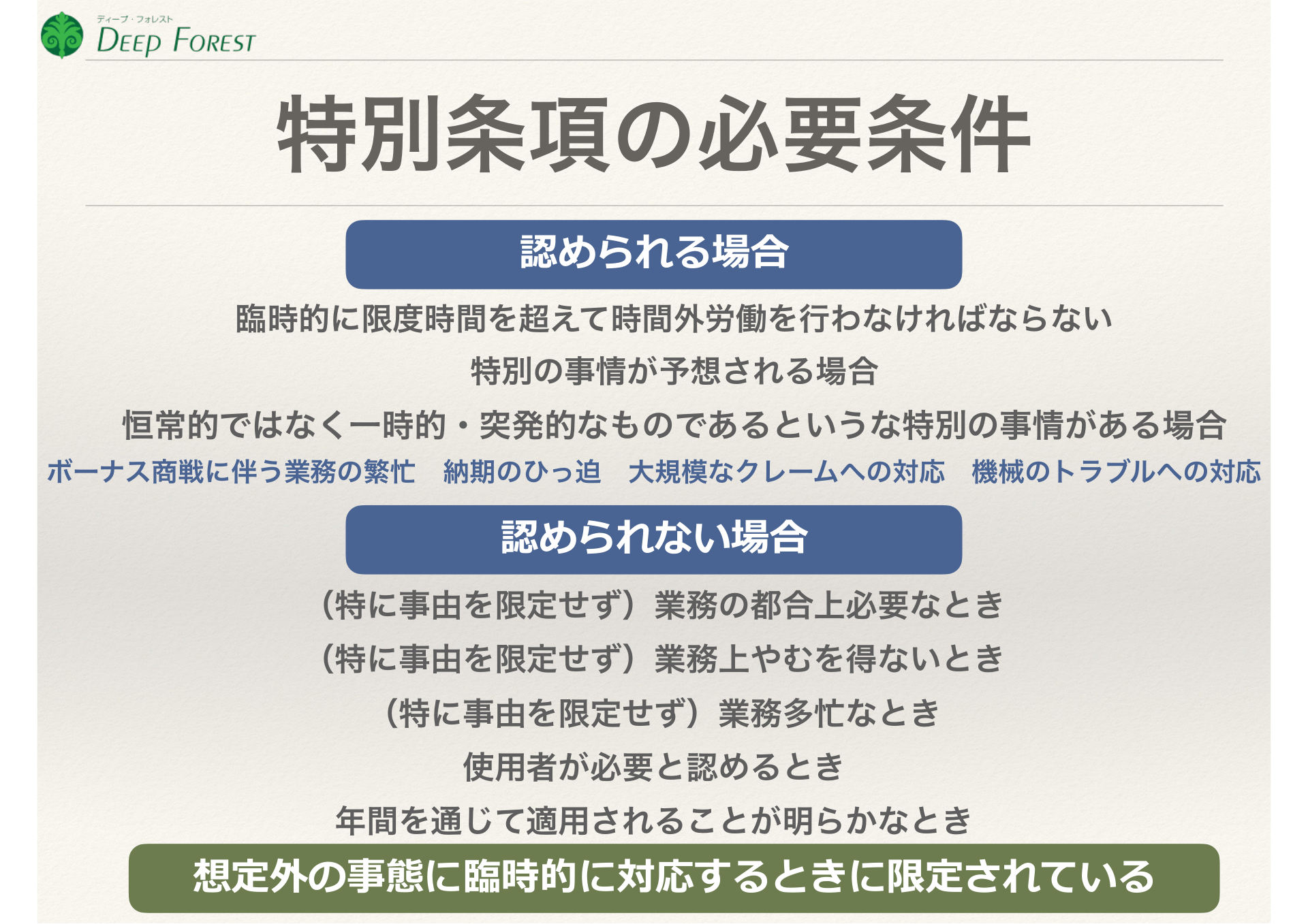 特別条項の必要条件 認められる場合 臨時的に限度時間を超えて時間外労働を行わなければならない 特別の事情が予想される場合 恒常的ではなく一時的・突発的なものであるというな特別の事情がある場合 ボーナス商戦に伴う業務の繁忙 納期のひっ迫 大規模なクレームへの対応 機械のトラブルへの対応 認められない場合 (特に事由を限定せず)業務の都合上必要なとき (特に事由を限定せず)業務上やむを得ないとき (特に事由を限定せず)業務多忙なとき 使用者が必要と認めるとき 年間を通じて適用されることが明らかなとき 想定外の事態に臨時的に対応するときに限定されている