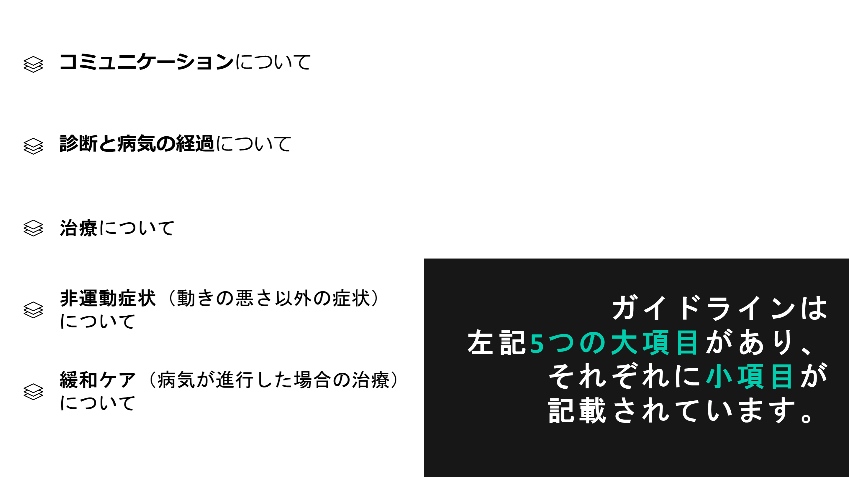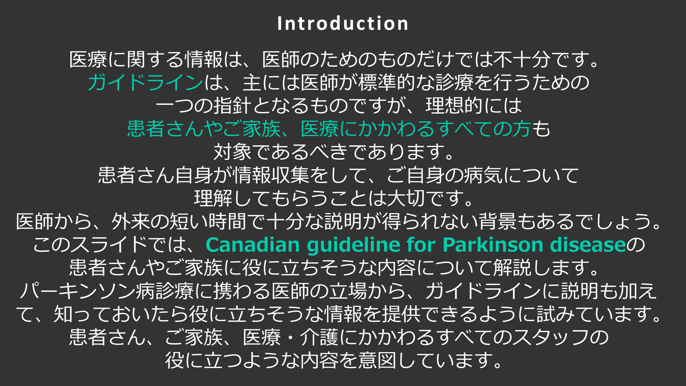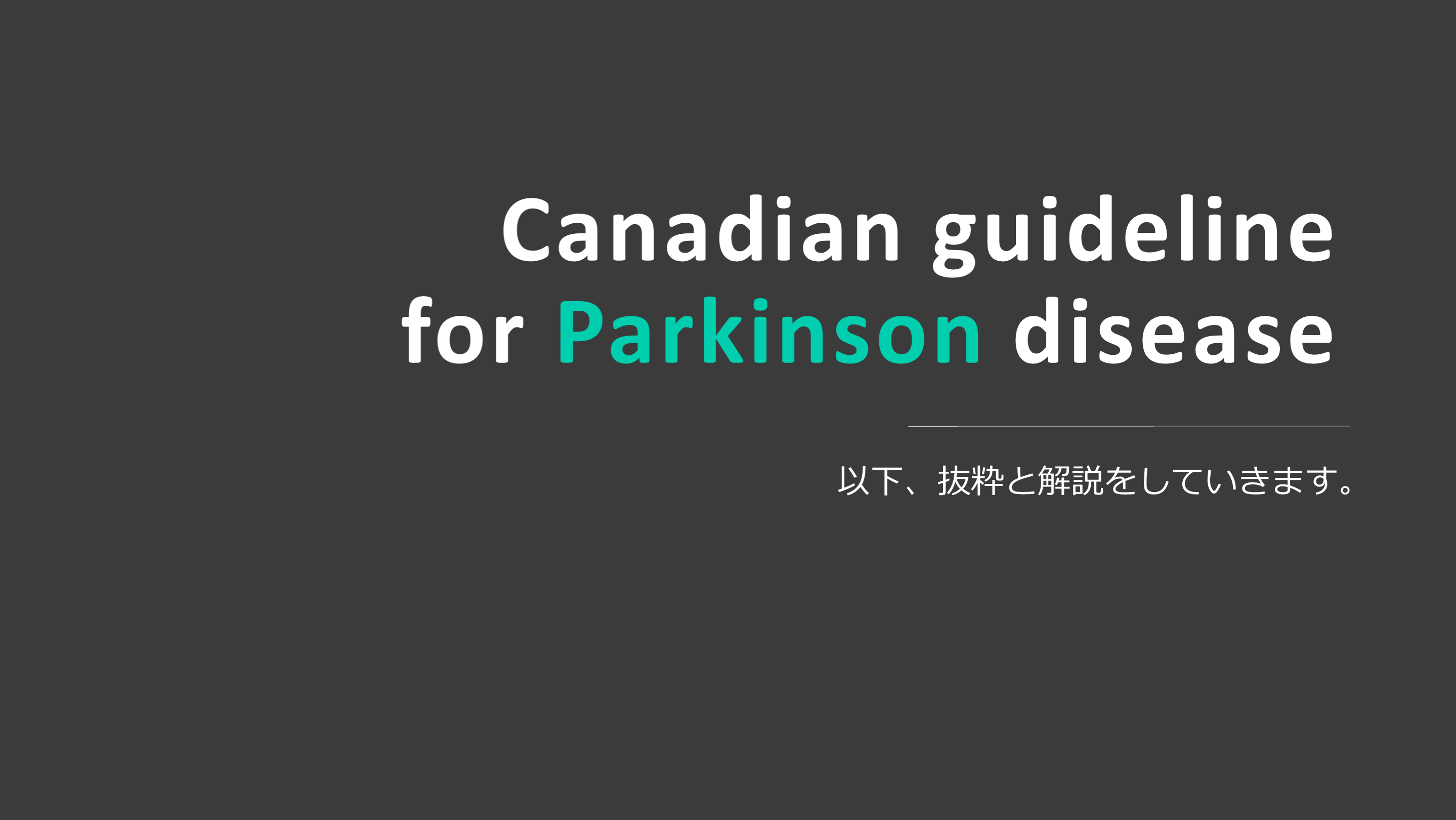 対象として記載します。 “カナディアン ガイドライン フォー パ-キンソン ディジーズ(2019)”は、医師のみでなく、当事者、家族、関わるスタッフすべてを対象にしていると記載されています。このガイドラインを読んでみて、患者さん向けの記載がいいなぁと思い、患者さんへの説明に使えそうな、実際に患者さんに役に立ちそうな内容を抜粋して記載してみることにしました。