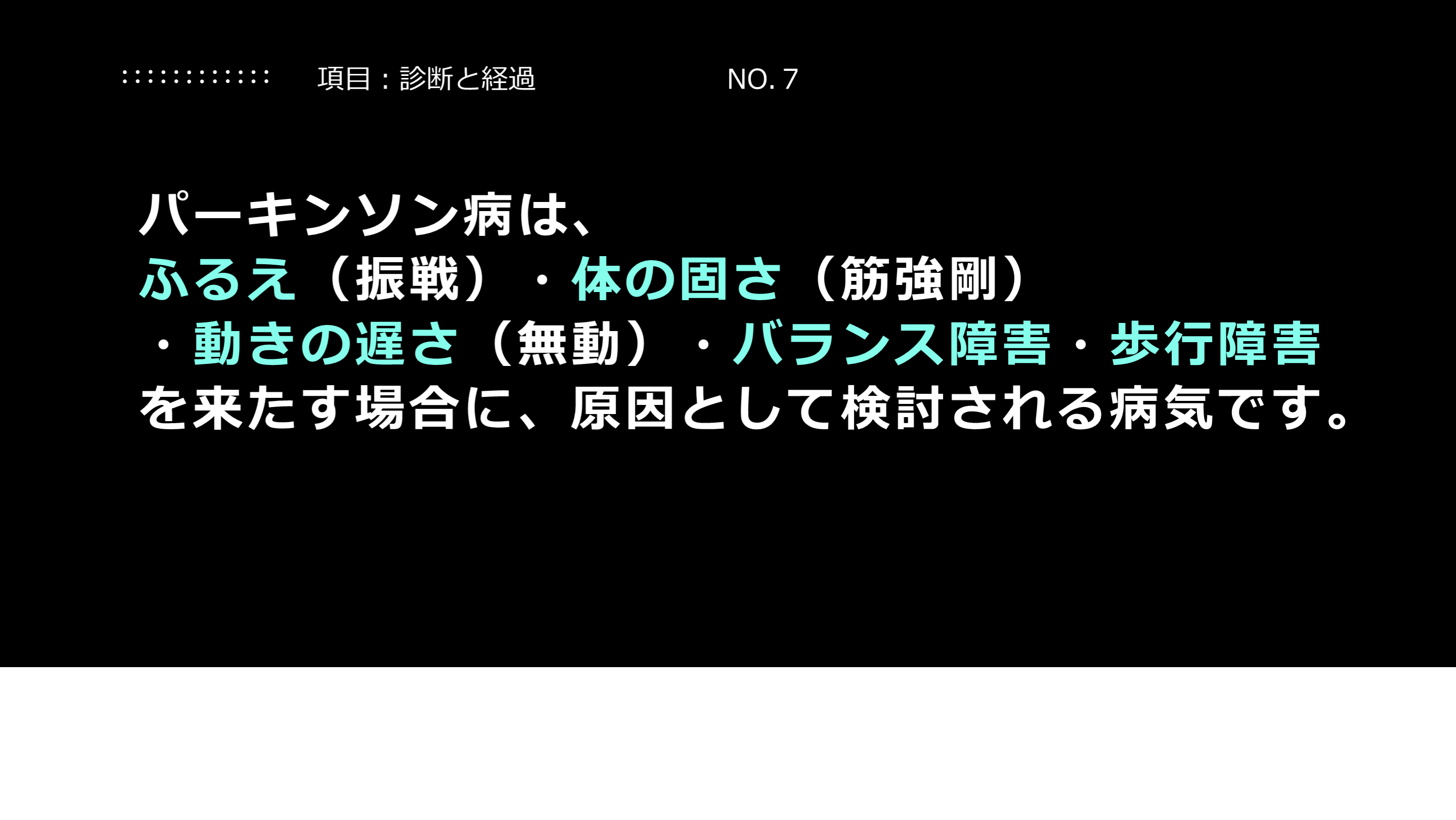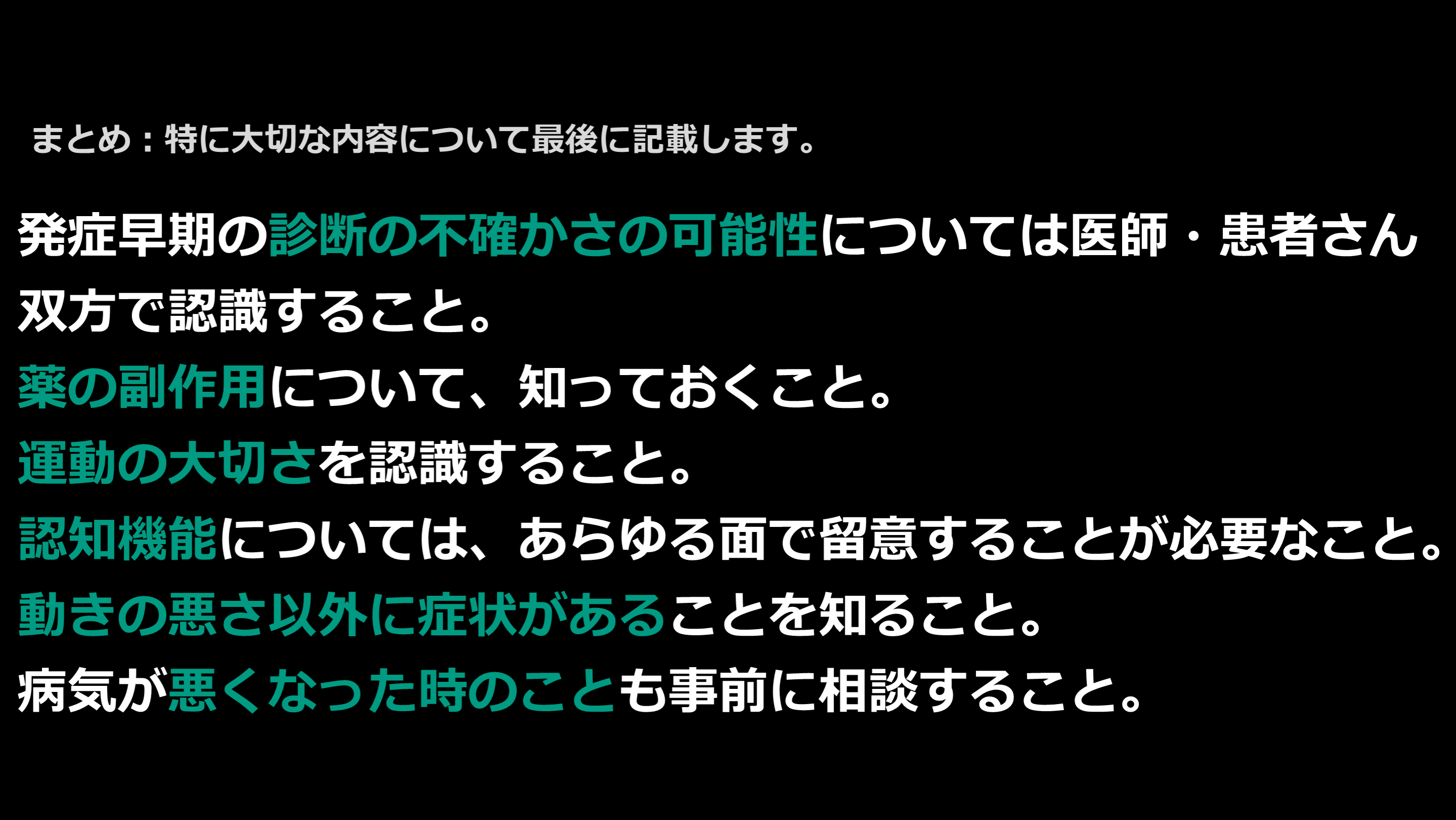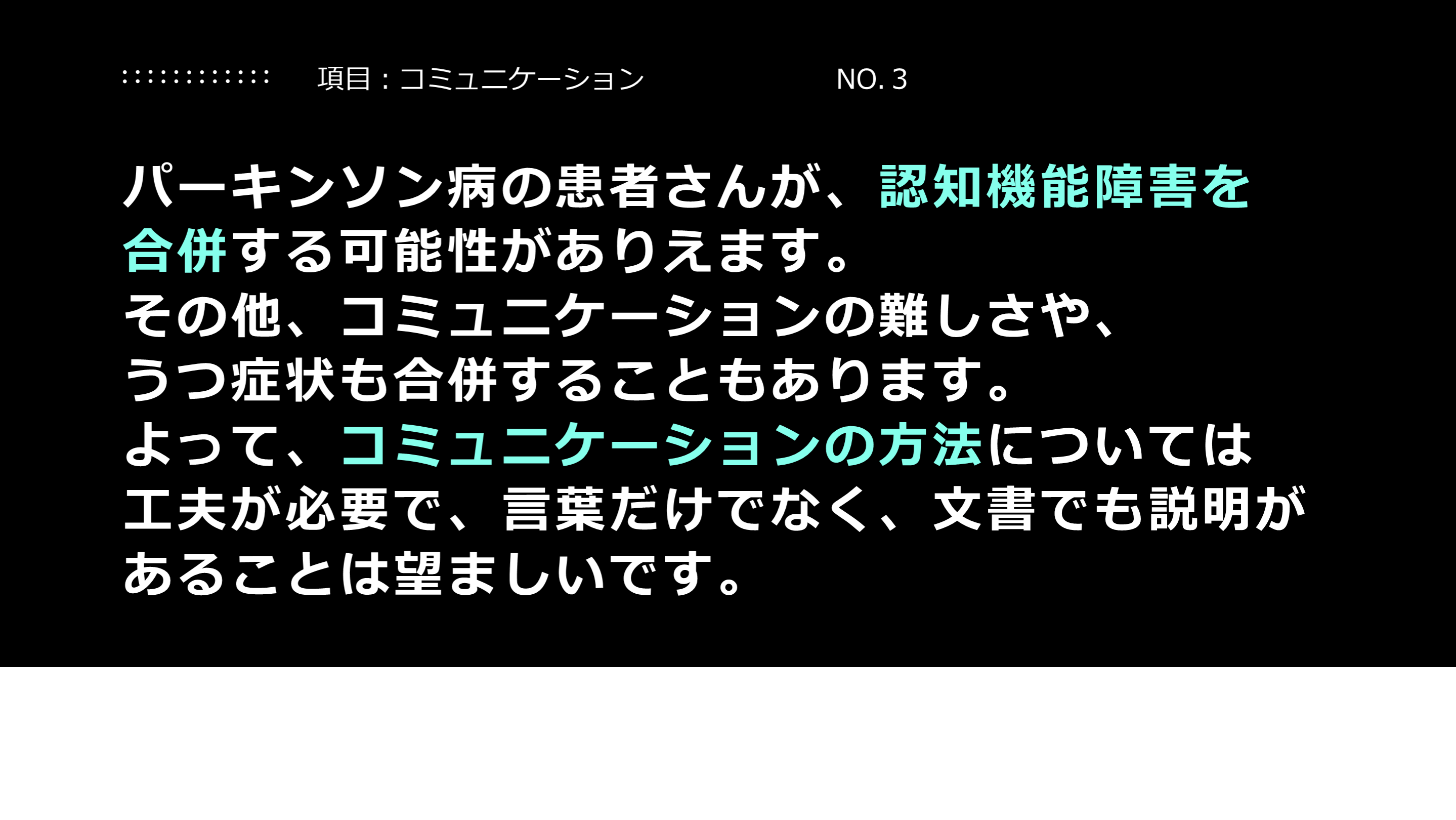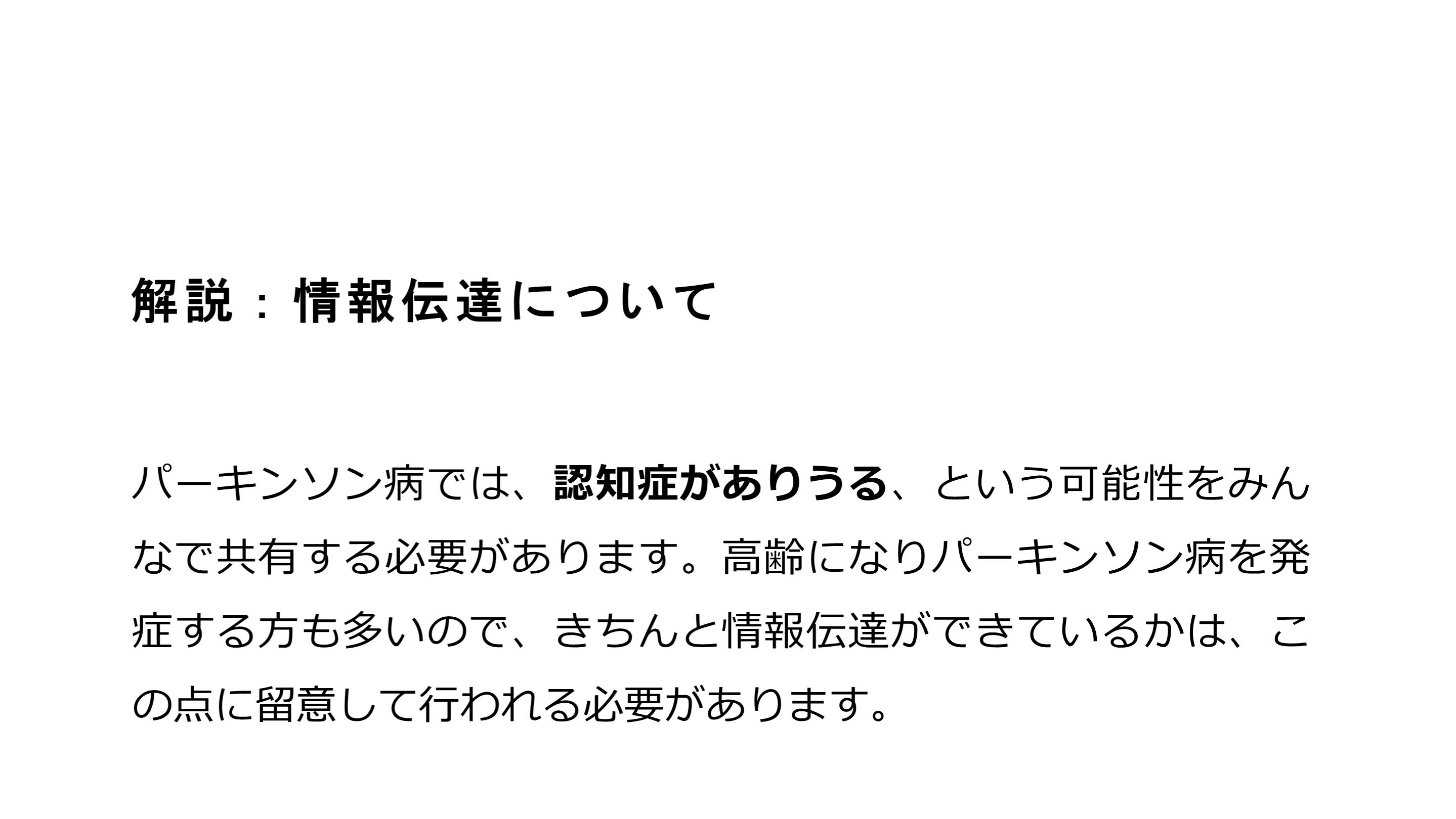 #8. 解説:情報伝達について パーキンソン病では、認知症がありうる、という可能性をみんなで共有する必要があります。高齢になりパーキンソン病を発症する方も多いので、きちんと情報伝達ができているかは、この点に留意して行われる必要があります。