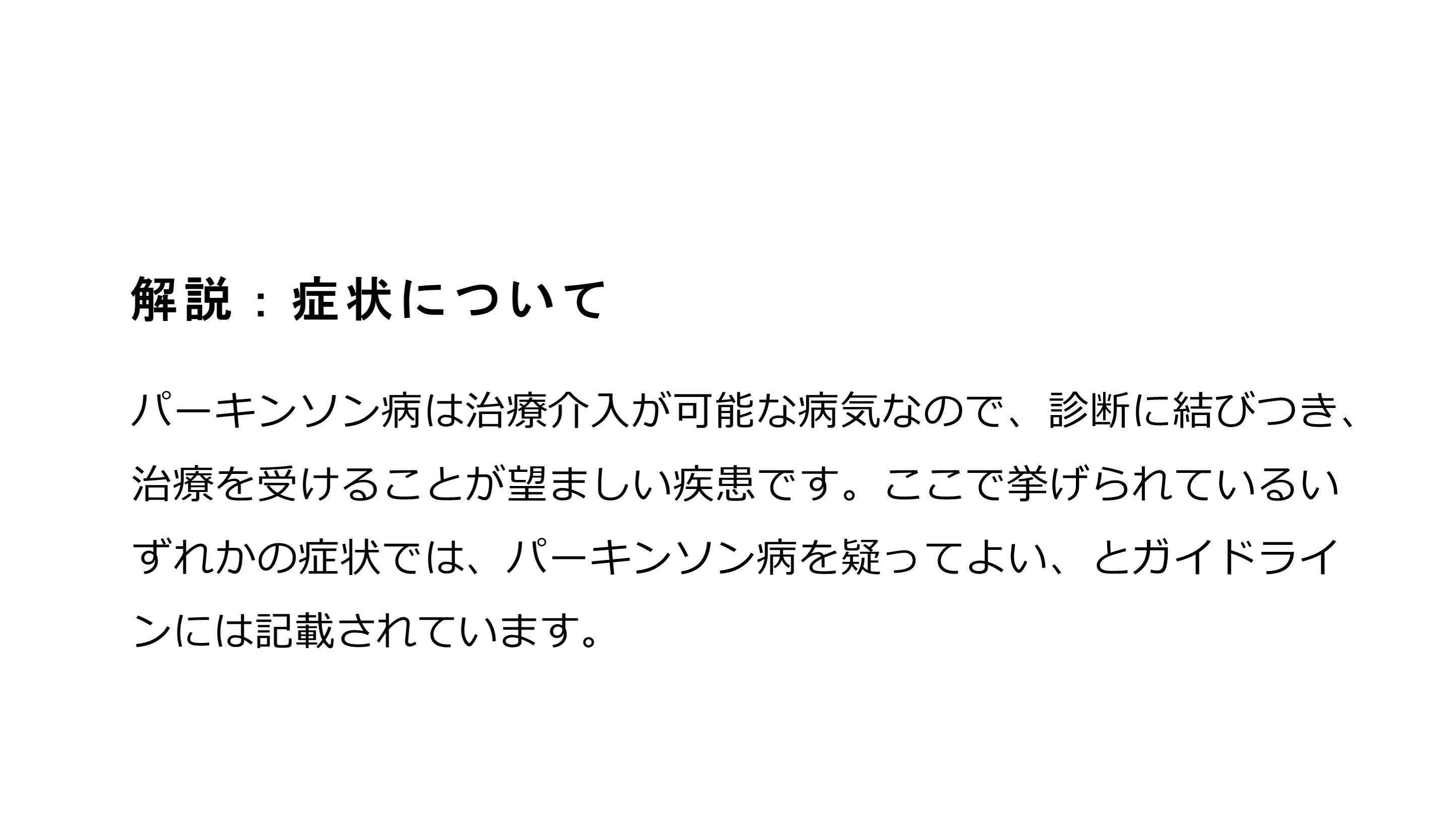 #10. 解説:症状について パーキンソン病は治療介入が可能な病気なので、診断に結びつき、治療を受けることが望ましい疾患です。ここで挙げられているいずれかの症状では、パーキンソン病を疑ってよい、とガイドラインには記載されています。
