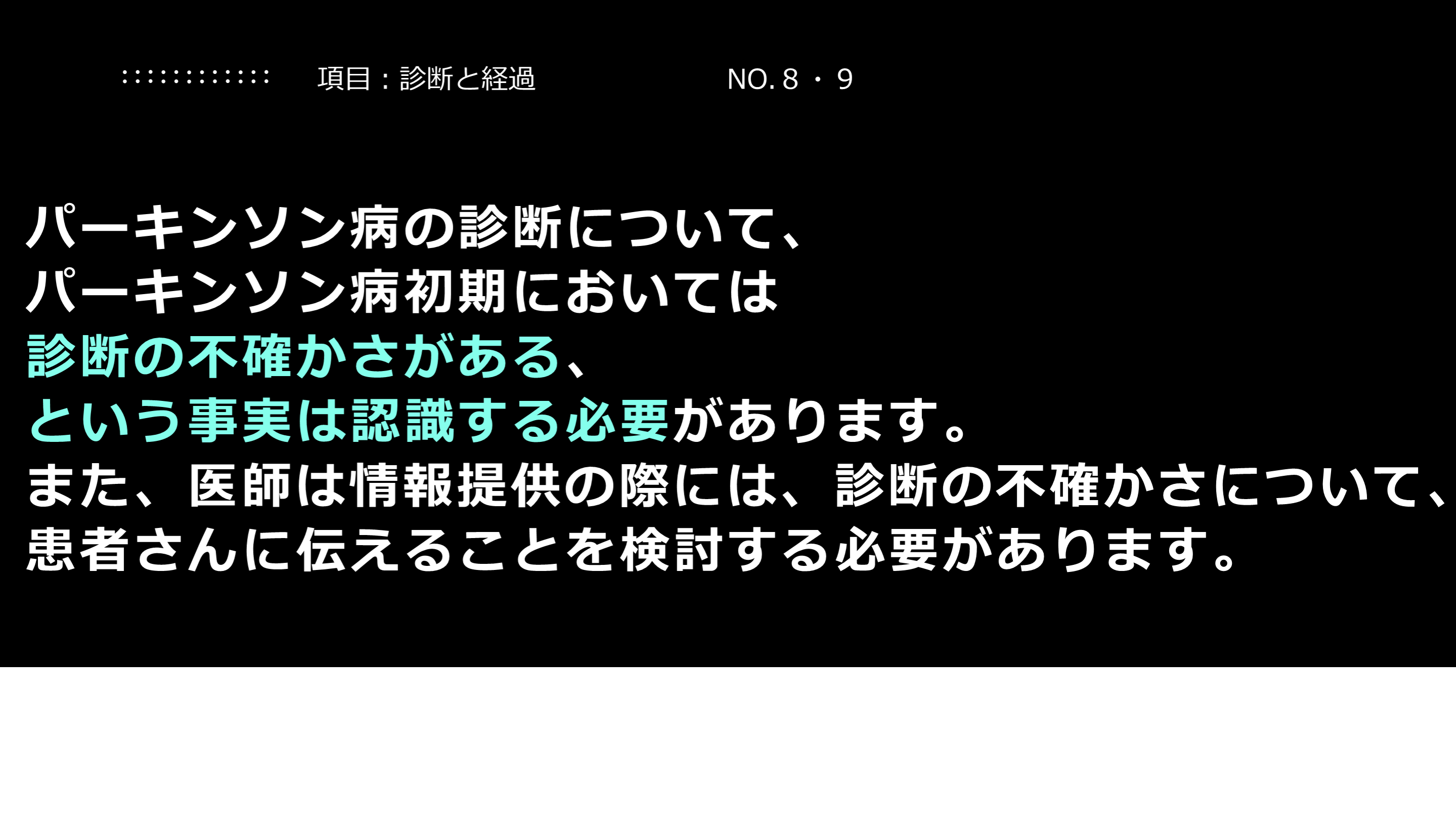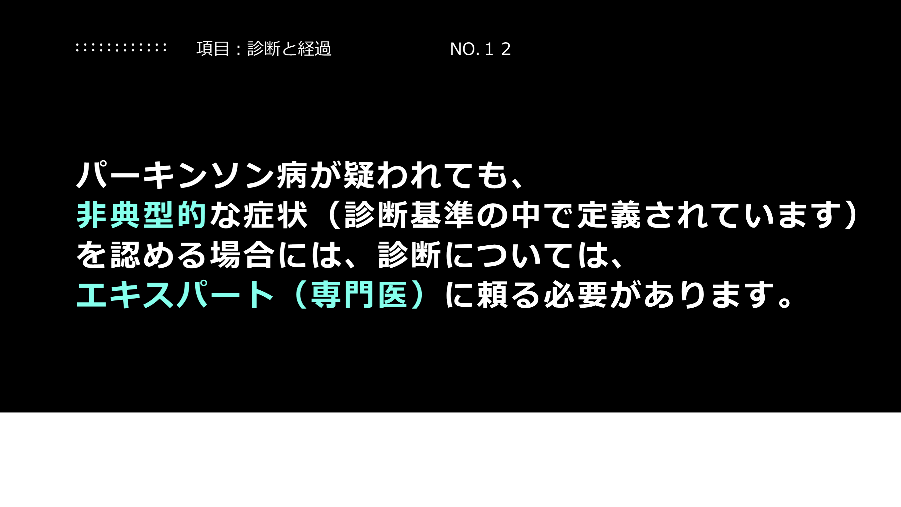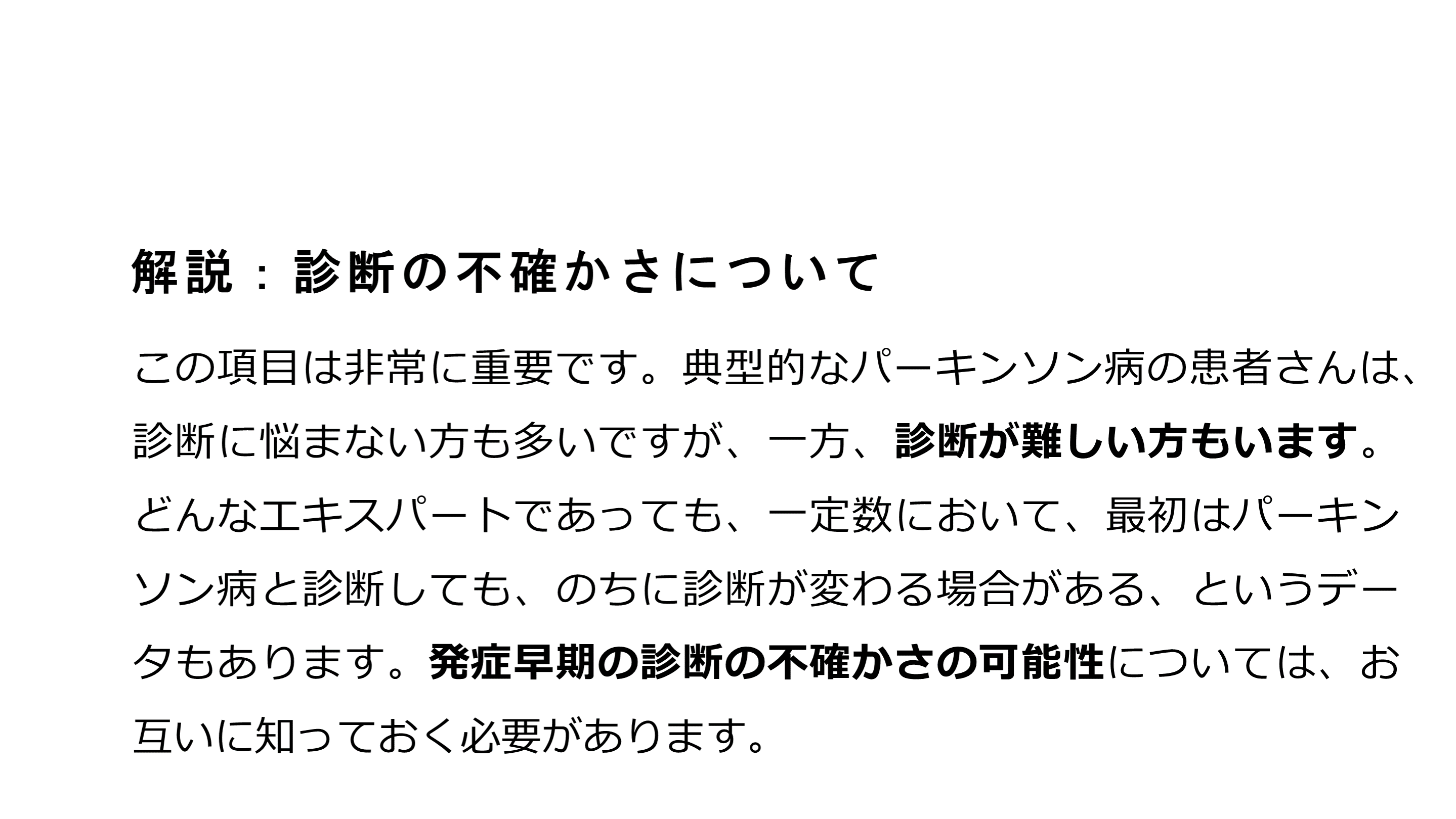 #12. 解説:診断の不確かさについて この項目は非常に重要です。典型的なパーキンソン病の患者さんは、診断に悩まない方も多いですが、一方、診断が難しい方もいます。どんなエキスパートであっても、一定数において、最初はパーキンソン病と診断しても、のちに診断が変わる場合がある、というデータもあります。発症早期の診断の不確かさの可能性については、お互いに知っておく必要があります。