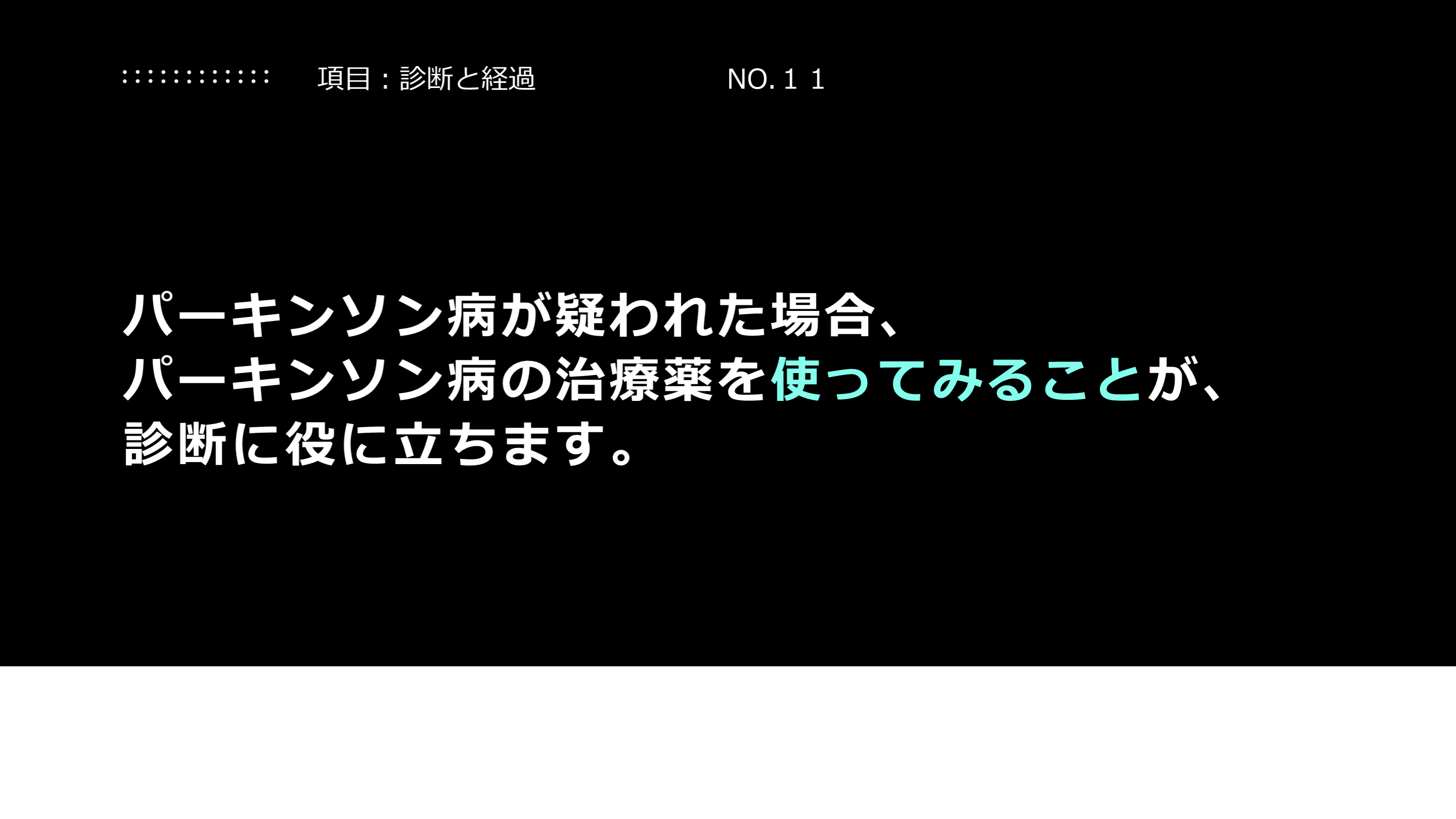 パーキンソン病の治療薬を使ってみることが、診断に役に立ちます。 項目:診断と経過 NO.11