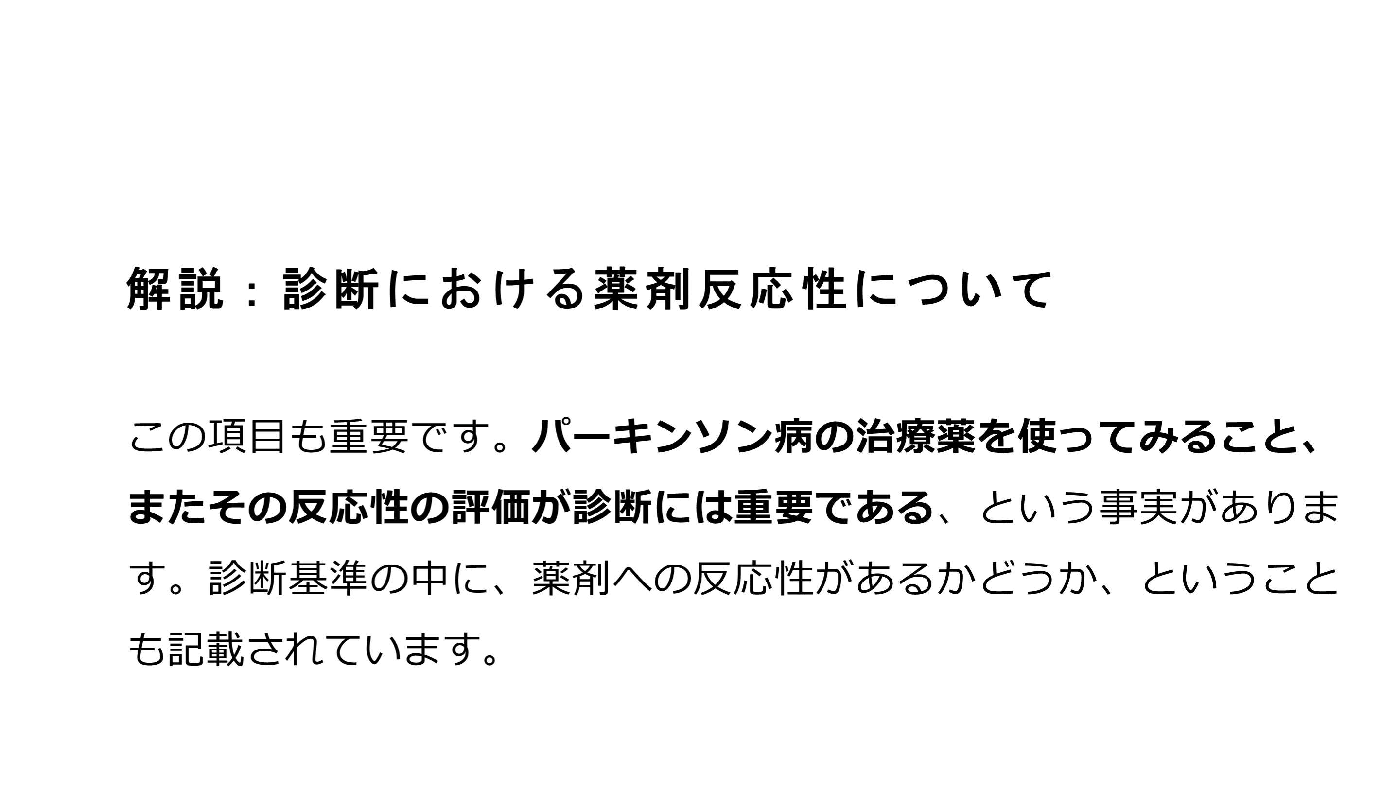 #14. 解説:診断における薬剤反応性について この項目も重要です。パーキンソン病の治療薬を使ってみること、またその反応性の評価が診断には重要である、という事実があります。診断基準の中に、薬剤への反応性があるかどうか、ということも記載されています。