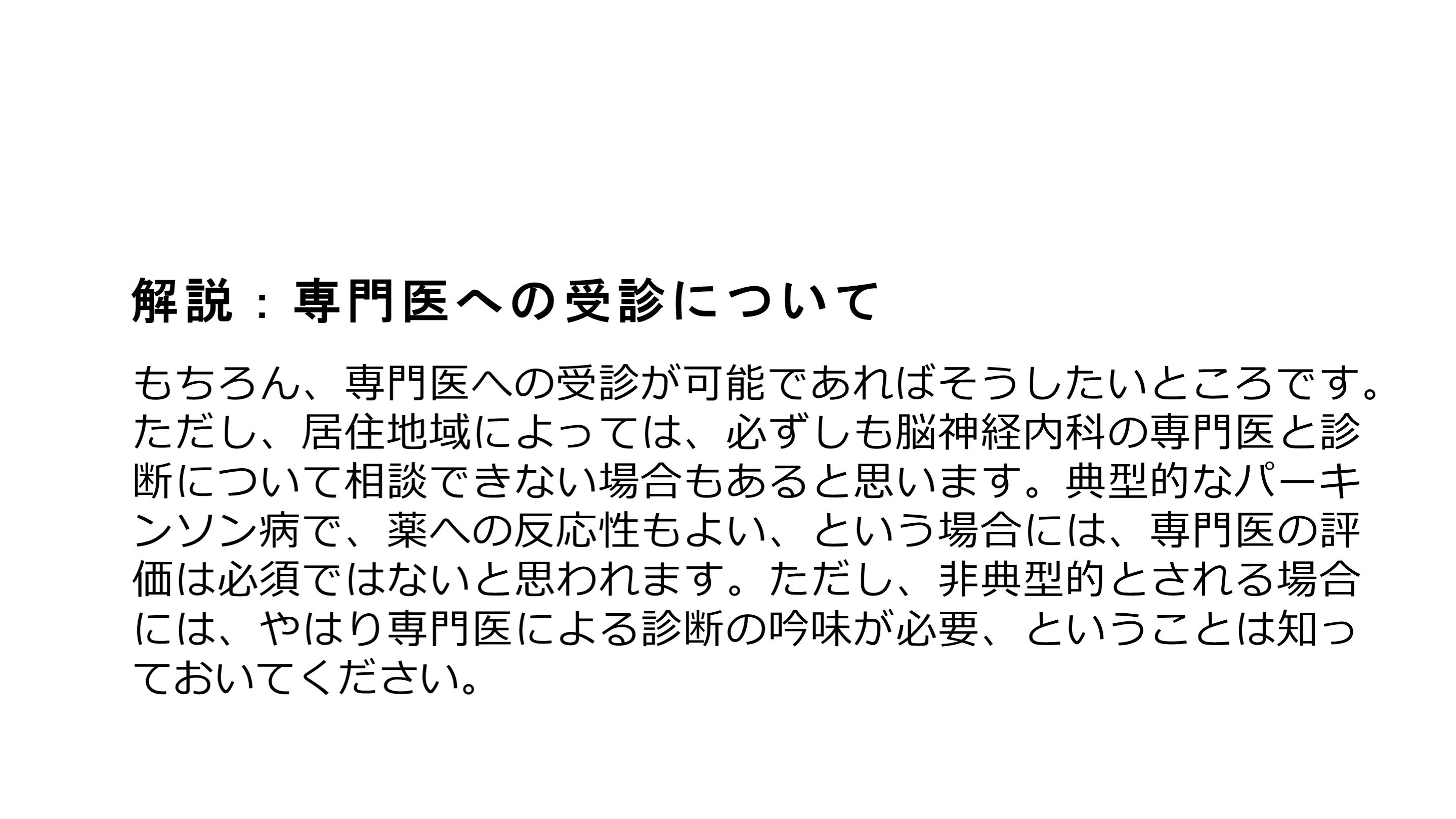 #16. 解説:専門医への受診について もちろん、専門医への受診が可能であればそうしたいところです。ただし、居住地域によっては、必ずしも脳神経内科の専門医と診断について相談できない場合もあると思います。典型的なパーキンソン病で、薬への反応性もよい、という場合には、専門医の評価は必須ではないと思われます。ただし、非典型的とされる場合には、やはり専門医による診断の吟味が必要、ということは知っておいてください。