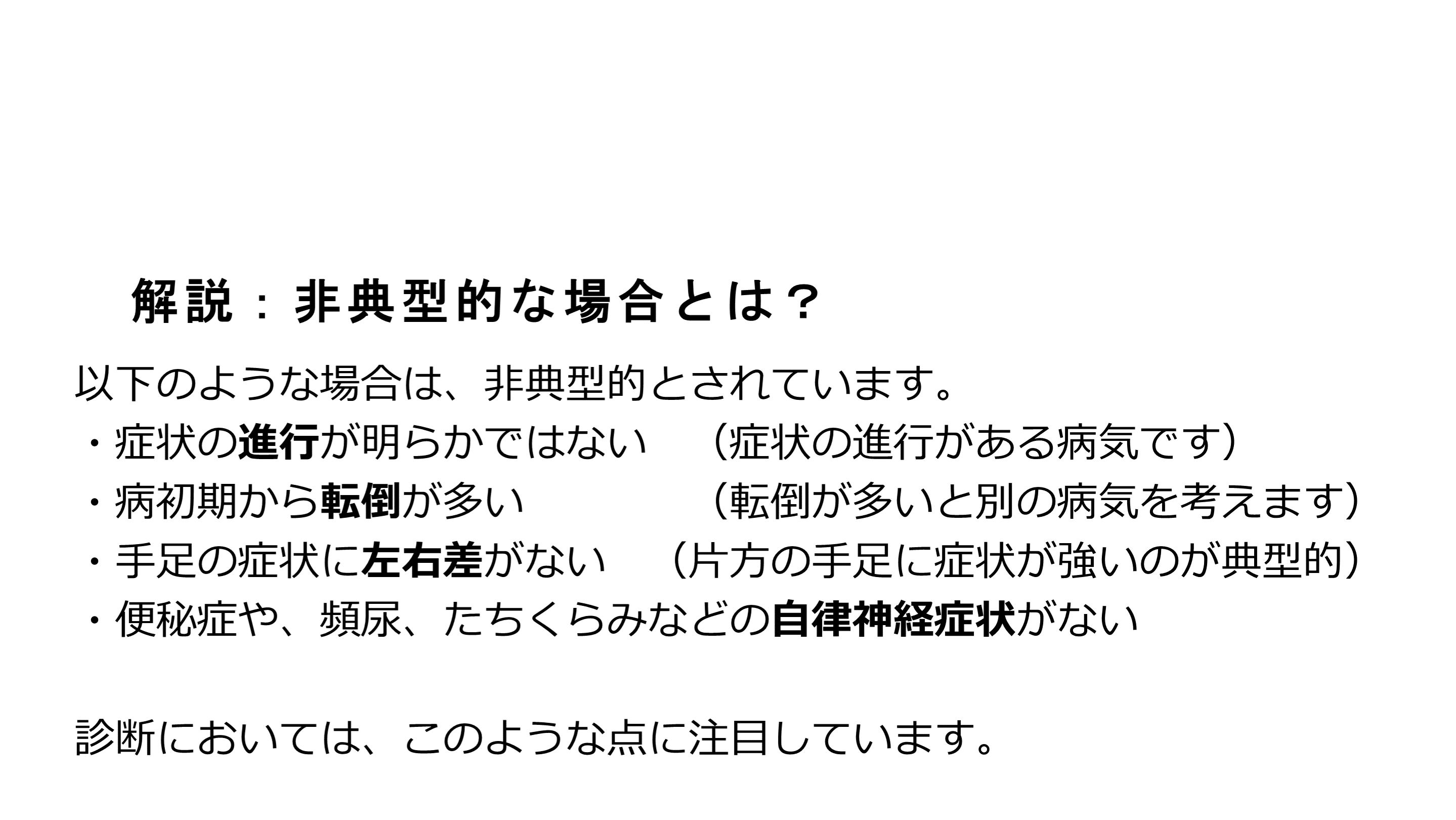 ・病初期から転倒が多い (転倒が多いと別の病気を考えます)