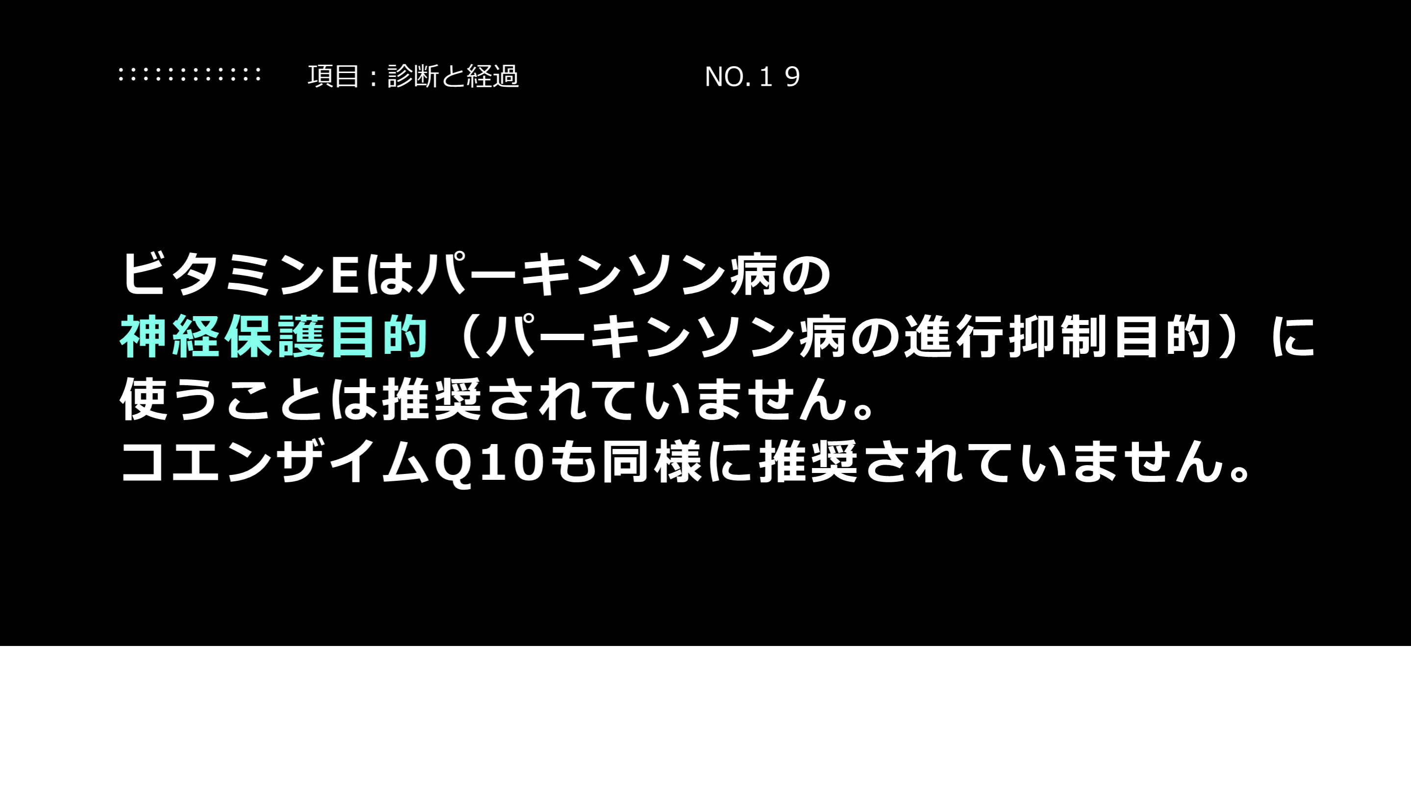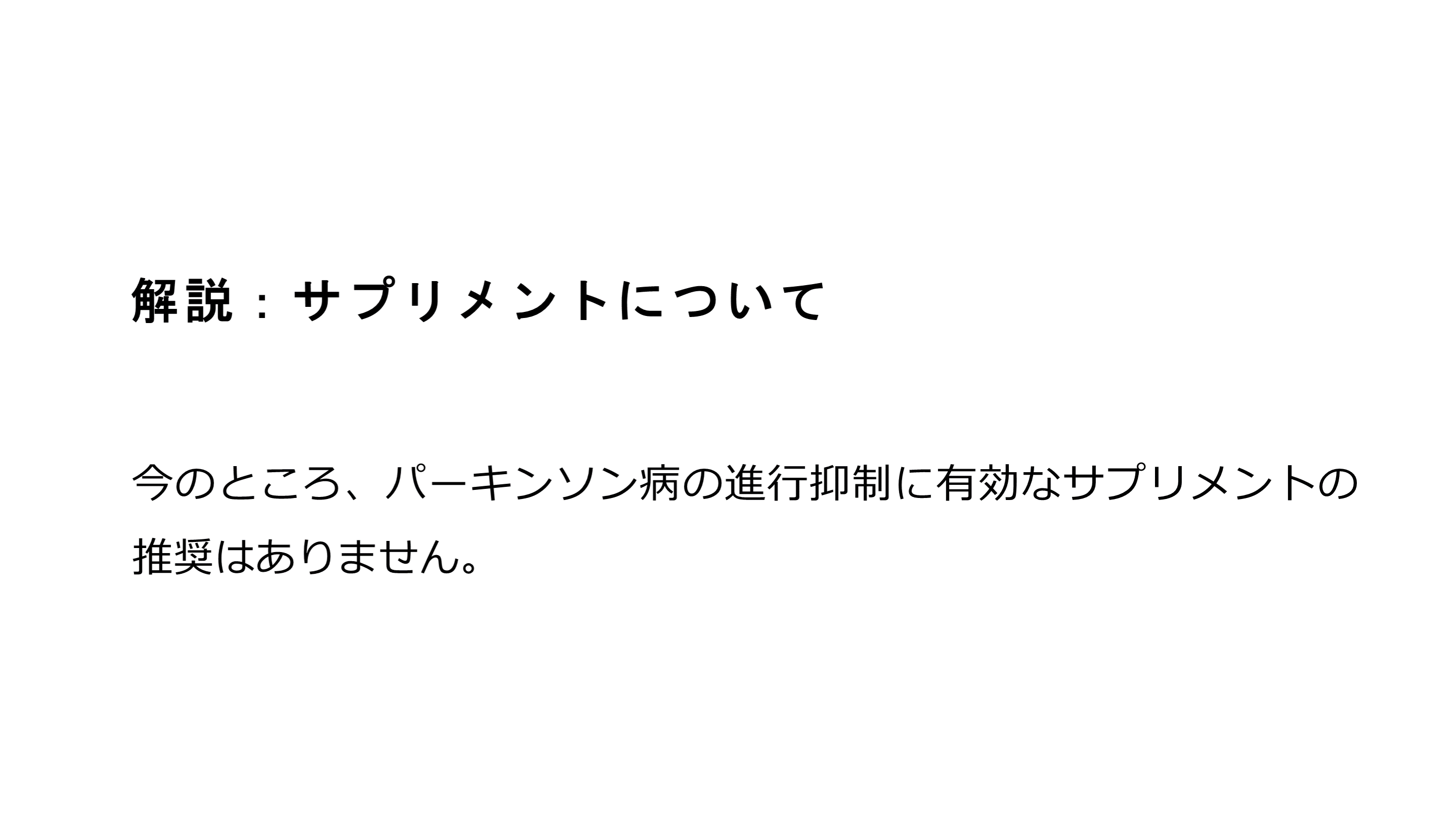 #19. 解説:サプリメントについて 今のところ、パーキンソン病の進行抑制に有効なサプリメントの推奨はありません。