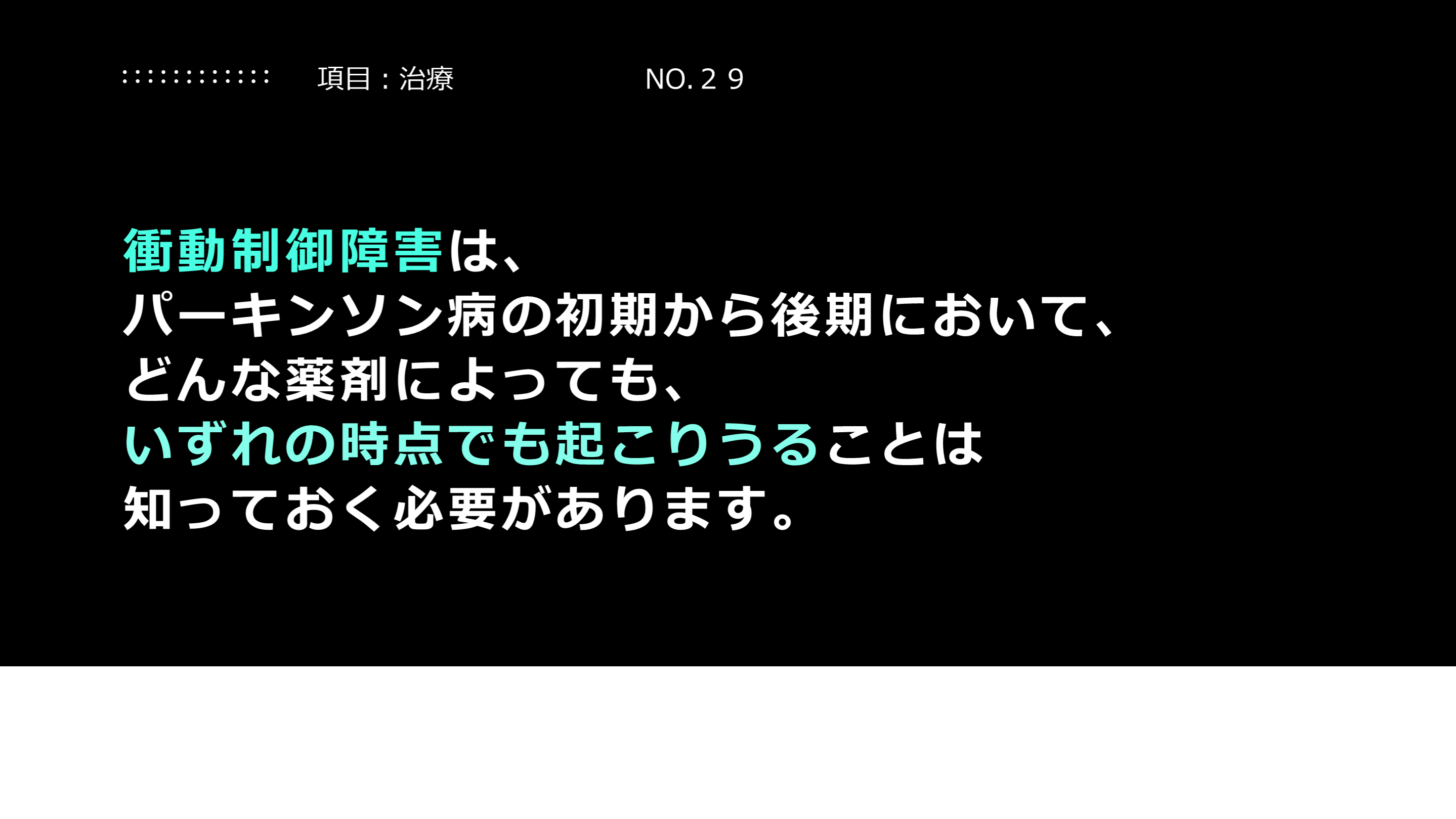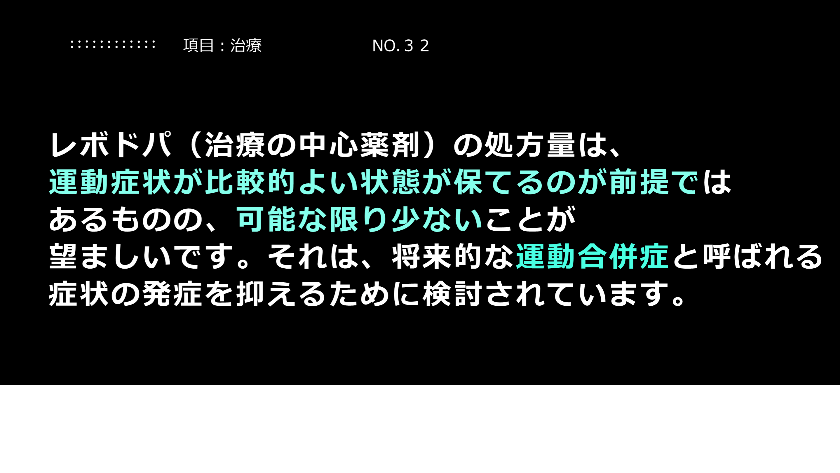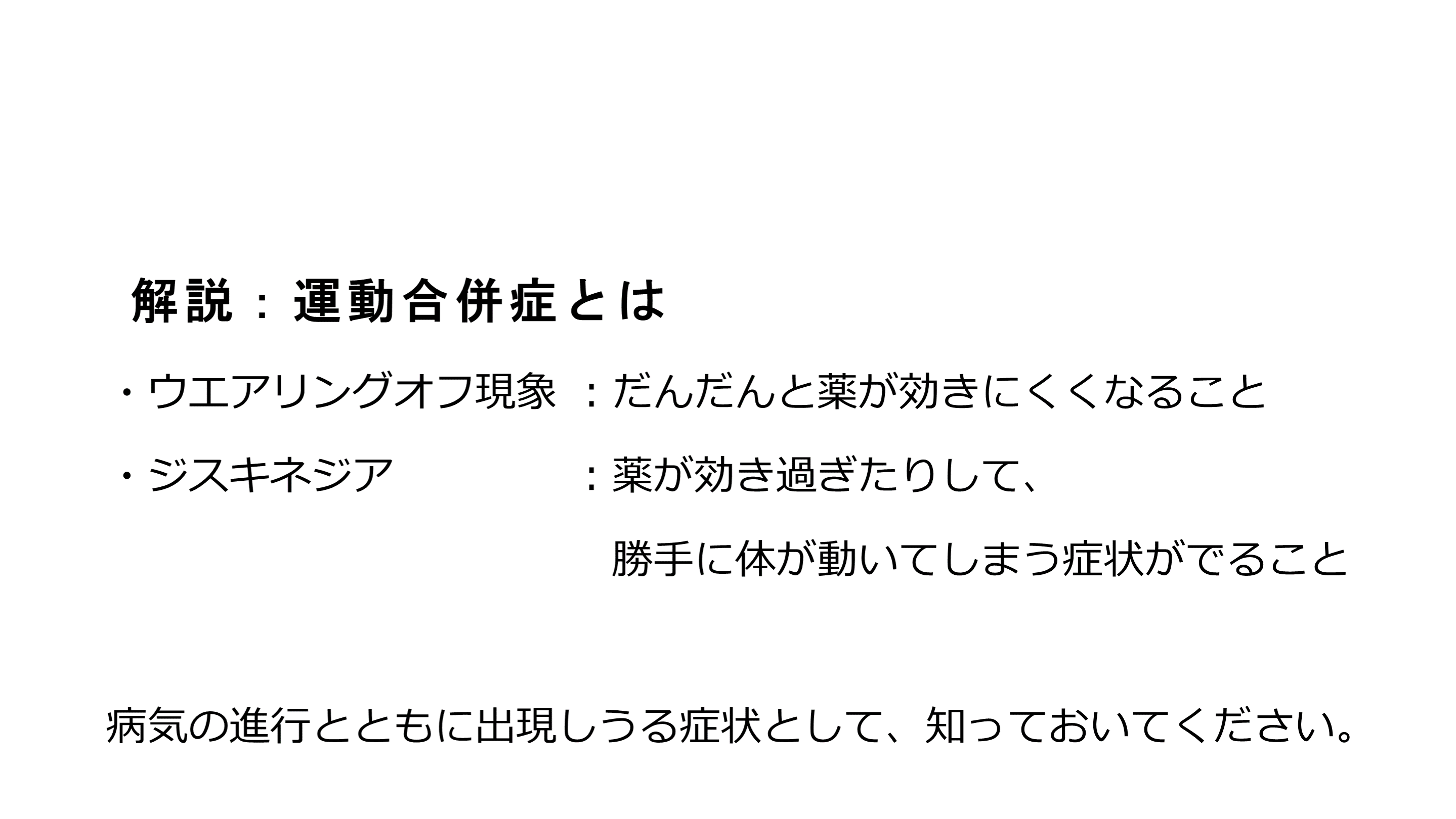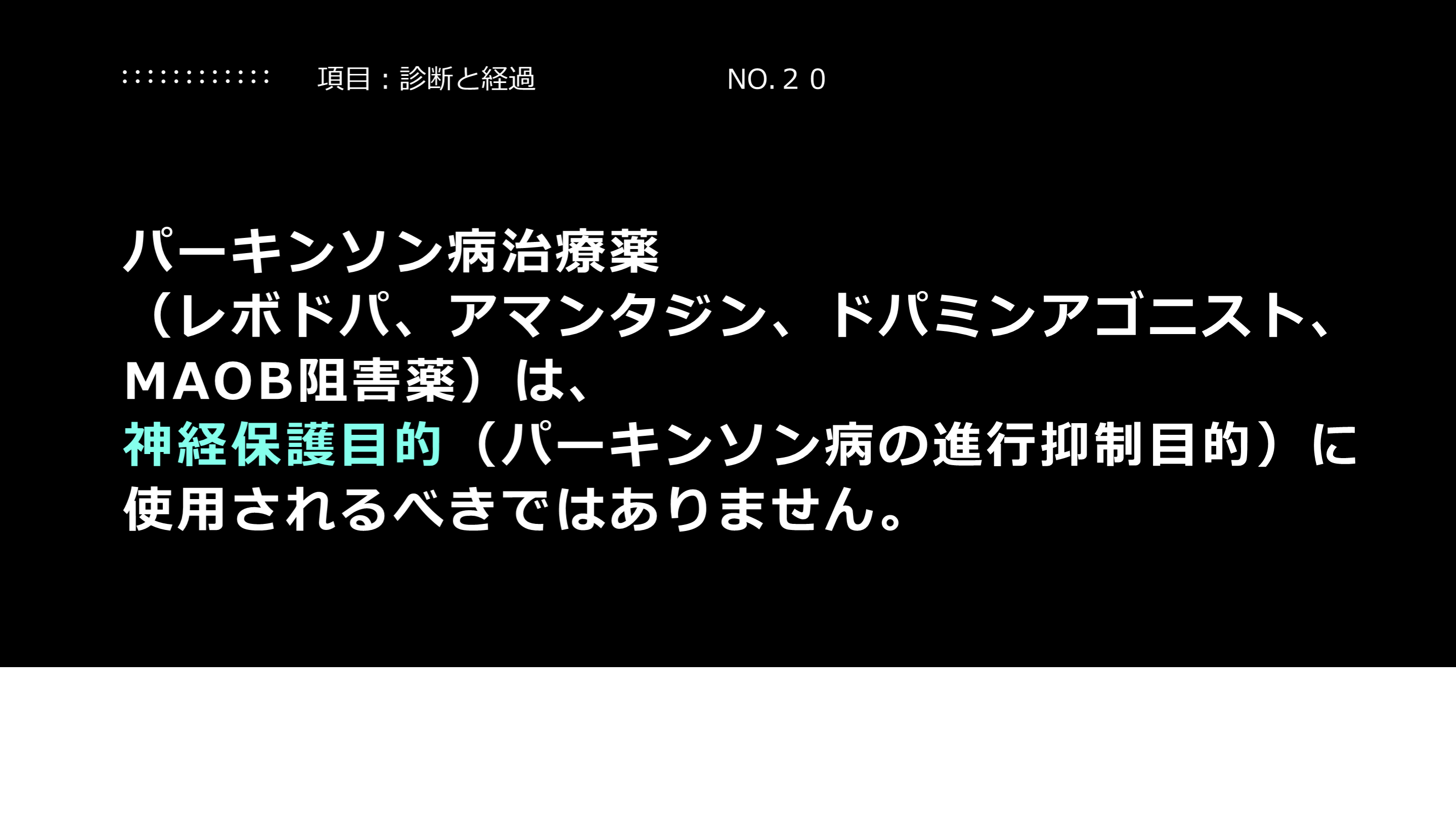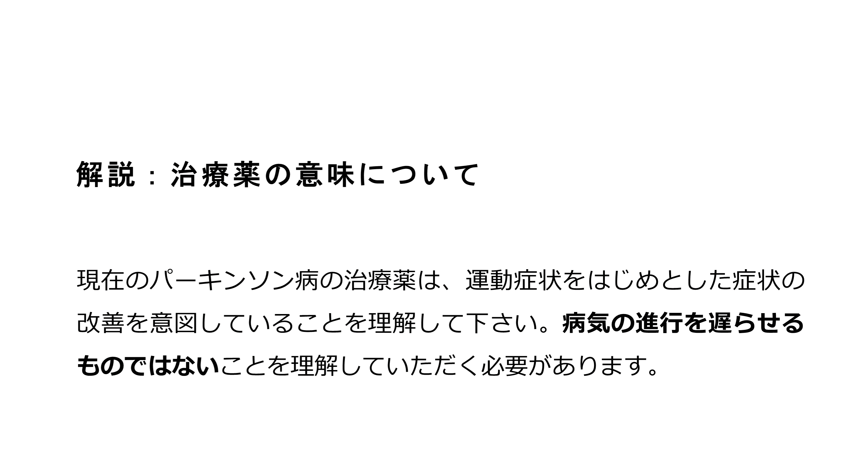 #21. 解説:治療薬の意味について 現在のパーキンソン病の治療薬は、運動症状をはじめとした症状の改善を意図していることを理解して下さい。病気の進行を遅らせるものではないことを理解していただく必要があります。