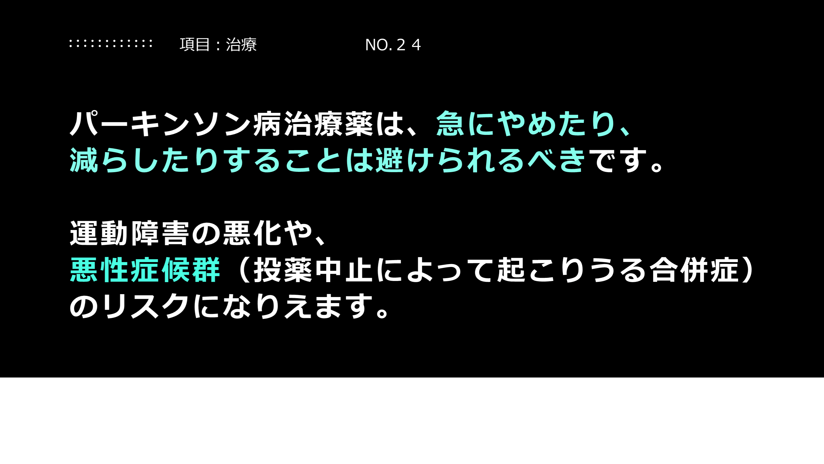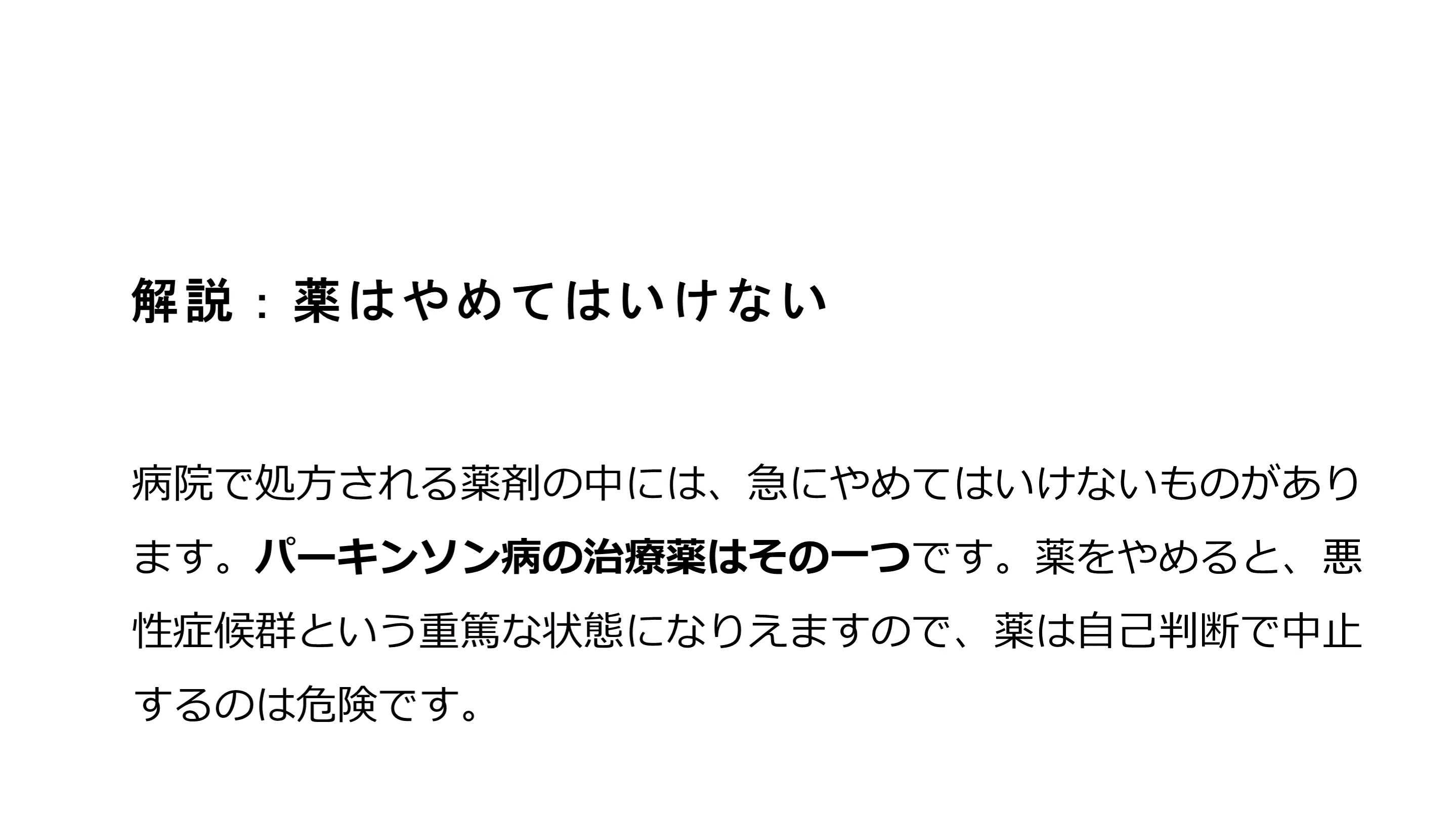 #23. 解説:薬はやめてはいけない 病院で処方される薬剤の中には、急にやめてはいけないものがあります。パーキンソン病の治療薬はその一つです。薬をやめると、悪性症候群という重篤な状態になりえますので、薬は自己判断で中止するのは危険です。