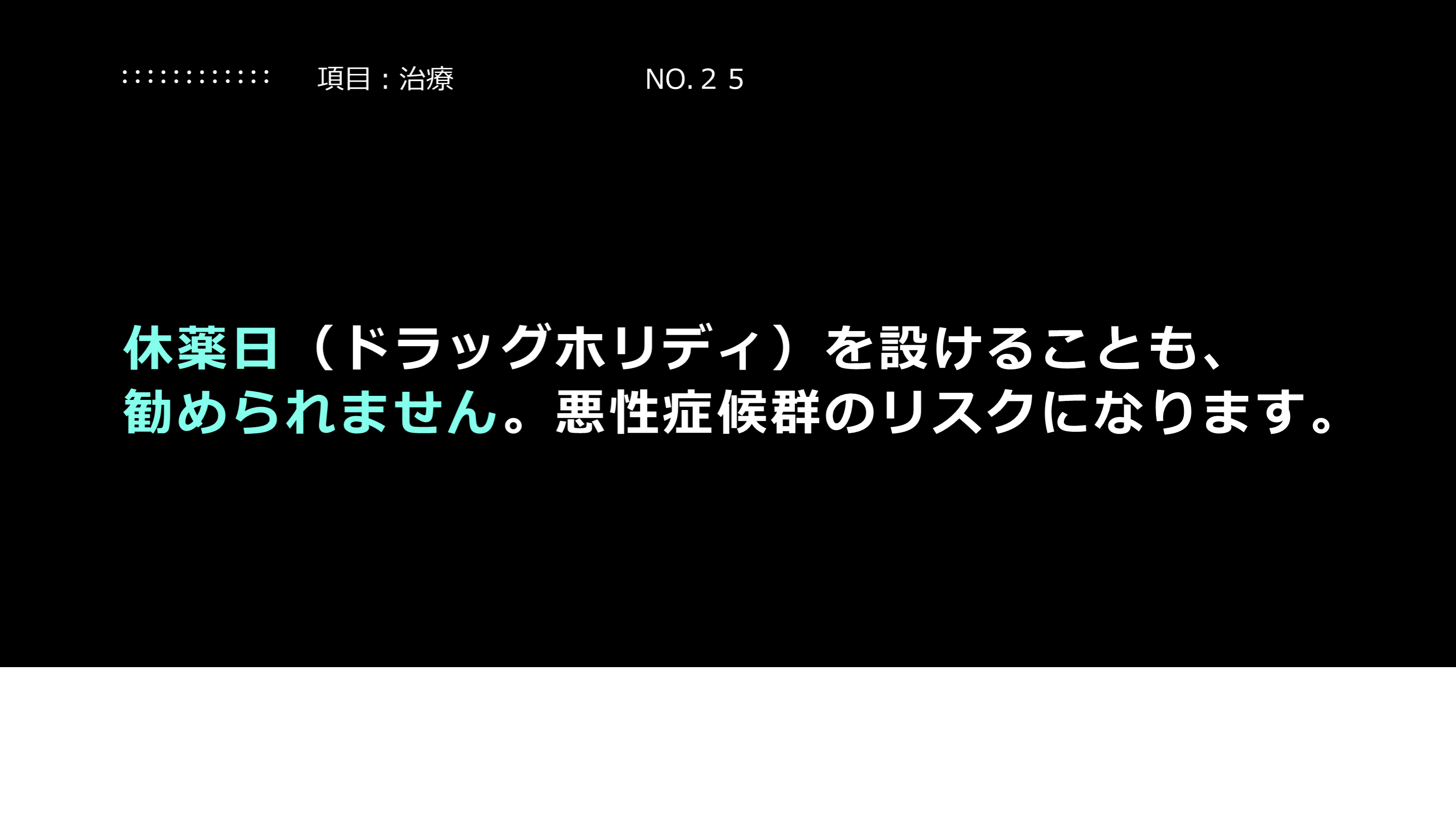 悪性症候群(投薬中止によって起こりうる合併症)のリスクになりえます。 項目:治療 NO.24