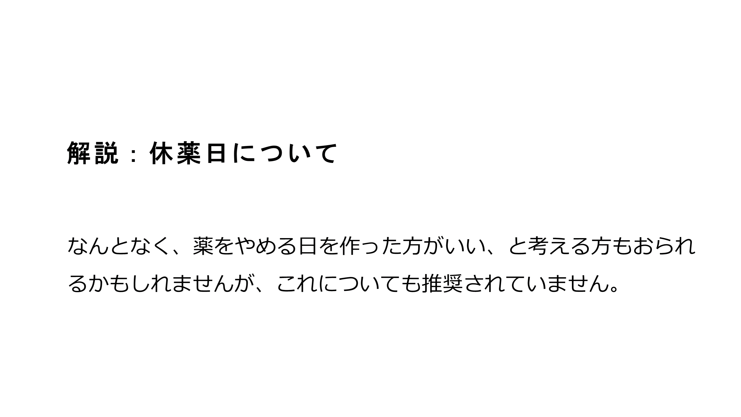 #25. 解説:休薬日について なんとなく、薬をやめる日を作った方がいい、と考える方もおられるかもしれませんが、これについても推奨されていません。