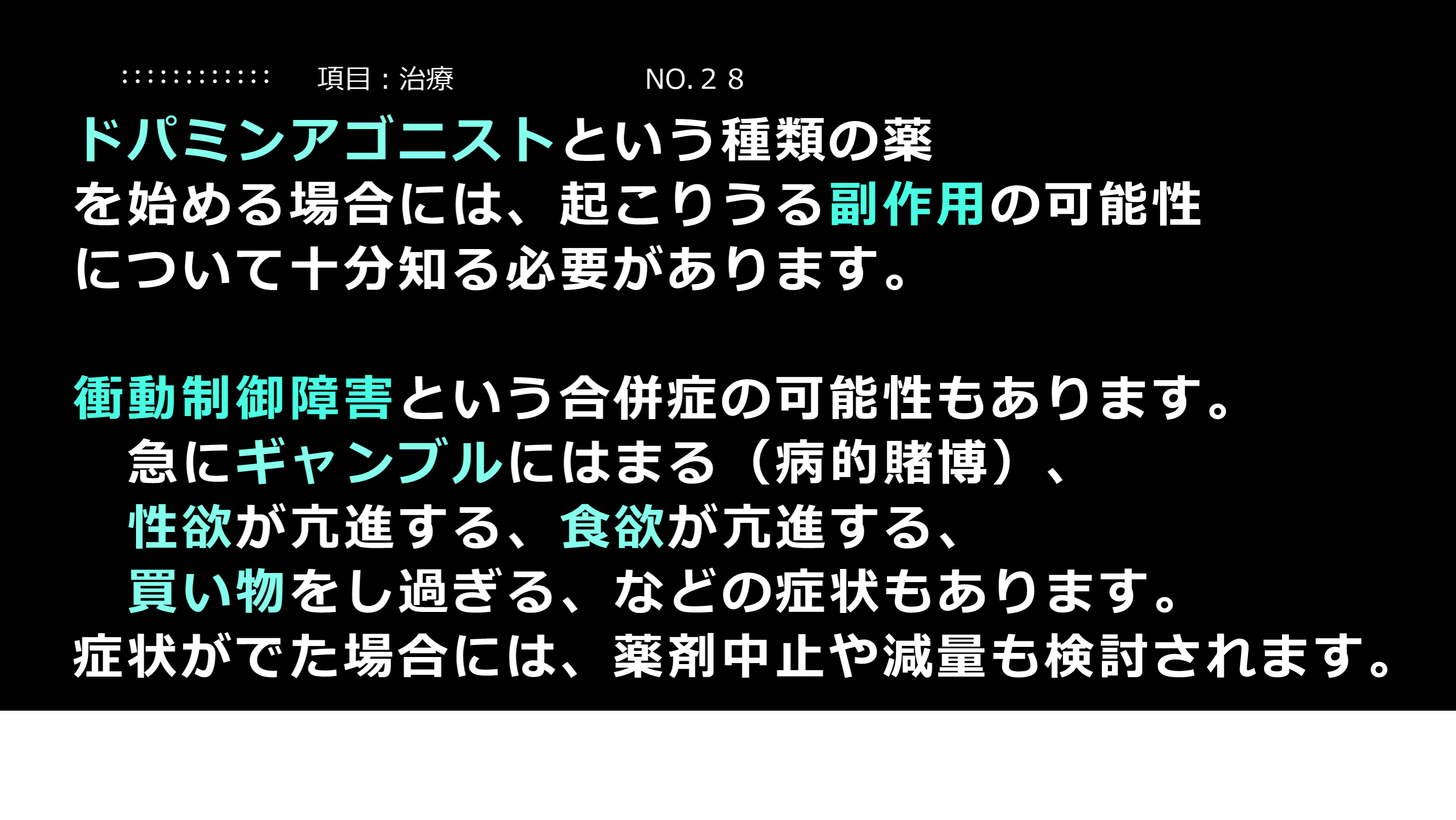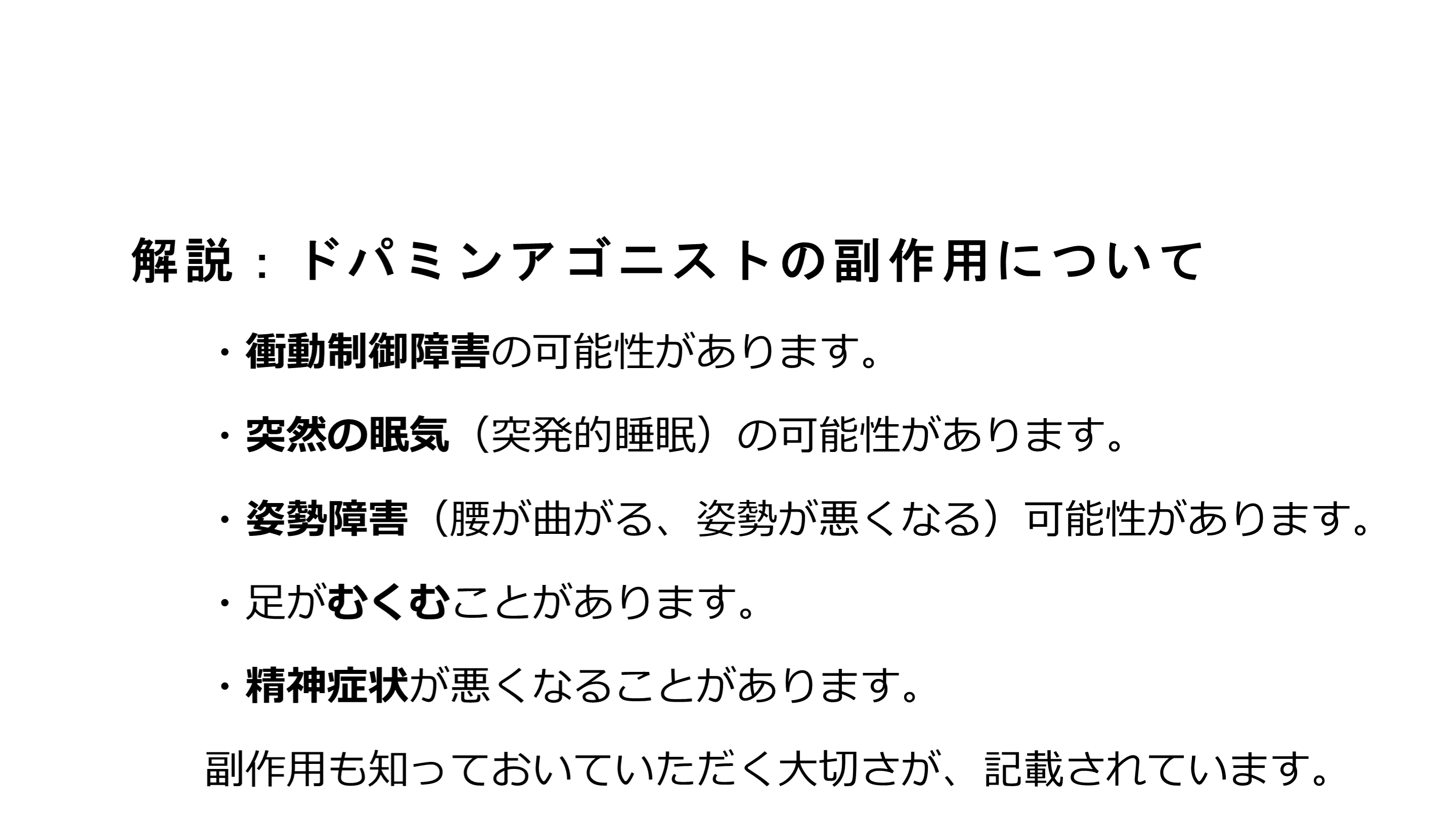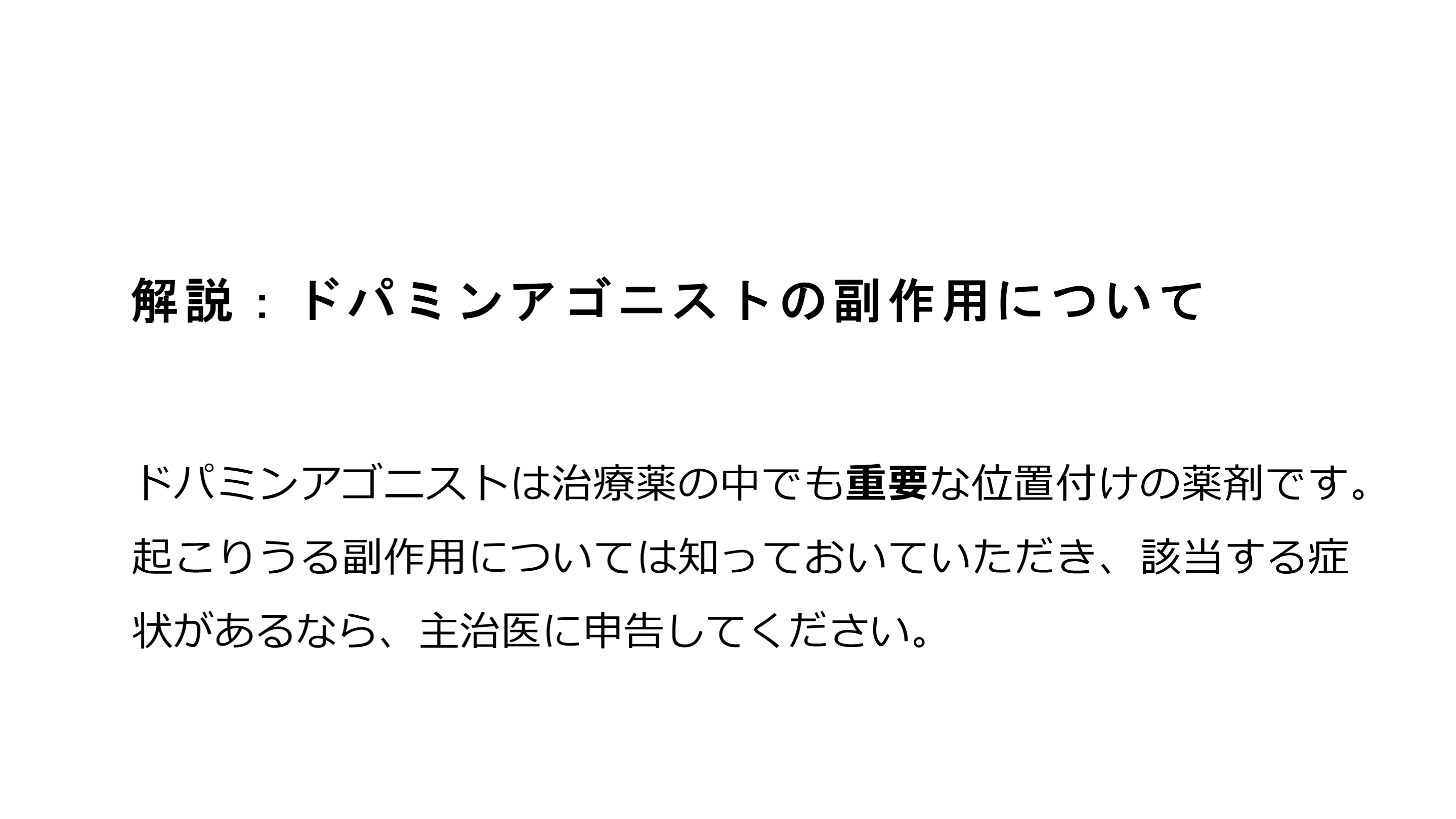 #27. 解説:ドパミンアゴニストの副作用について ドパミンアゴニストは治療薬の中でも重要な位置付けの薬剤です。起こりうる副作用については知っておいていただき、該当する症状があるなら、主治医に申告してください。