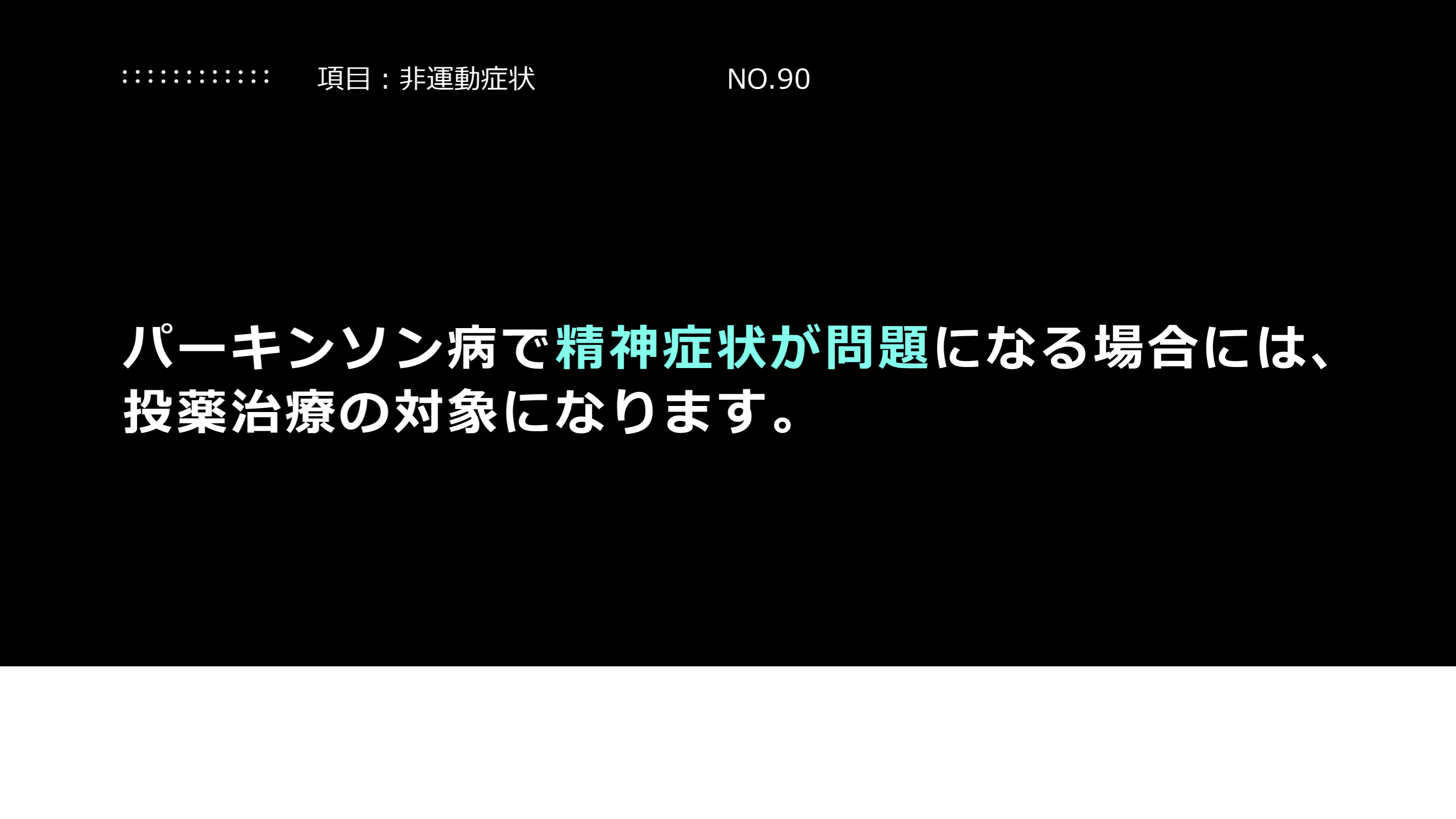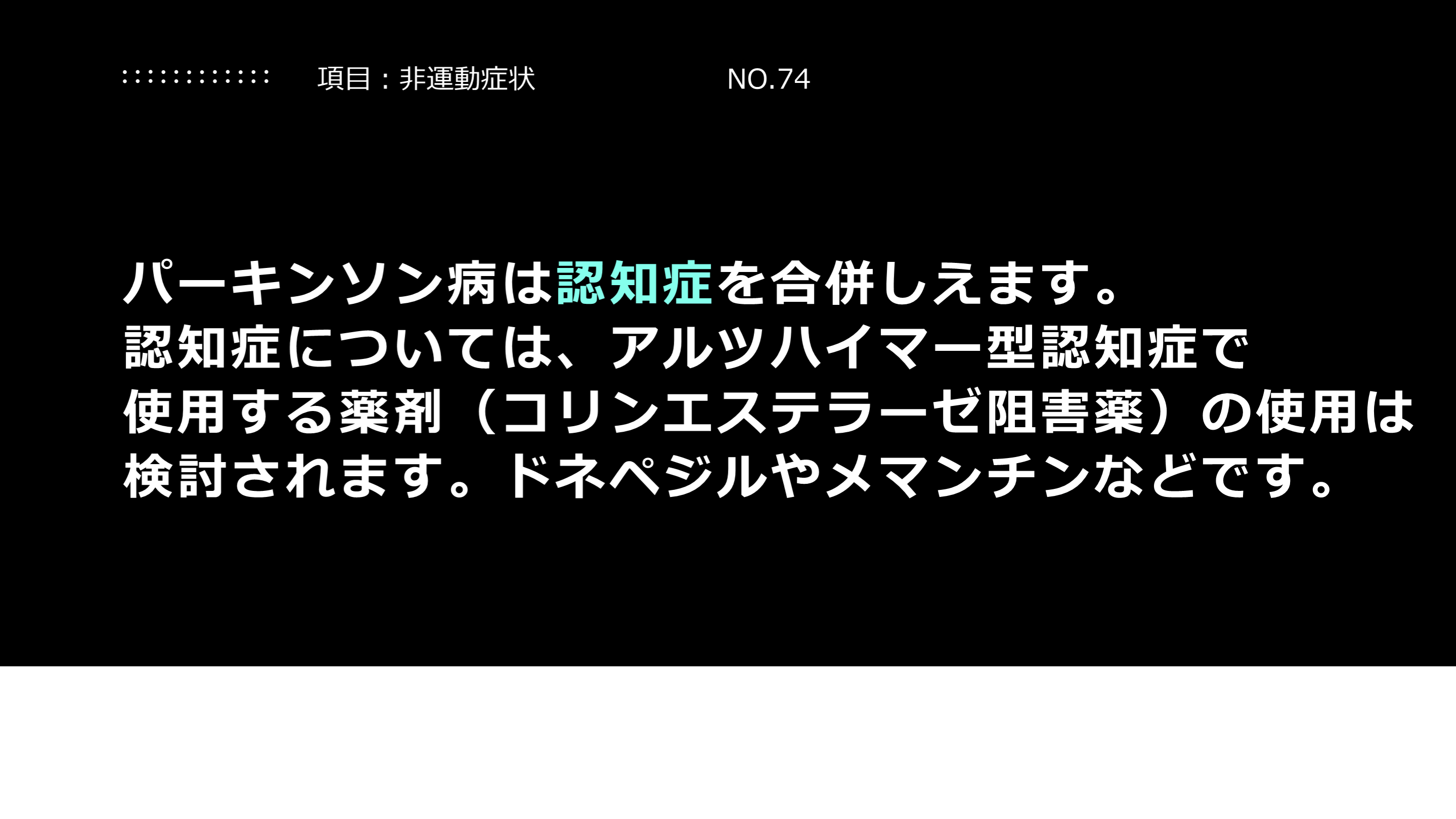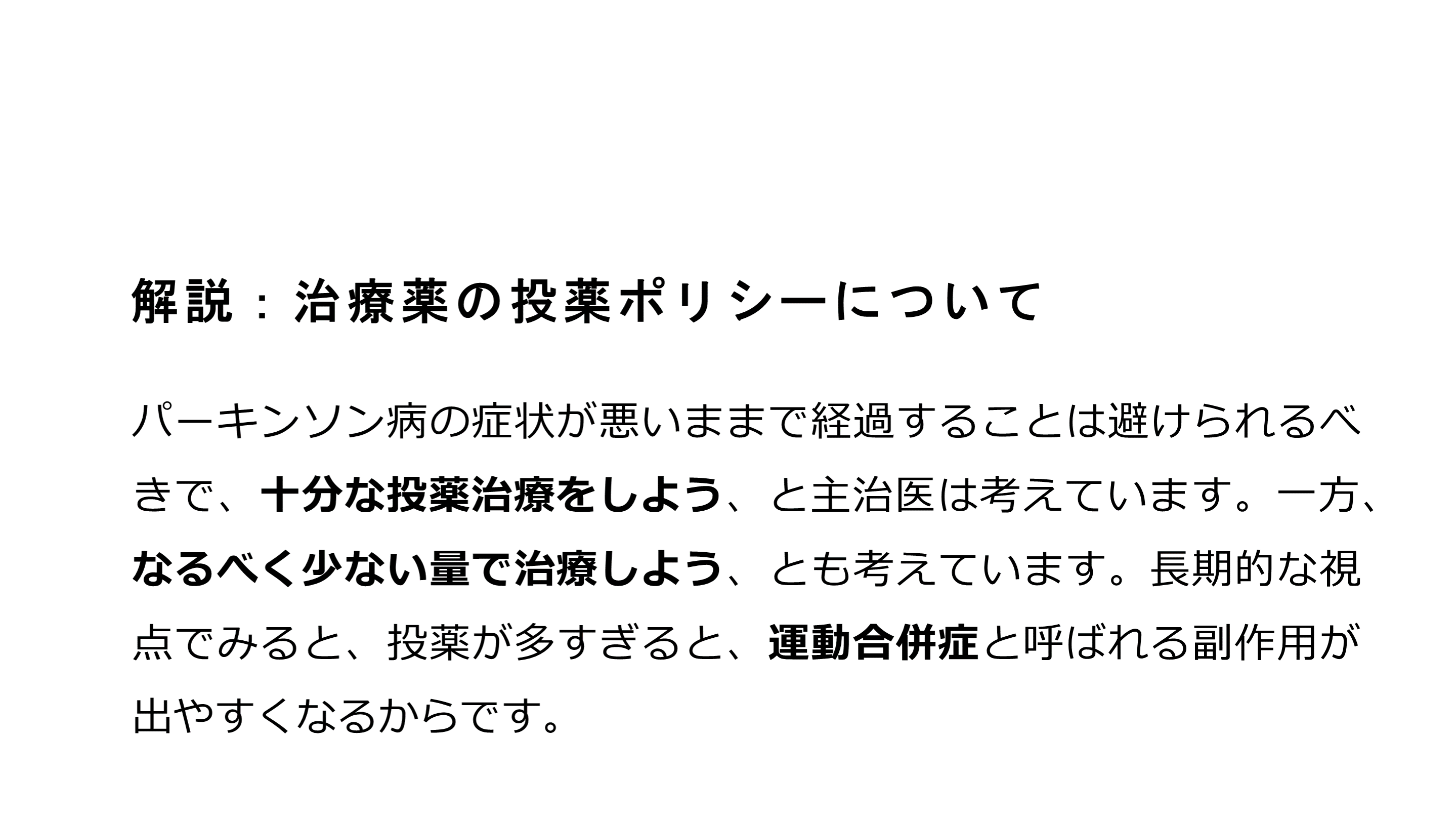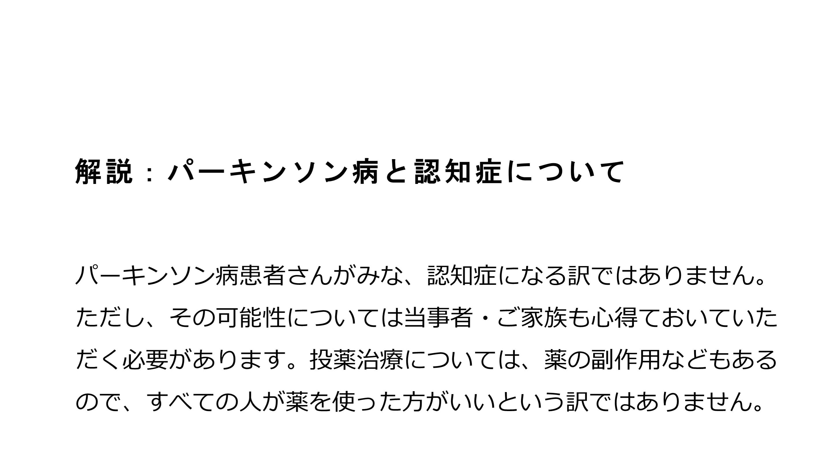 #48. 解説:パーキンソン病と認知症について パーキンソン病患者さんがみな、認知症になる訳ではありません。ただし、その可能性については当事者・ご家族も心得ておいていただく必要があります。投薬治療については、薬の副作用などもあるので、すべての人が薬を使った方がいいという訳ではありません。