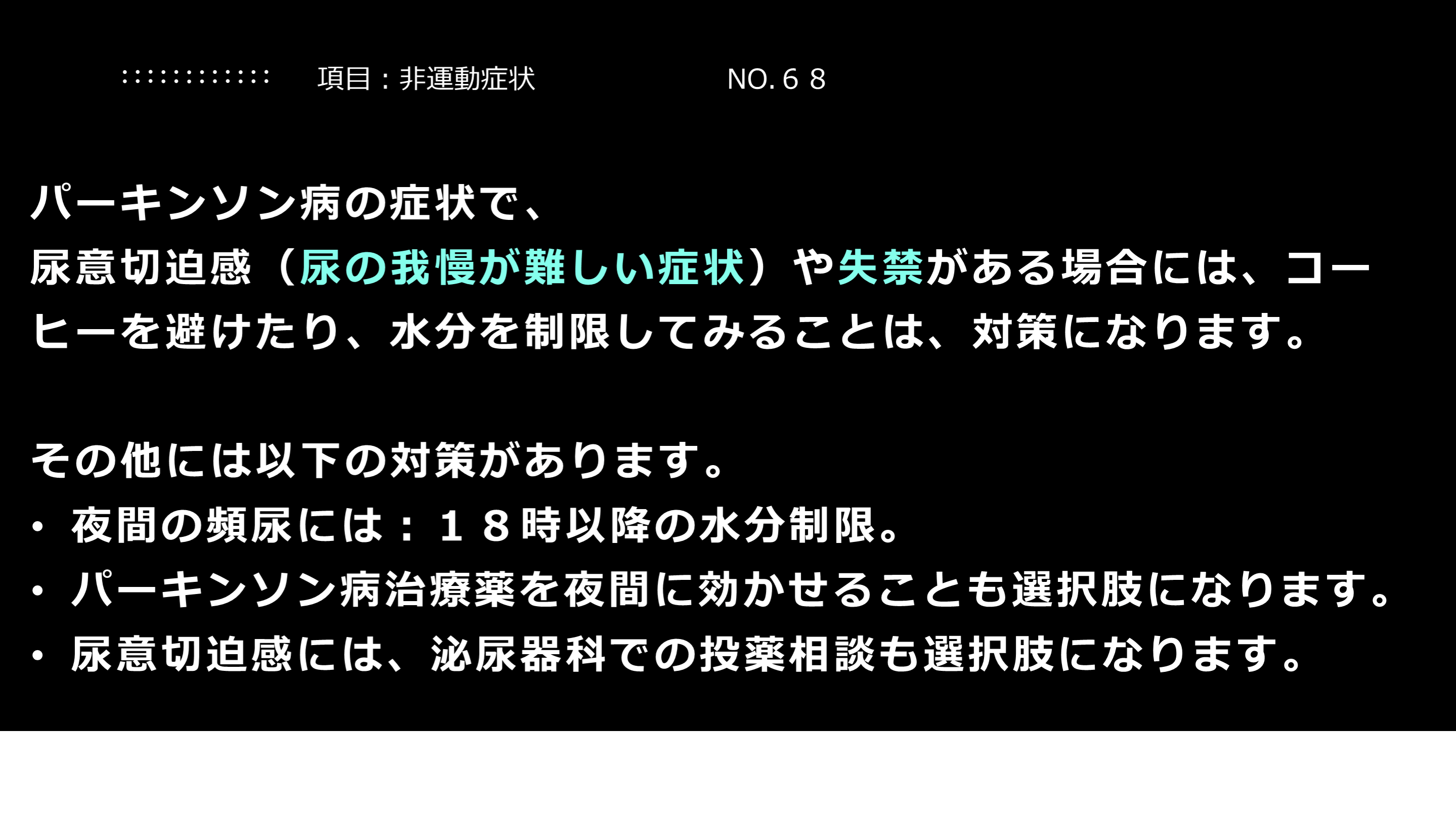 尿意切迫感には、泌尿器科での投薬相談も選択肢になります。 項目:非運動症状 NO.68