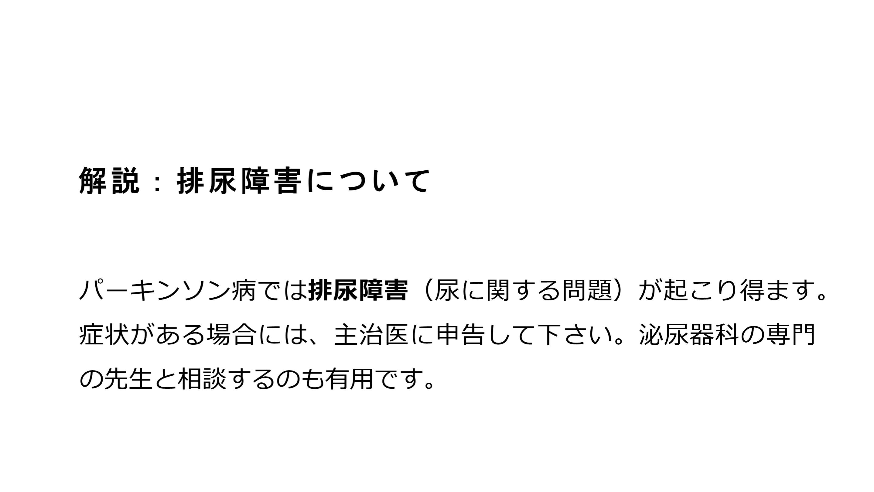#40. 解説:排尿障害について パーキンソン病では排尿障害(尿に関する問題)が起こり得ます。症状がある場合には、主治医に申告して下さい。泌尿器科の専門の先生と相談するのも有用です。