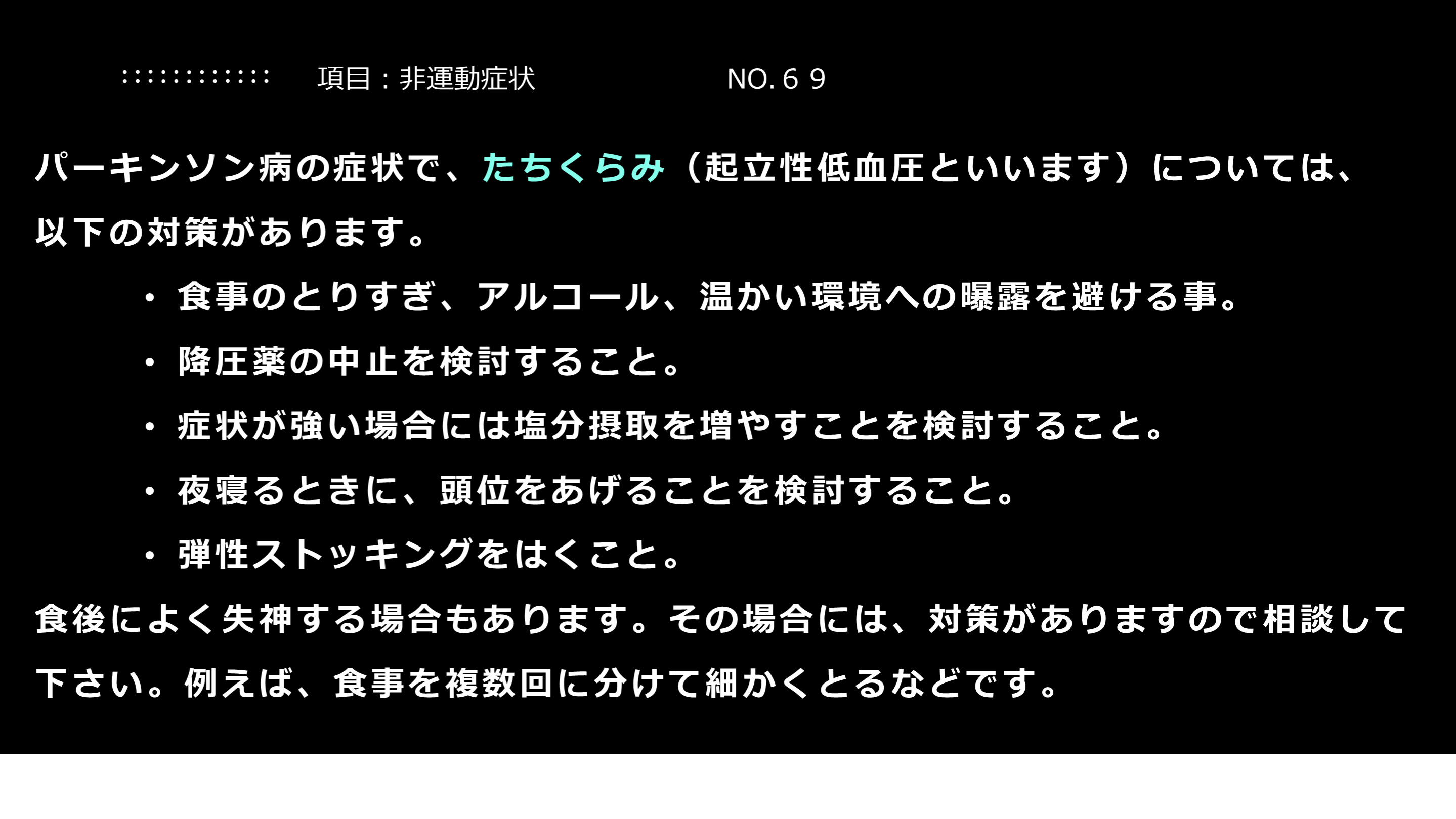 食後によく失神する場合もあります。その場合には、対策がありますので相談して下さい。例えば、食事を複数回に分けて細かくとるなどです。 項目:非運動症状 NO.69