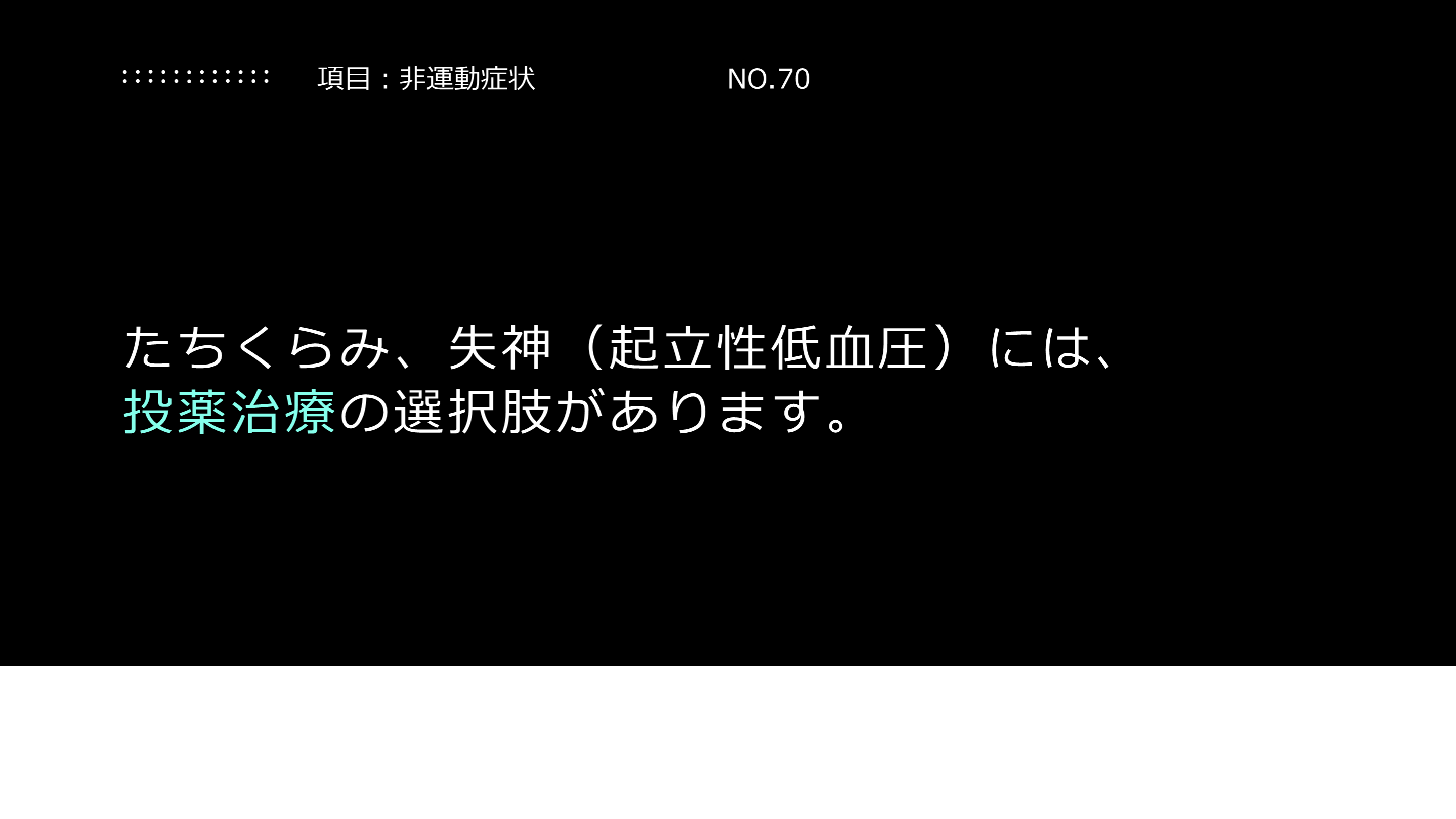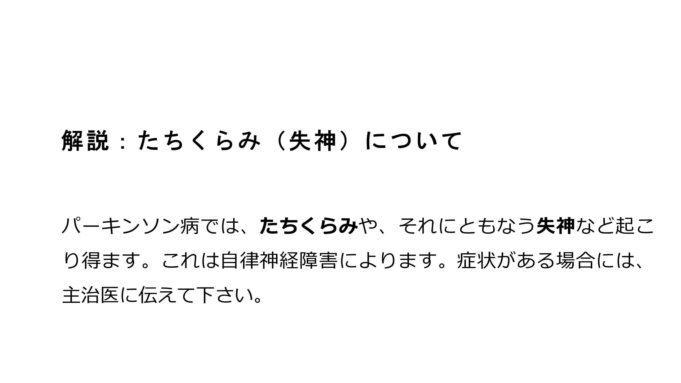 #42. 解説:たちくらみ(失神)について パーキンソン病では、たちくらみや、それにともなう失神など起こり得ます。これは自律神経障害によります。症状がある場合には、主治医に伝えて下さい。