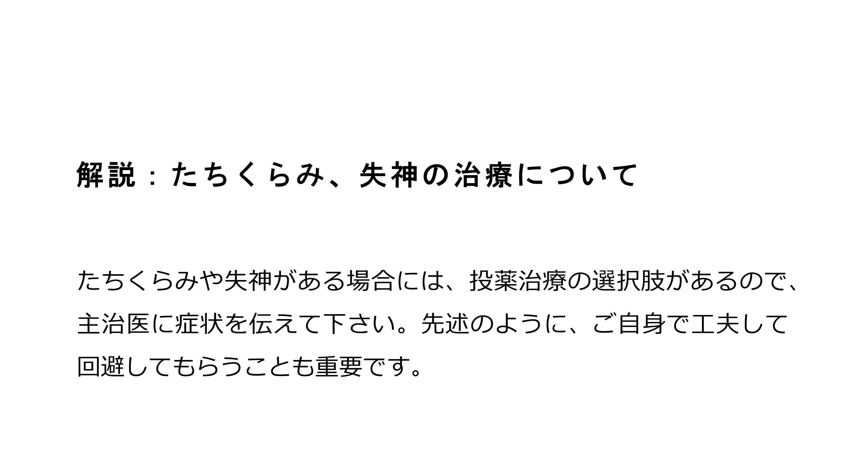 #44. 解説:たちくらみ、失神の治療について たちくらみや失神がある場合には、投薬治療の選択肢があるので、主治医に症状を伝えて下さい。先述のように、ご自身で工夫して回避してもらうことも重要です。