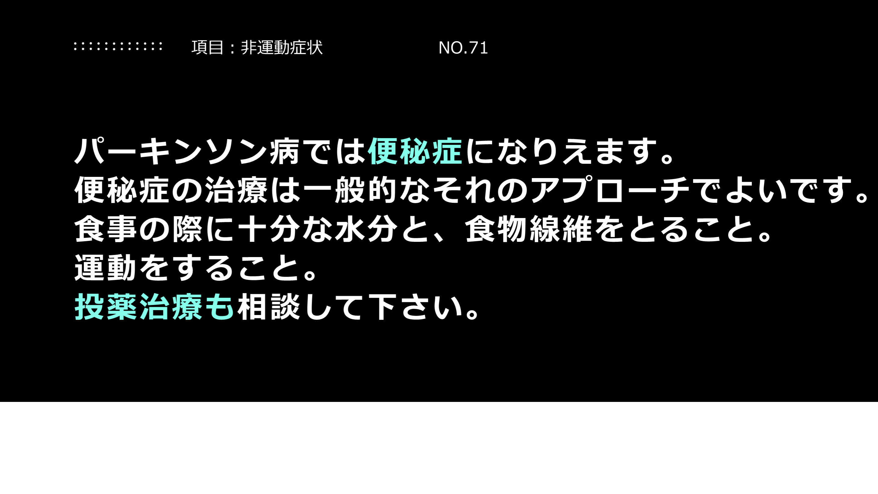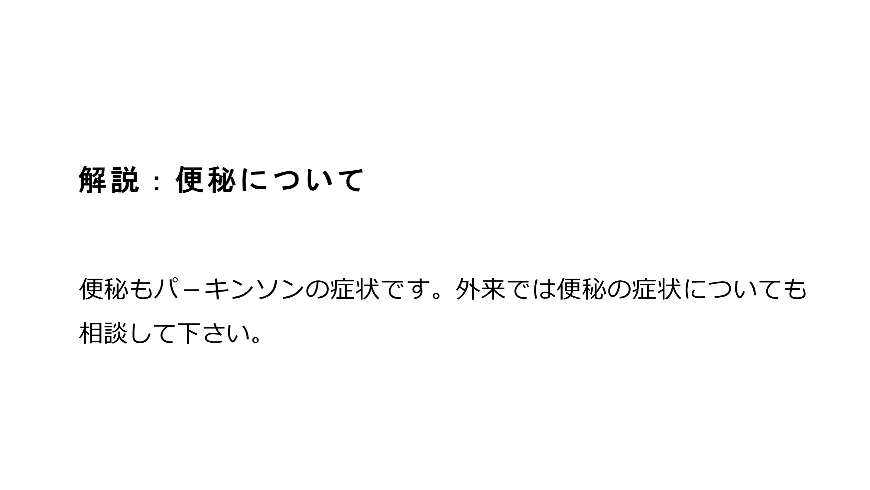 #46. 解説:便秘について 便秘もパ-キンソンの症状です。外来では便秘の症状についても相談して下さい。