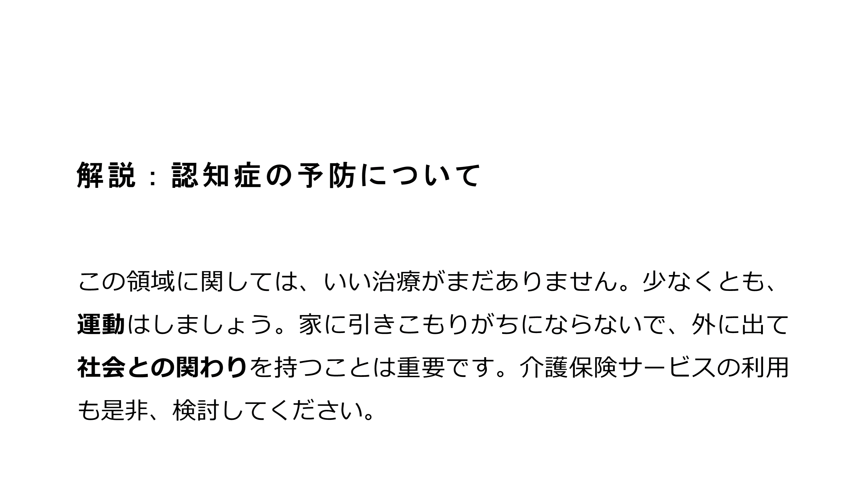#50. 解説:認知症の予防について この領域に関しては、いい治療がまだありません。少なくとも、運動はしましょう。家に引きこもりがちにならないで、外に出て社会との関わりを持つことは重要です。介護保険サービスの利用も是非、検討してください。