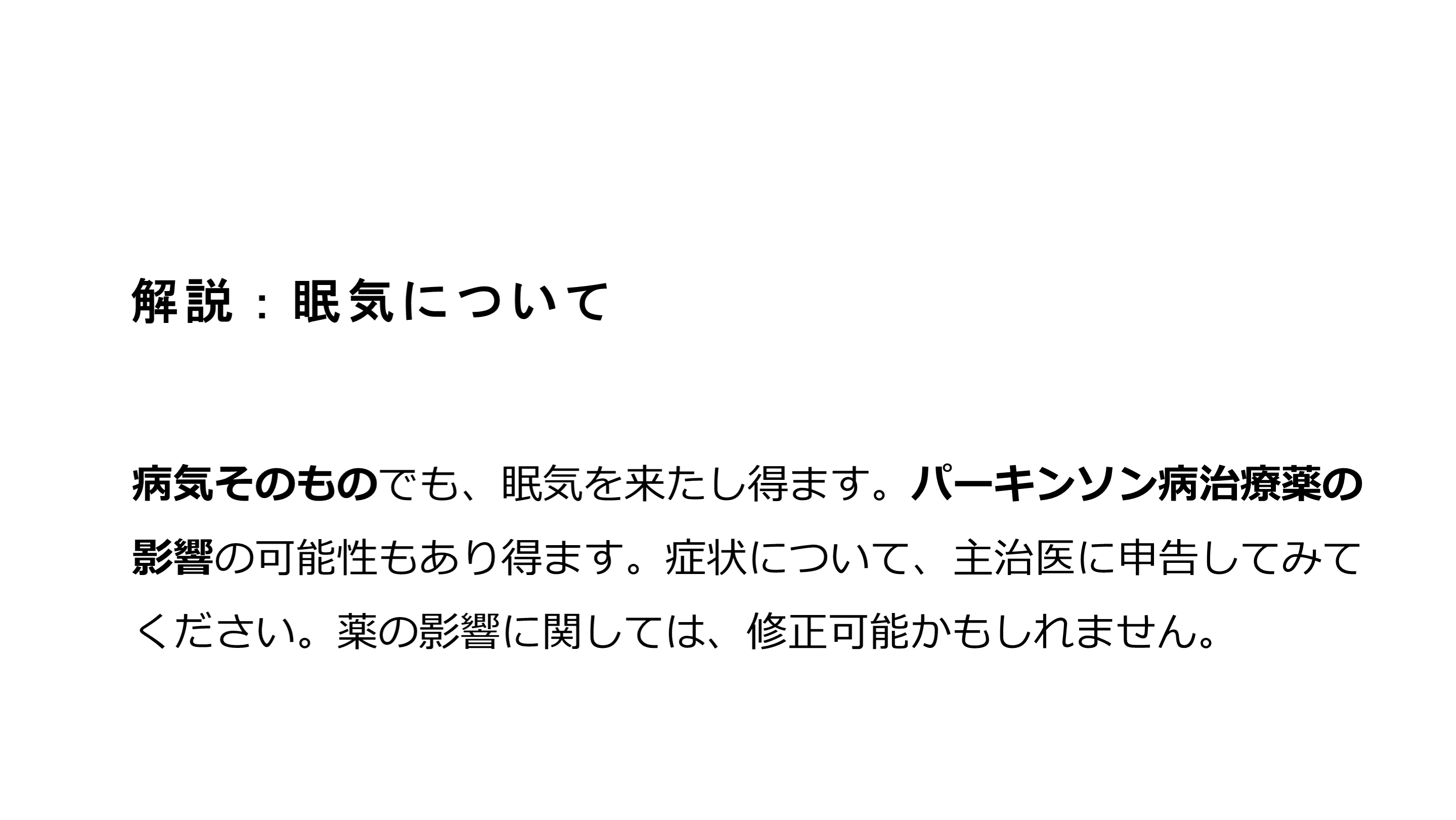 #52. 解説:眠気について 病気そのものでも、眠気を来たし得ます。パーキンソン病治療薬の影響の可能性もあり得ます。症状について、主治医に申告してみてください。薬の影響に関しては、修正可能かもしれません。
