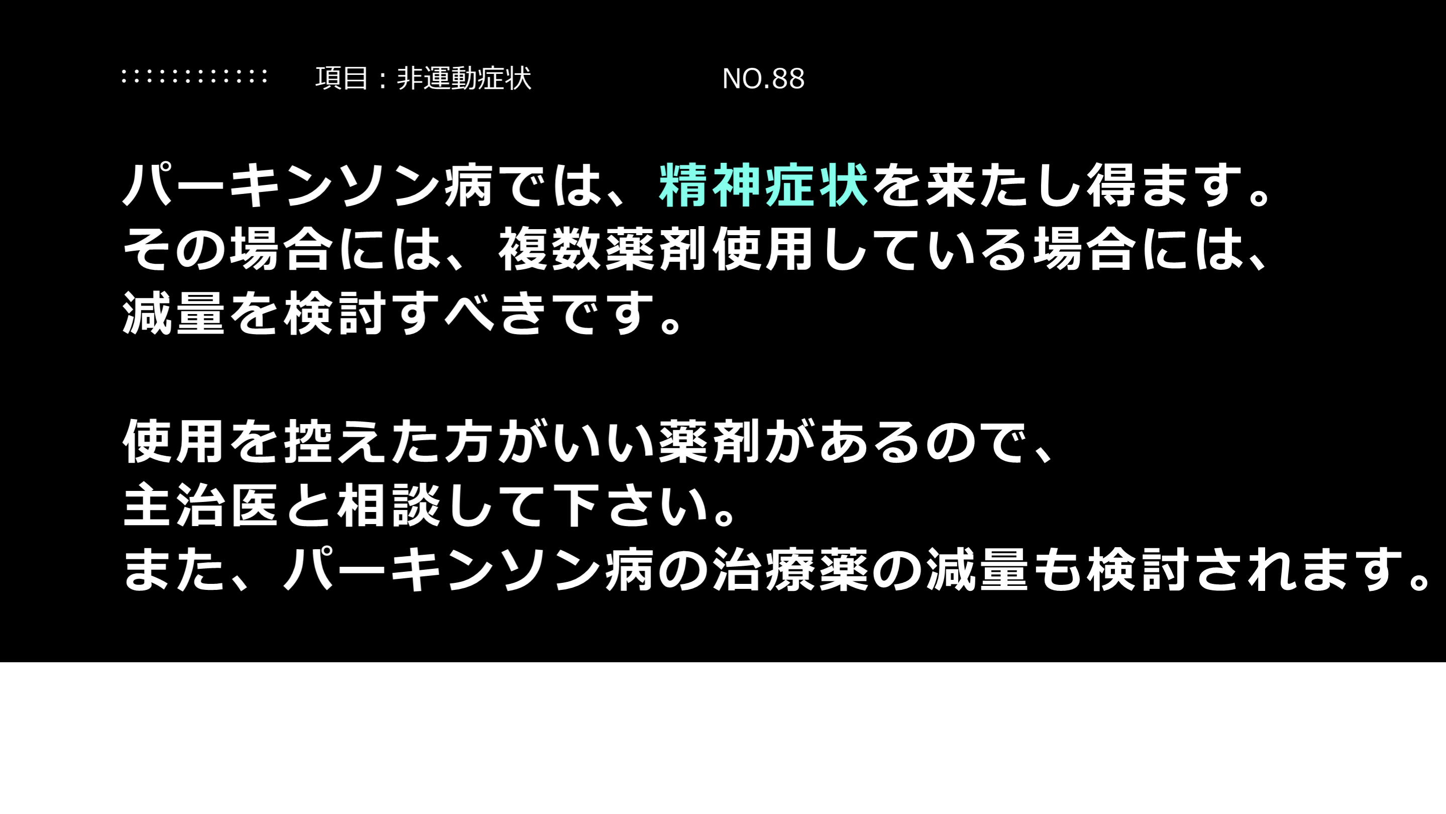 また、パーキンソン病の治療薬の減量も検討されます。 項目:非運動症状 NO.88