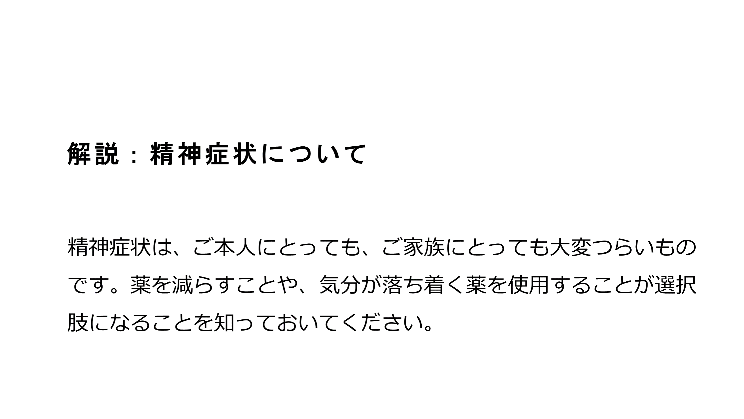 #56. 解説:精神症状について 精神症状は、ご本人にとっても、ご家族にとっても大変つらいものです。薬を減らすことや、気分が落ち着く薬を使用することが選択肢になることを知っておいてください。
