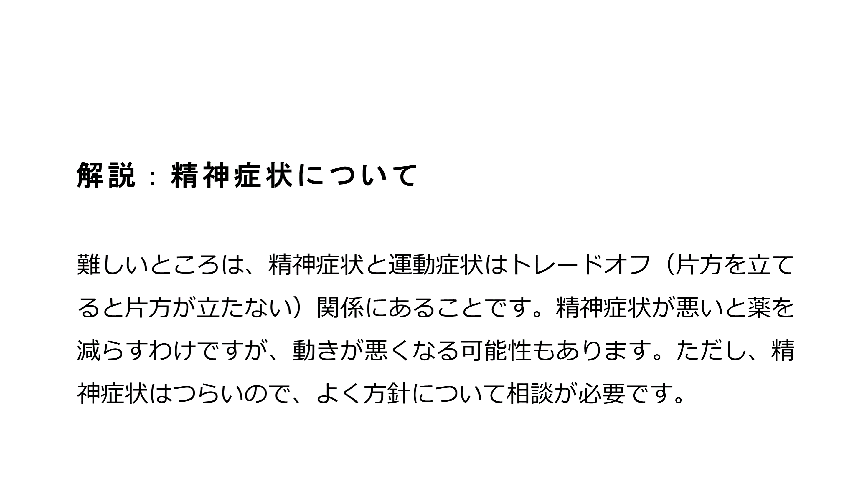#58. 解説:精神症状について 難しいところは、精神症状と運動症状はトレードオフ(片方を立てると片方が立たない)関係にあることです。精神症状が悪いと薬を減らすわけですが、動きが悪くなる可能性もあります。ただし、精神症状はつらいので、よく方針について相談が必要です。