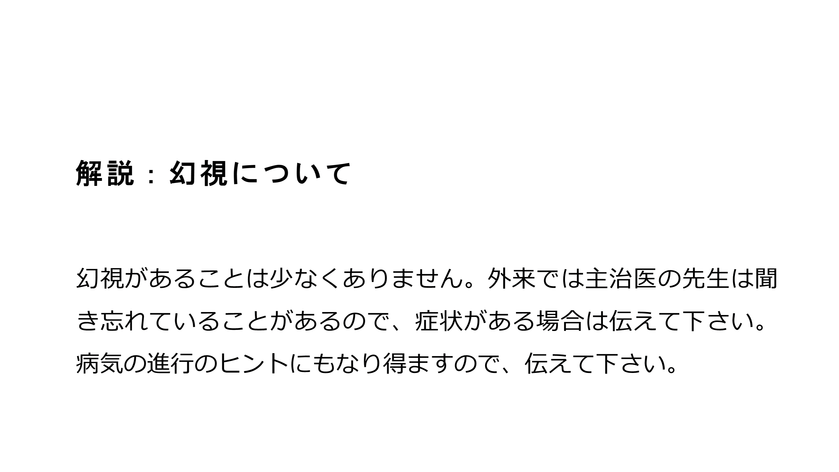 #60. 解説:幻視について 幻視があることは少なくありません。外来では主治医の先生は聞き忘れていることがあるので、症状がある場合は伝えて下さい。病気の進行のヒントにもなり得ますので、伝えて下さい。