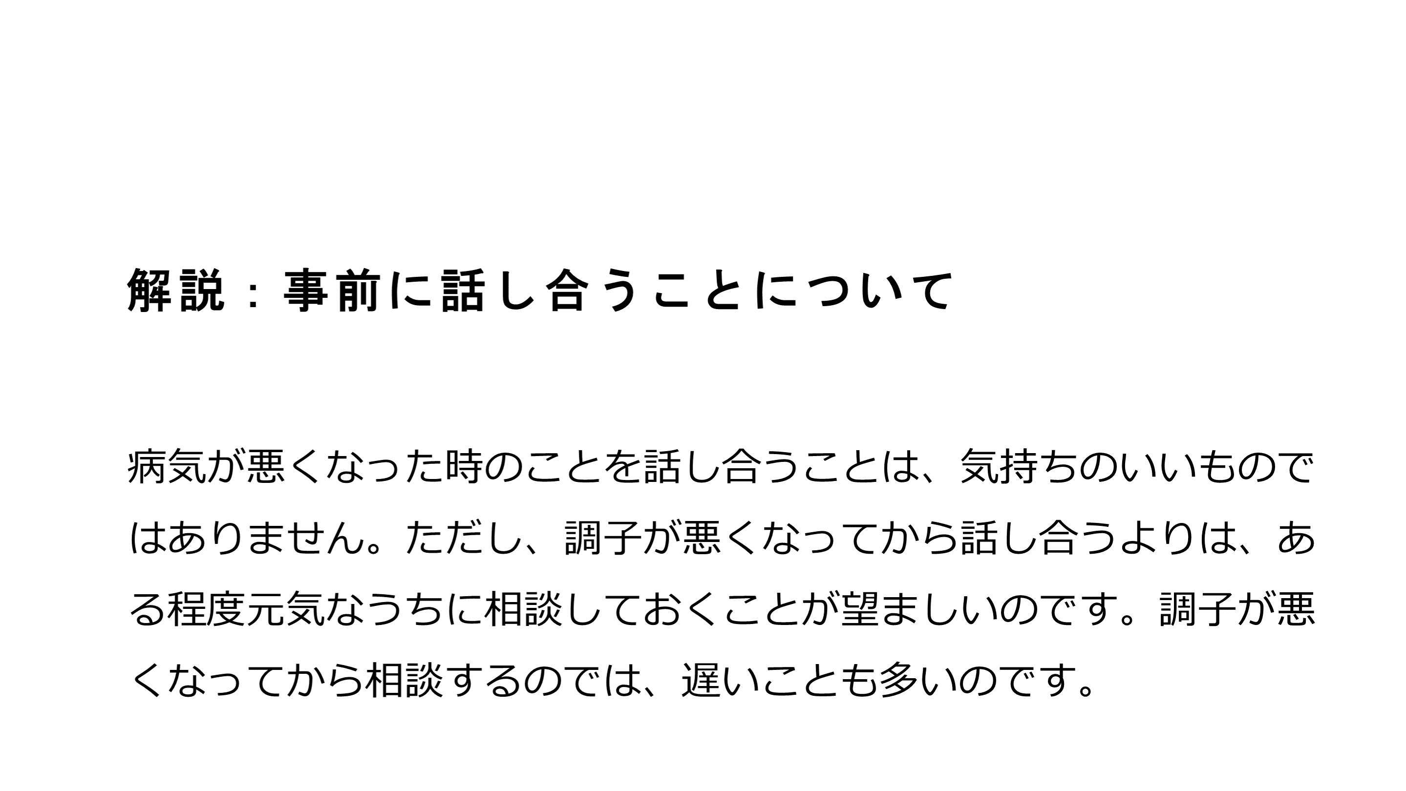 病気が悪くなった時のことも事前に相談すること。 まとめ:特に大切な内容について最後に記載します。