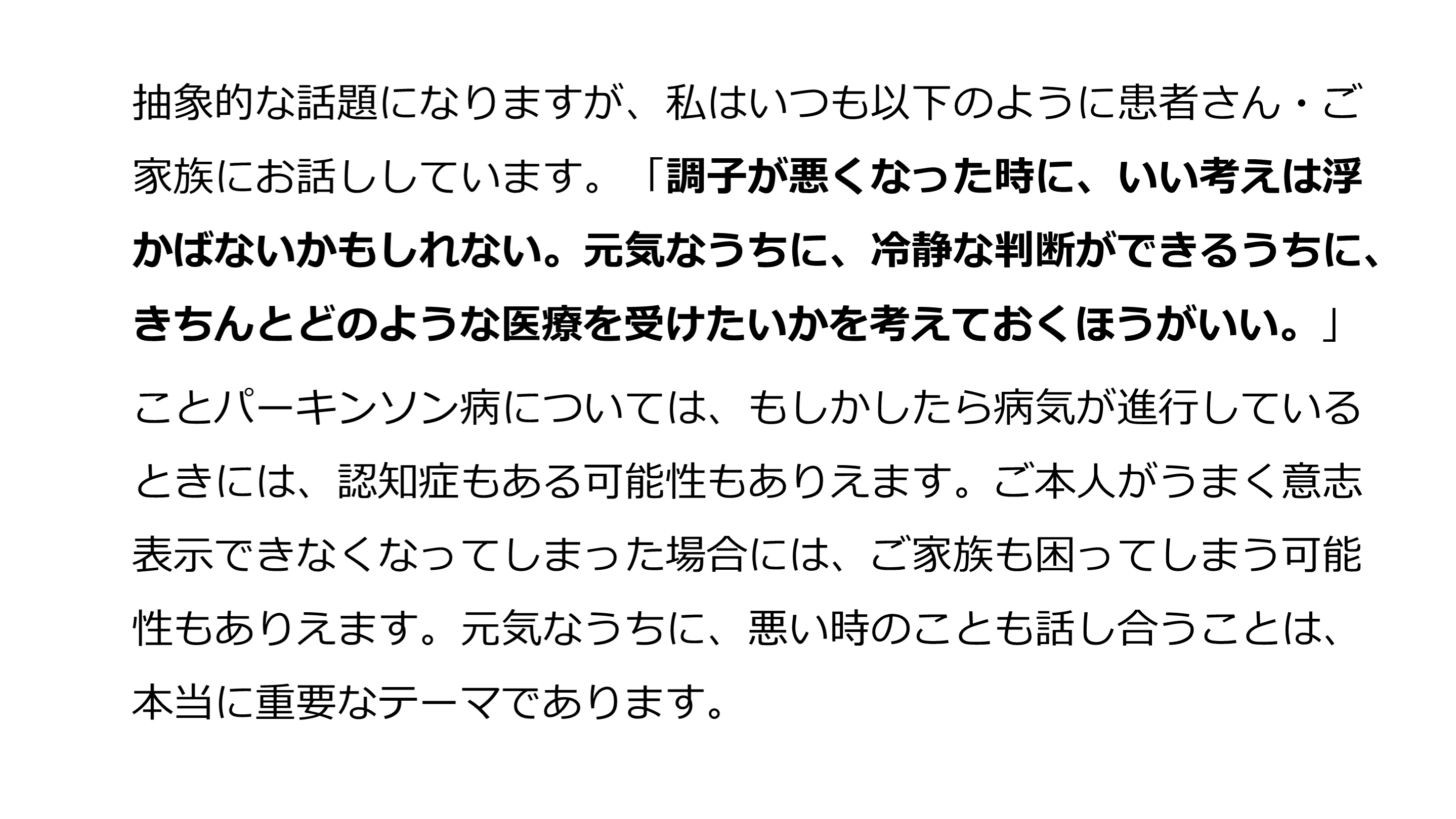 ことパーキンソン病については、もしかしたら病気が進行しているときには、認知症もある可能性もありえます。ご本人がうまく意志表示できなくなってしまった場合には、ご家族も困ってしまう可能性もありえます。元気なうちに、悪い時のことも話し合うことは、本当に重要なテーマであります。