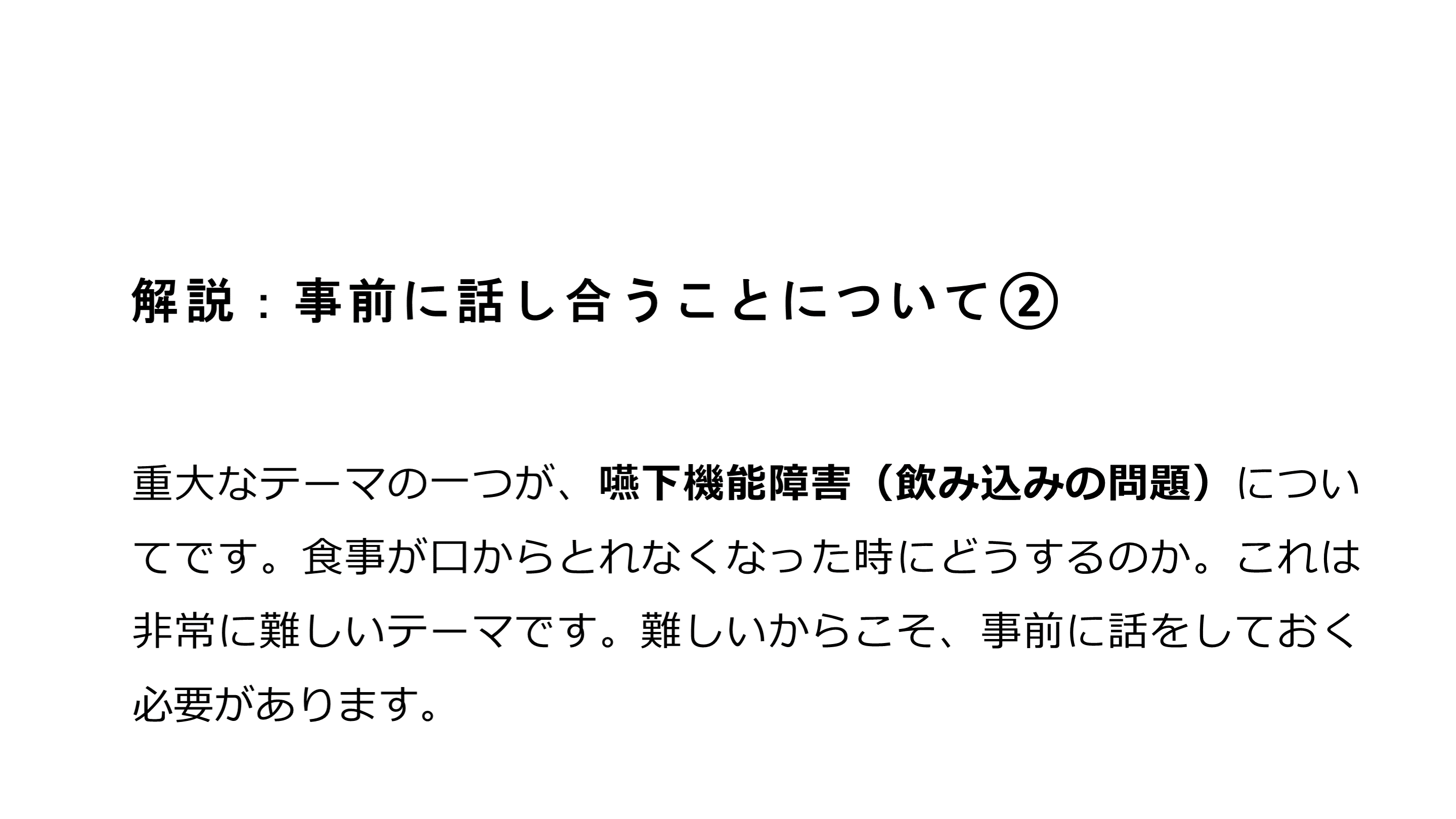 #65. 解説:事前に話し合うことについて② 重大なテーマの一つが、嚥下機能障害(飲み込みの問題)についてです。食事が口からとれなくなった時にどうするのか。これは非常に難しいテーマです。難しいからこそ、事前に話をしておく必要があります。