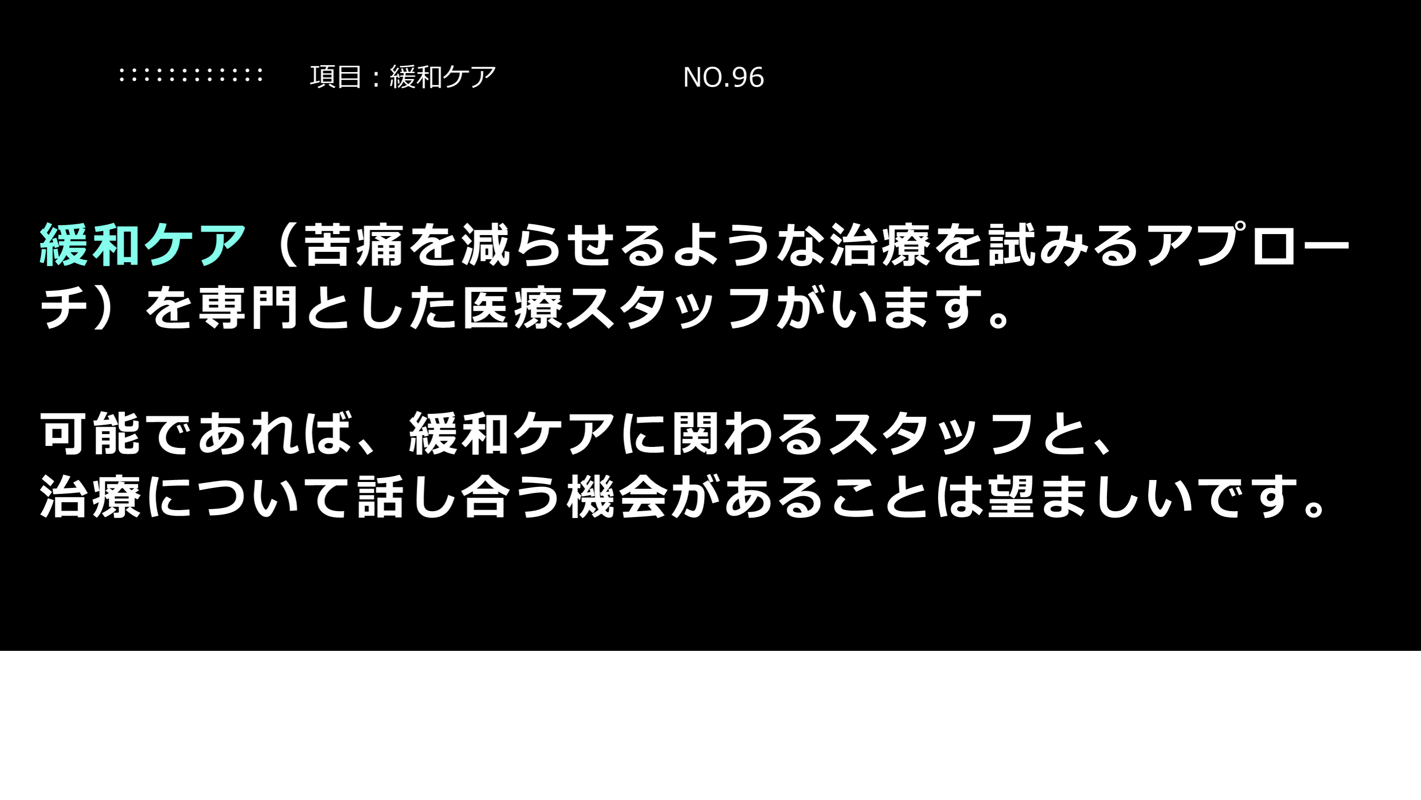 治療について話し合う機会があることは望ましいです。 項目:緩和ケア NO.96